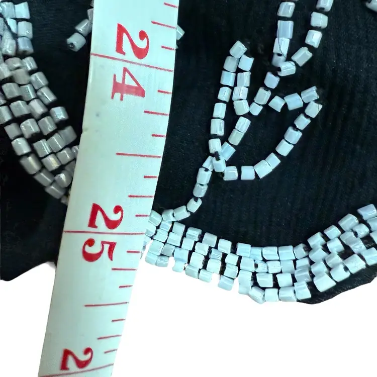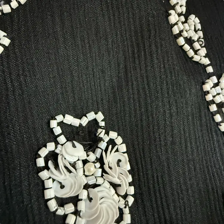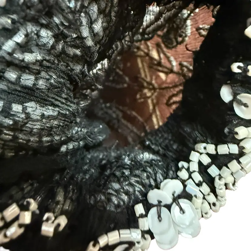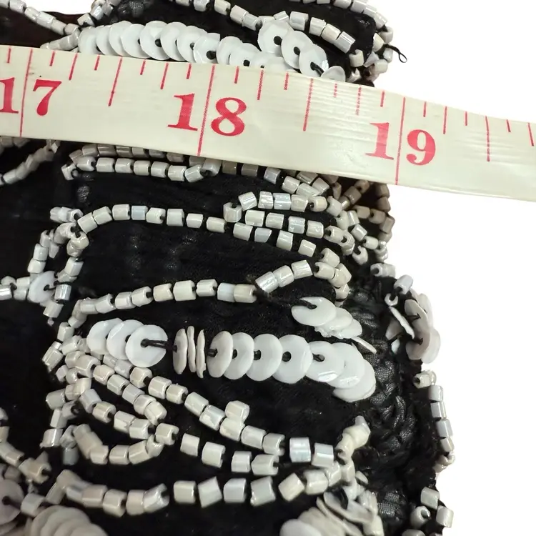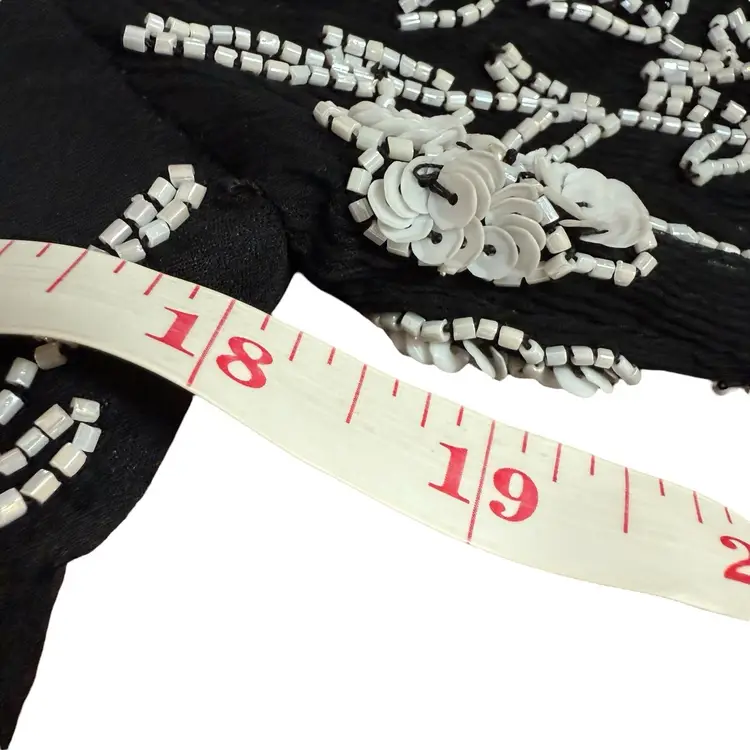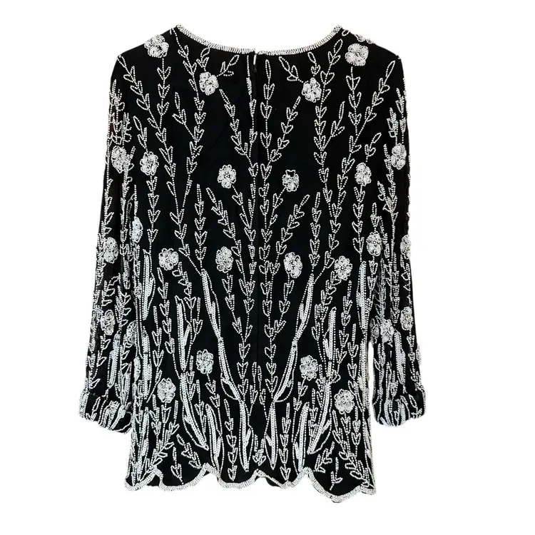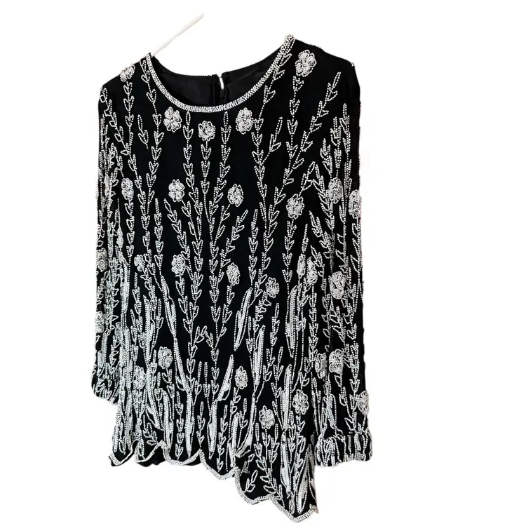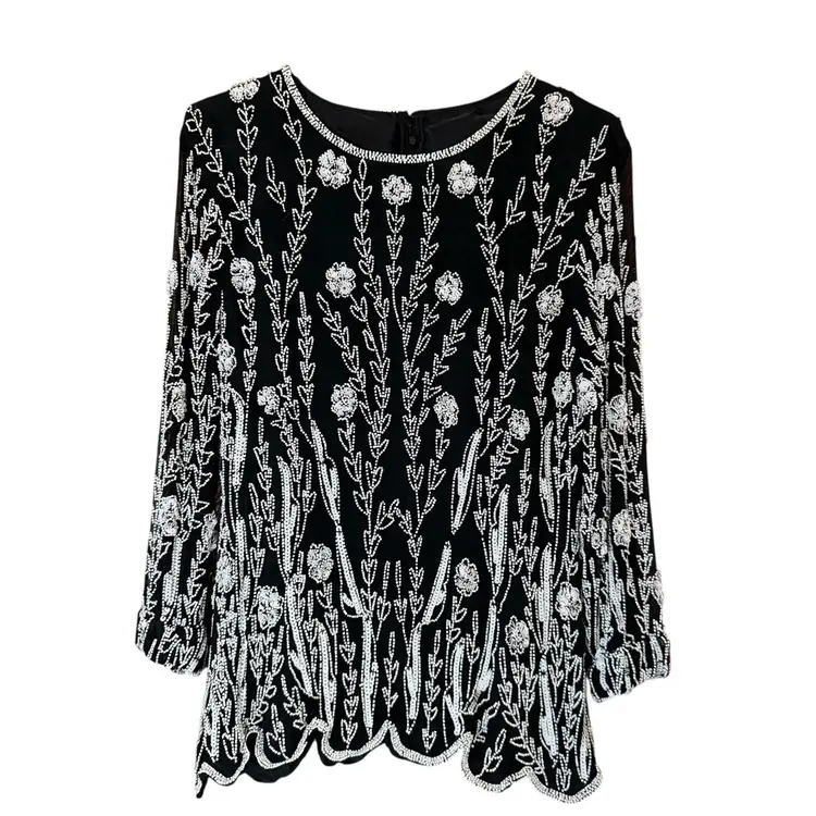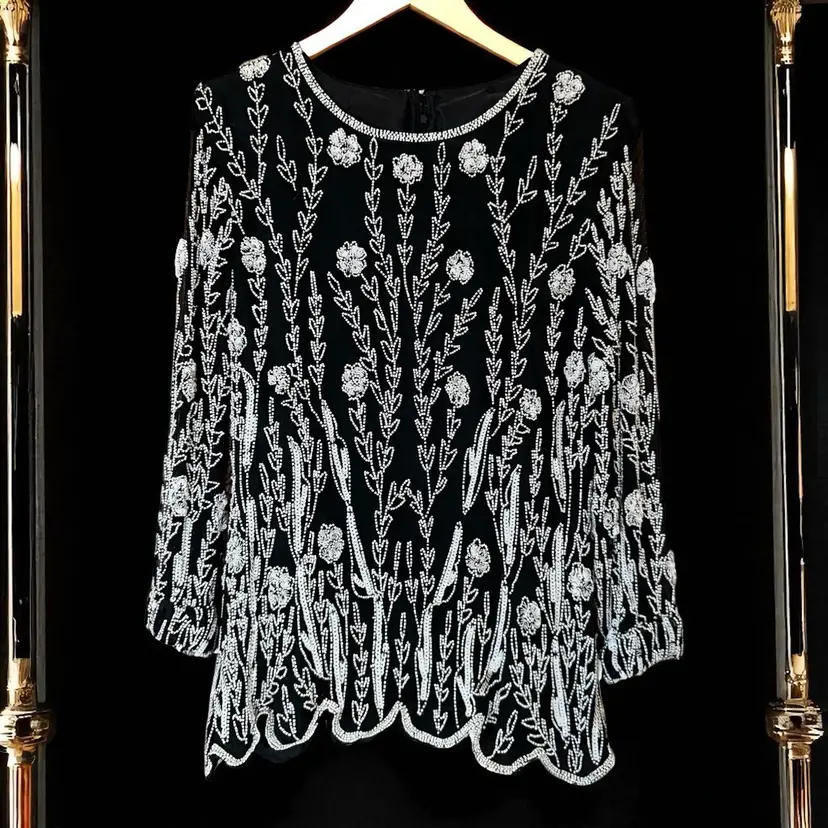 This vintage black and white beaded sequin top blouse is perfect for formal eveningwear. With its heavy embellishments, sheer long sleeves, scalloped hem, and 1980s style, this blouse exudes elegance and sophistication. The black color and shiny sequin material add a touch of glamour, making this top a standout addition to any wardrobe.
