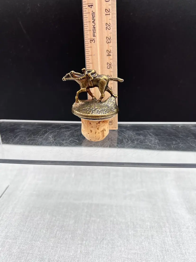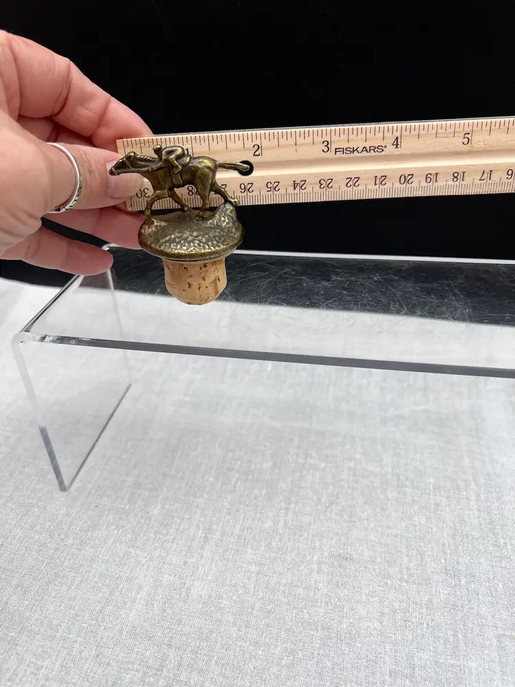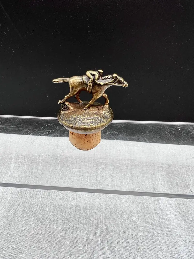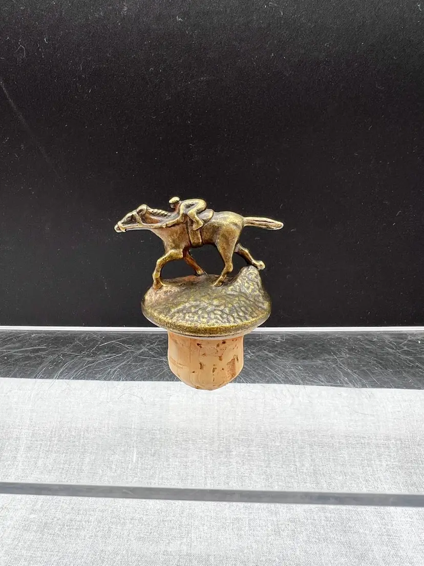 Cute vintage Blanton's bourbon/whiskey collectible cork bottle stopper with brass racehorse and jockey on top.