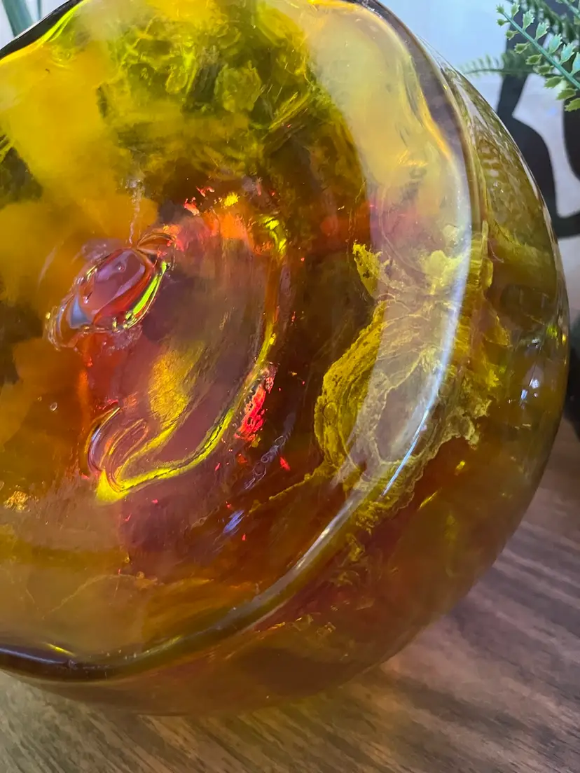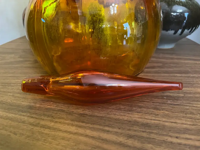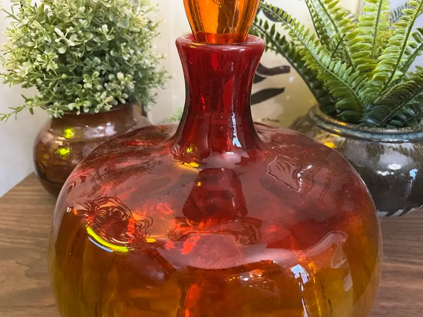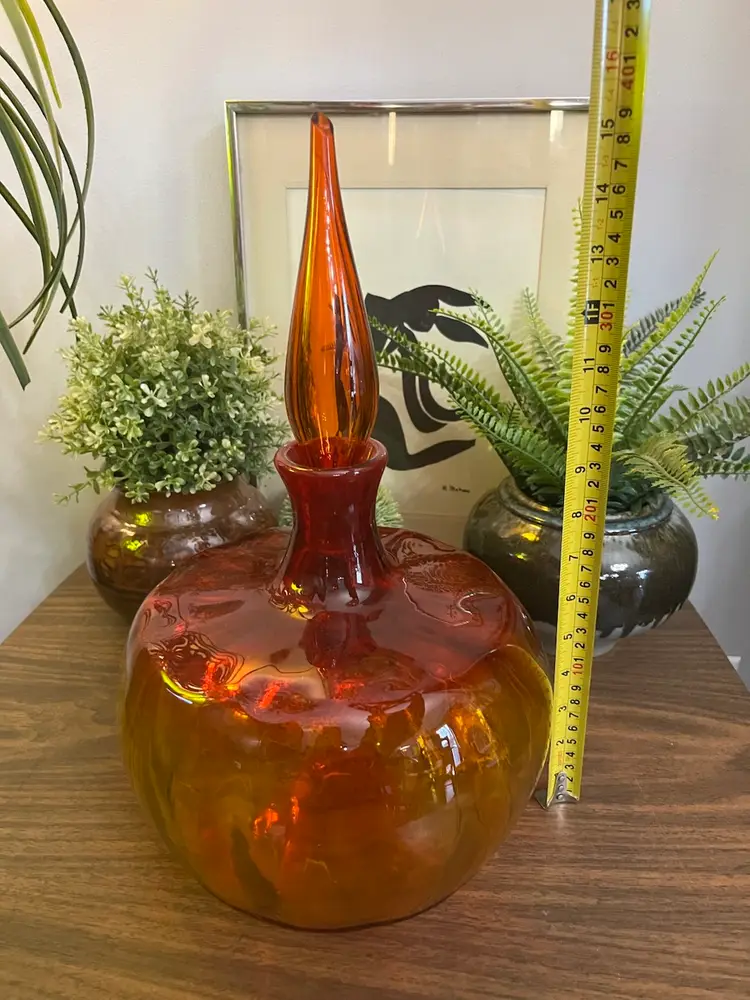 The stopper is broken on the top tip and has been shaved down. There are still some spots near the tip that aren’t perfectly shaved down. Some small chips on the bottom of the stopper that fits into the decanter. The decanter is also heavily water damaged. There are some bubbles from production throughout the piece as well. Please closely inspect all photos for details. Measures approximately 15.5” tall and 9.5” wide. Message me with any questions.