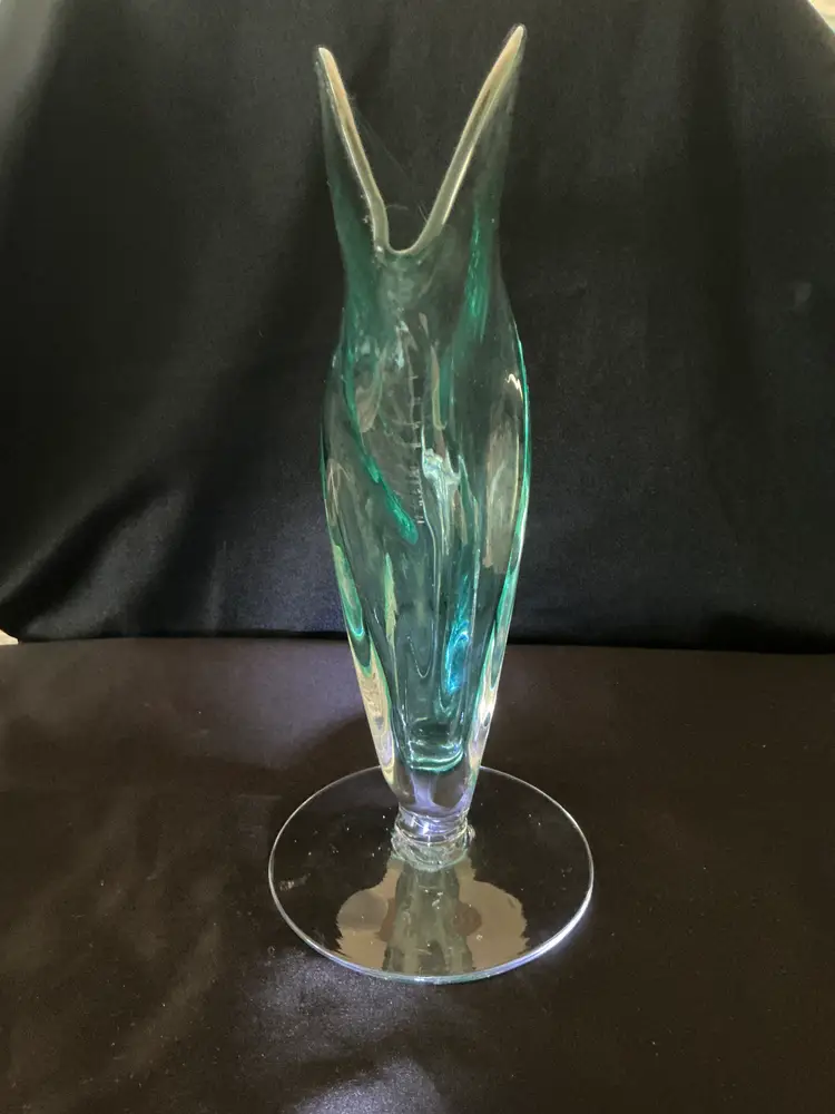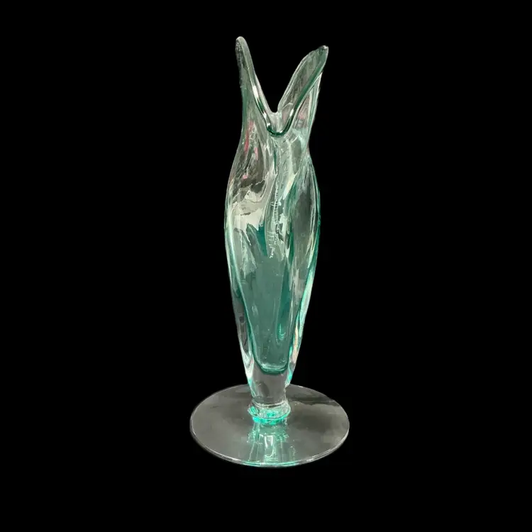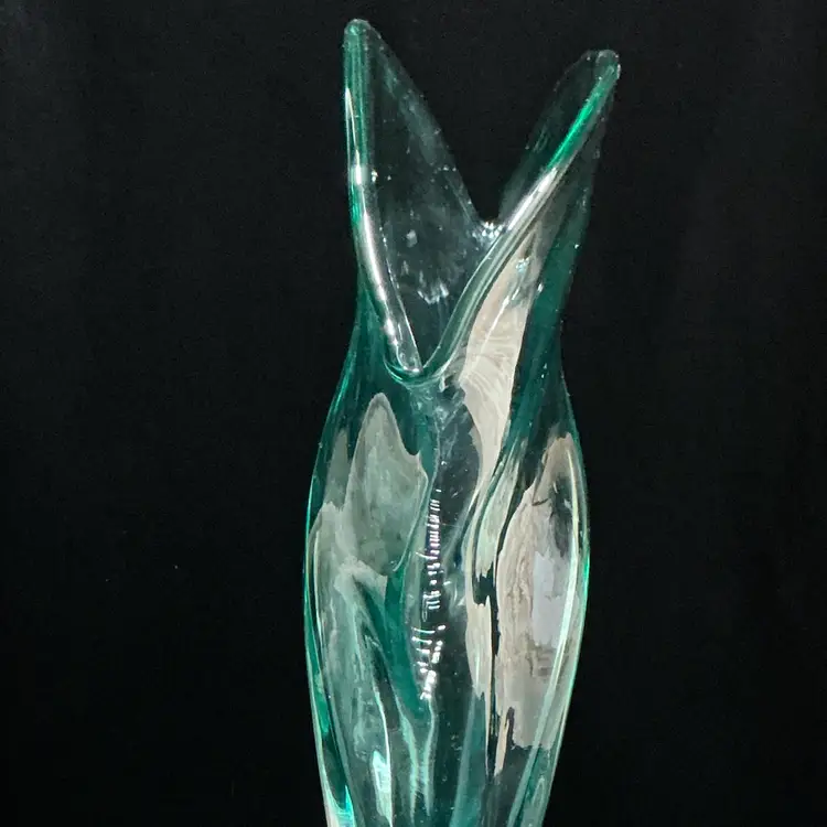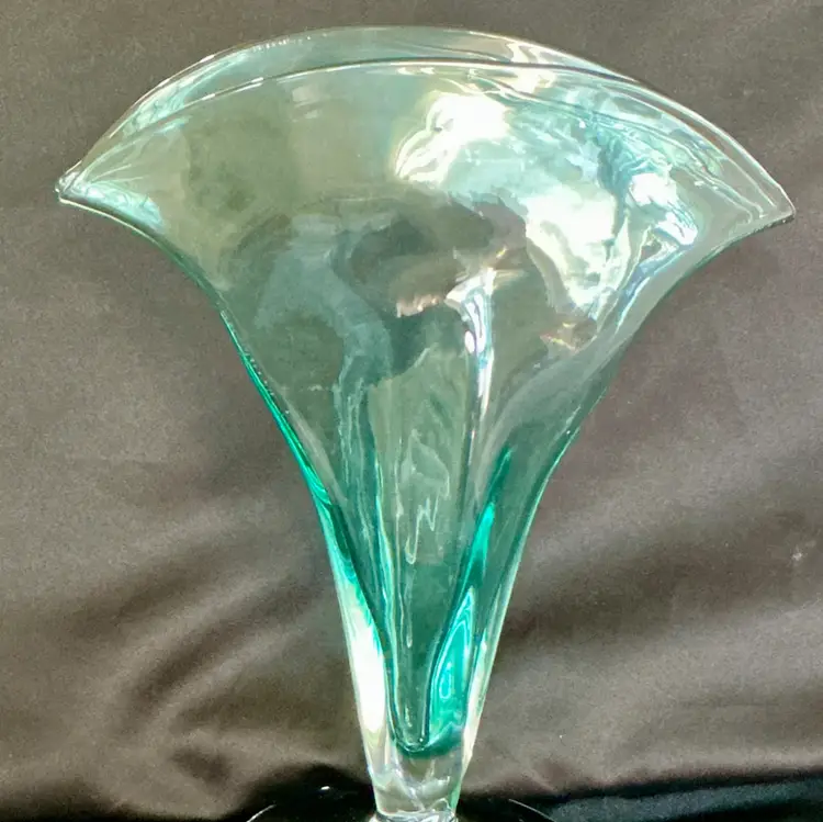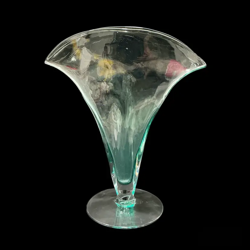• Maker: Blenko Glass Company • Model: #872 Fan Vase • Color: Seafoam • Approximate size: 12" high × 12" wide × 4.5" deep • Clear pedestal base • Hand blown art glass Condition: Excellent vintage condition. No chips or cracks.