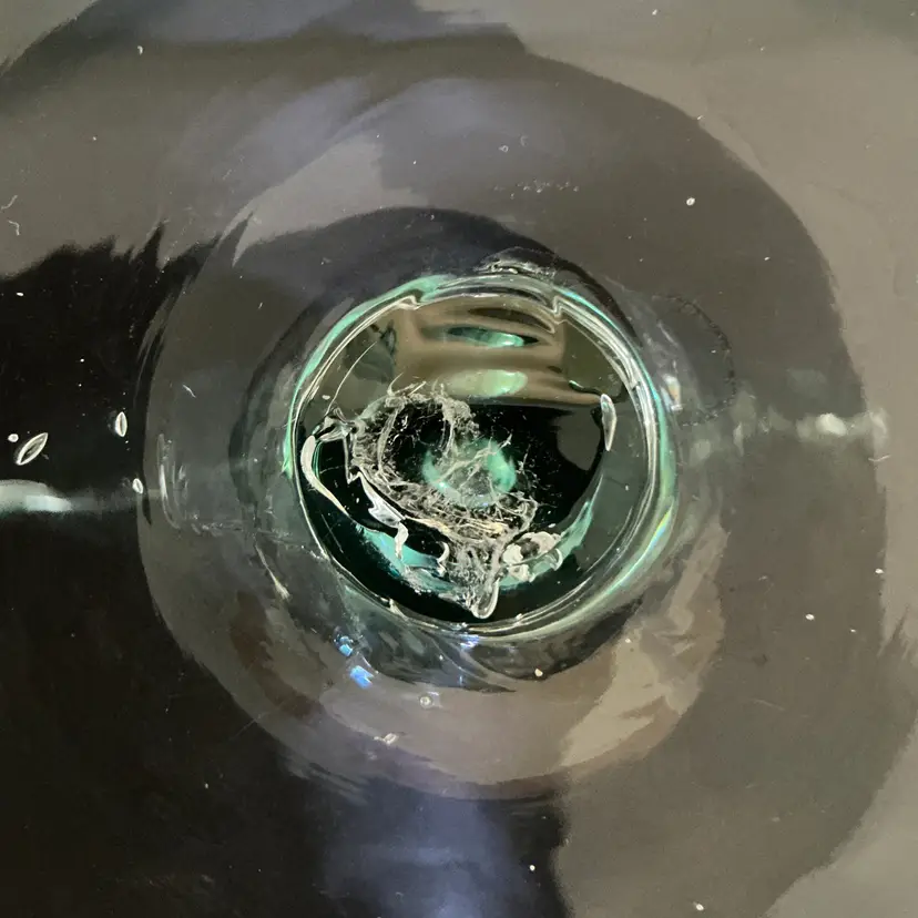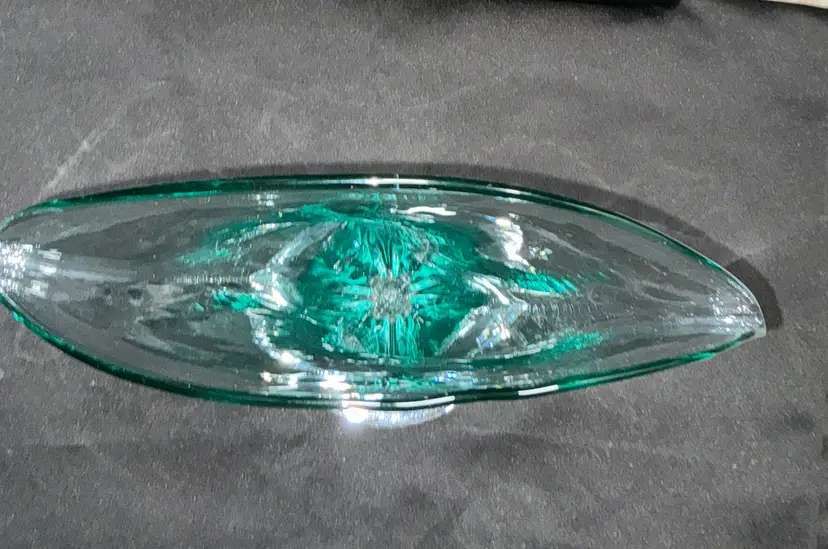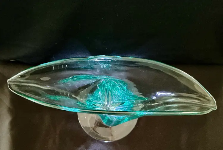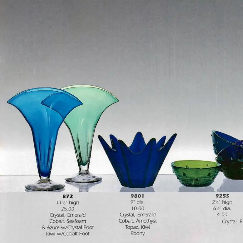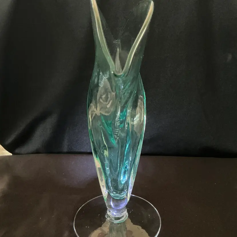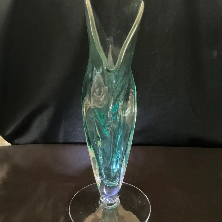 • Maker: Blenko Glass Company • Model: #872 Fan Vase • Color: Seafoam • Approximate size: 12" high × 12" wide × 4.5" deep • Clear pedestal base • Hand blown art glass Condition: Excellent vintage condition. No chips or cracks.