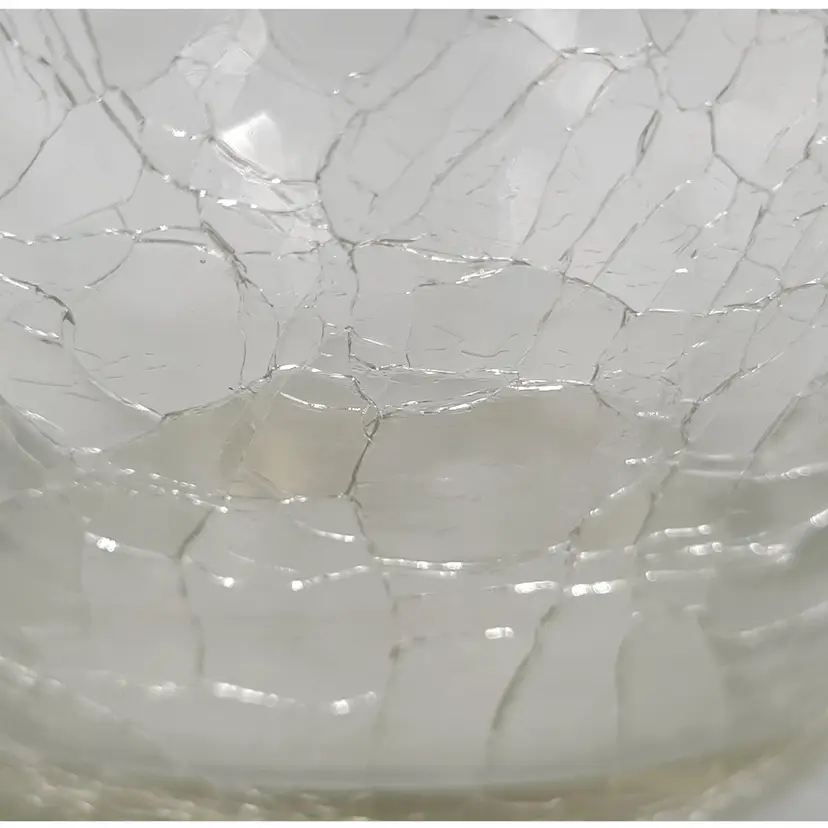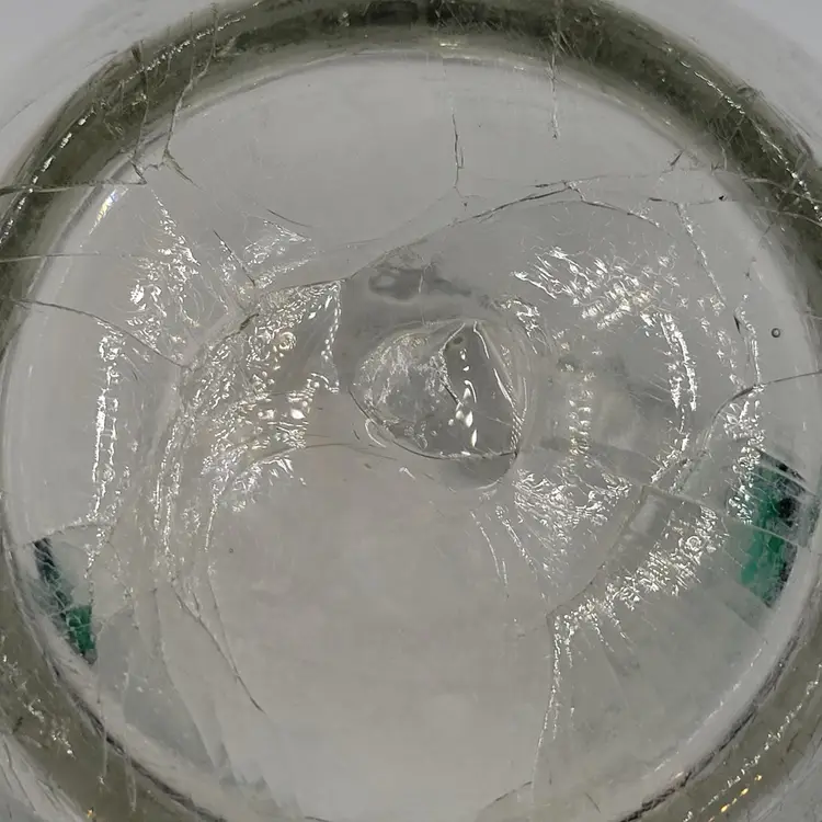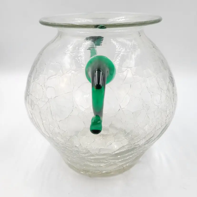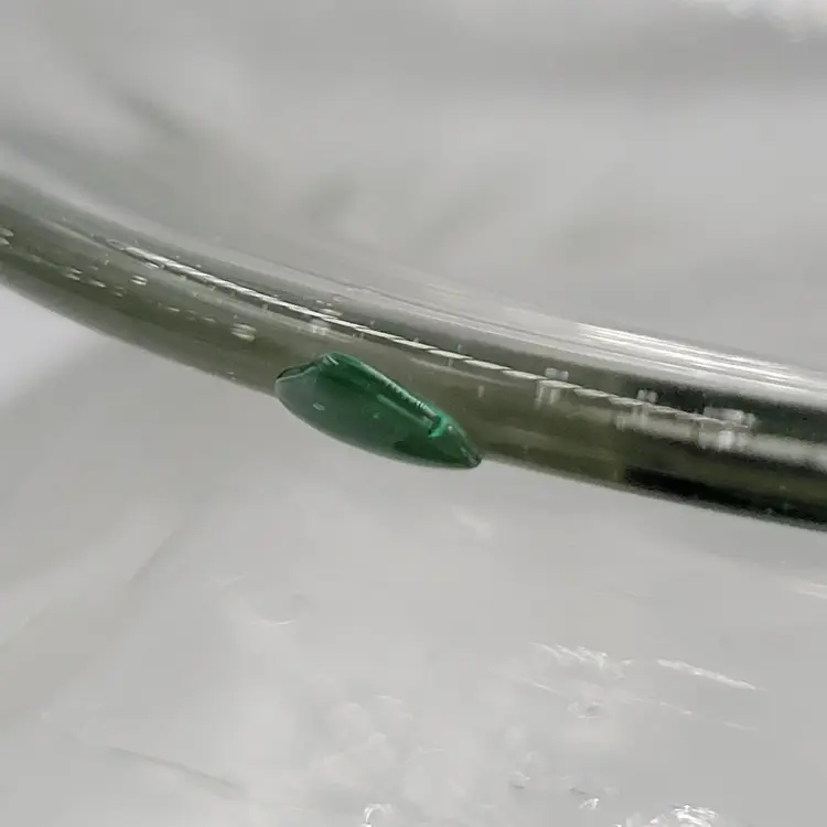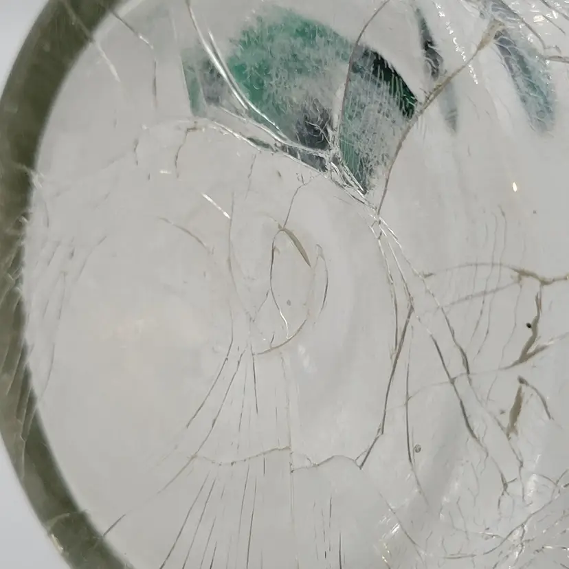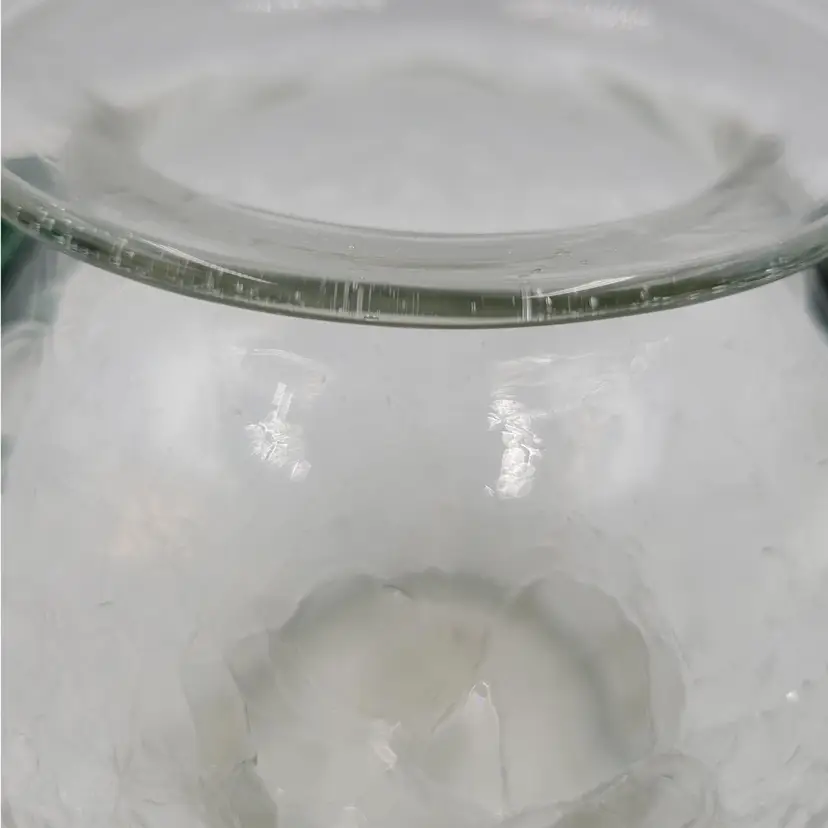 There are no chips or cracks. There is a piece of emerald glass on the rim (see photos). There is some fogginess in the bottom of this piece possibly sickness or lime scale from water use (see photos).