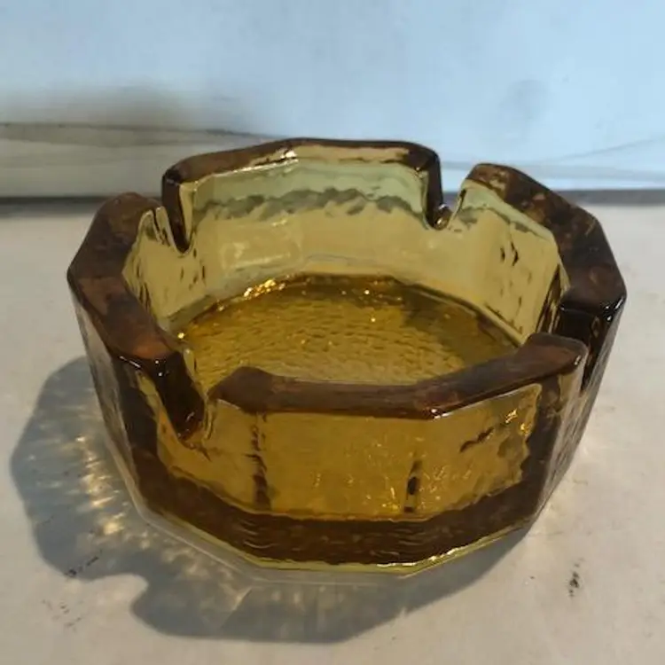 Vintage Blenko Paneled Amber Pebbled Art Glass Ashtray c1960's MCM. Good condition. 1-1/2" tall, 3-3/4" wide