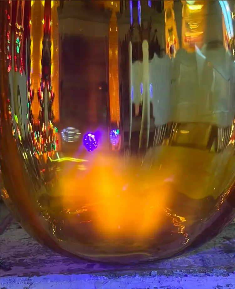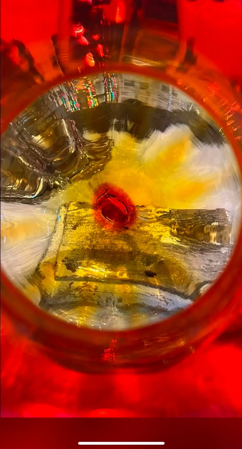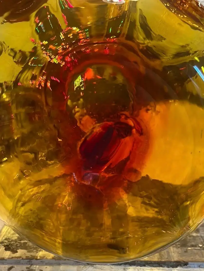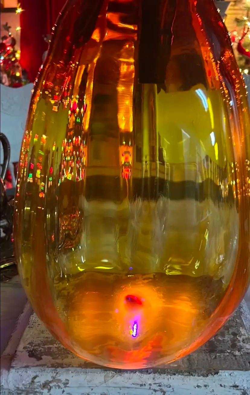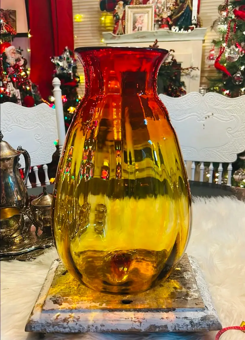 Blenko Joel Myers tall vase. Punched intentions where tangerine blends with the red Ribbed optics Beautiful Cadmium Glow. 14 inches tall and 9 inches wide. Flawless condition