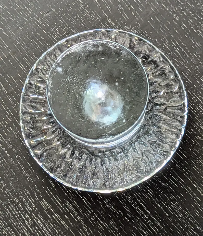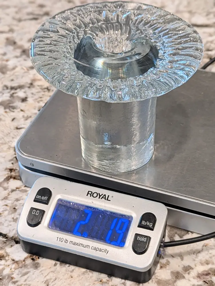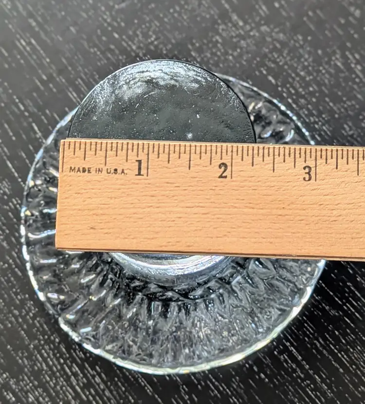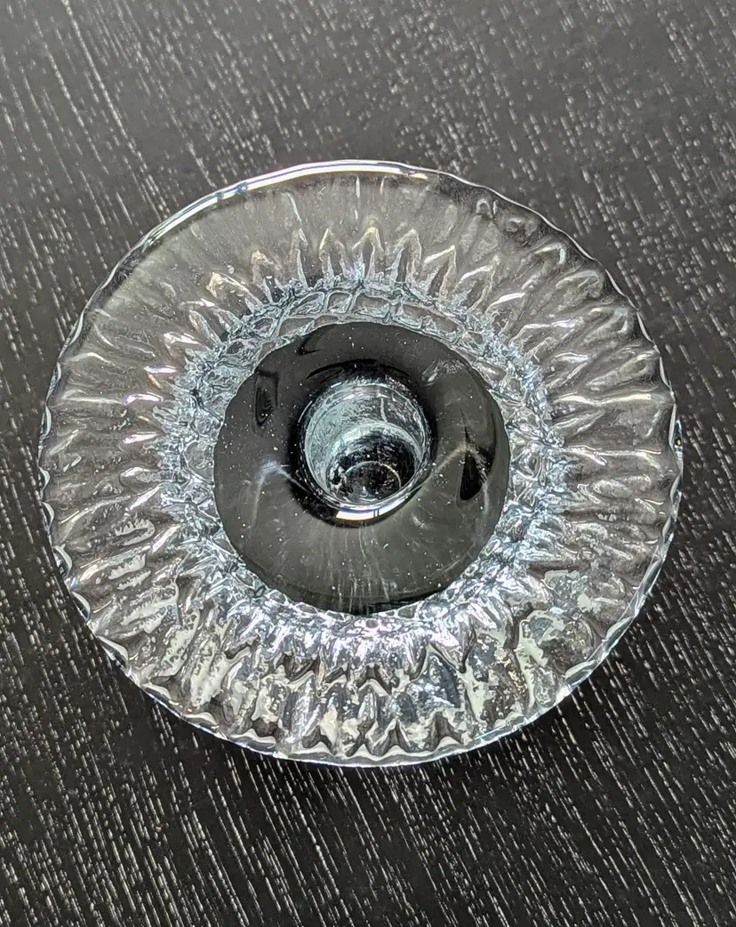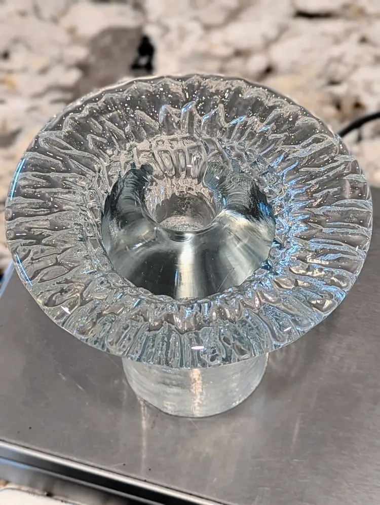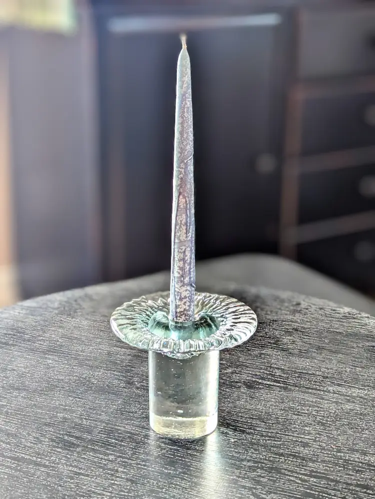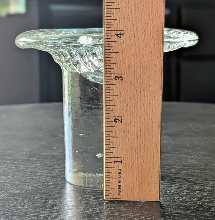 Beautiful Handcrafted Candle Holder by Blenko Shaped like a mushroom in clear textured glass Measures 4 inches tall x 4 7/8 inches diameter at the rim Diameter at the base is 2 1/4 inches Weight is 2 pounds 4 ounces before packaging Condition is excellent