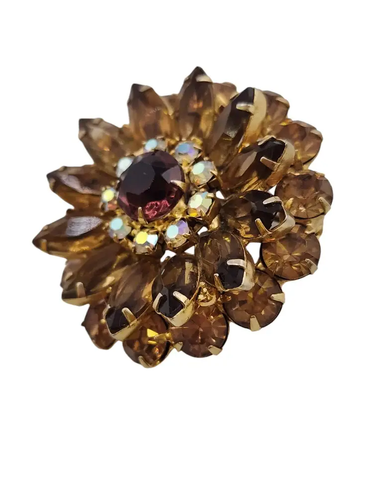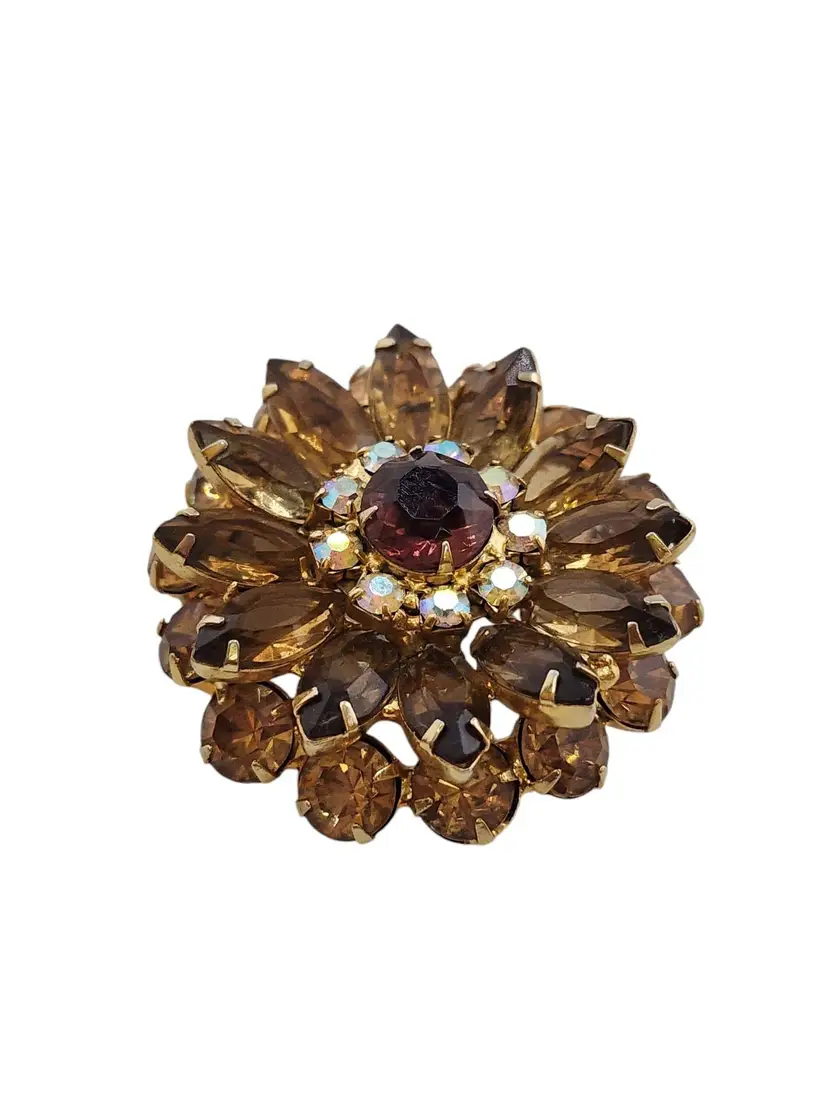 Size: 2" Color: Gold, champagne, purple Condition: Very good vintage Signed: None Details: Nice stones! Topaz, champagne, ab clear and purple in the center! Could use a cleaning.