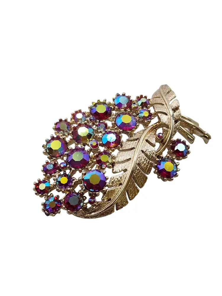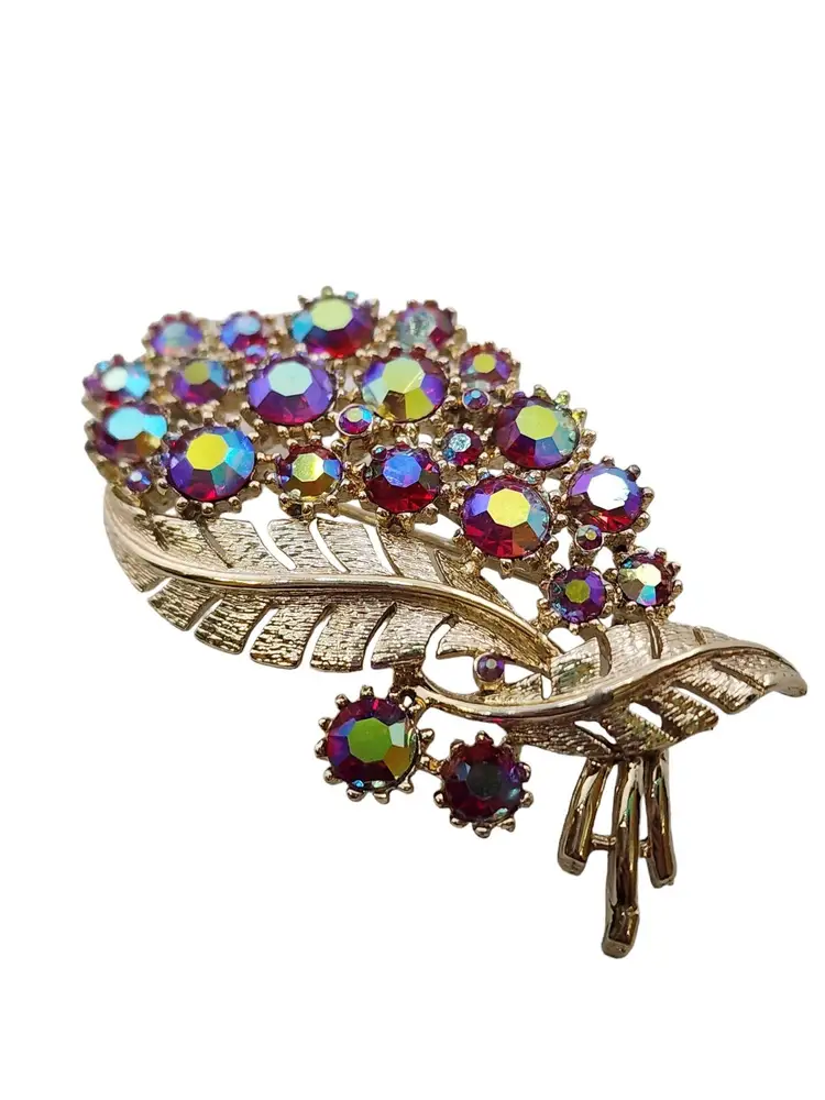 Size: 2.75" Color: Gold Condition: Very good vintage Signed: None Details: It has an area that should have a mark, not a good stamping, nice ab stones.