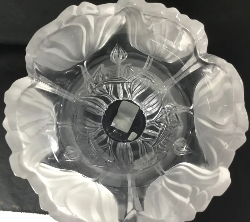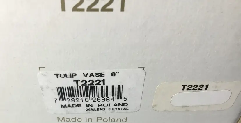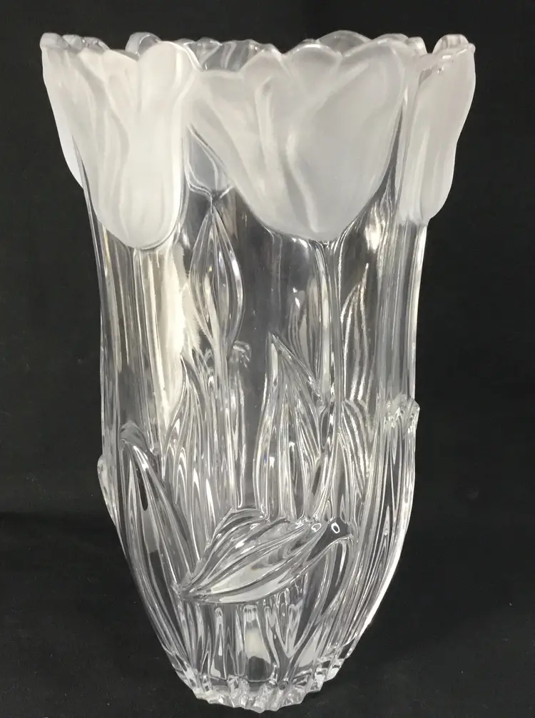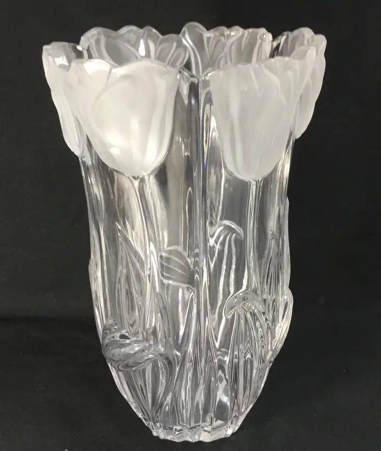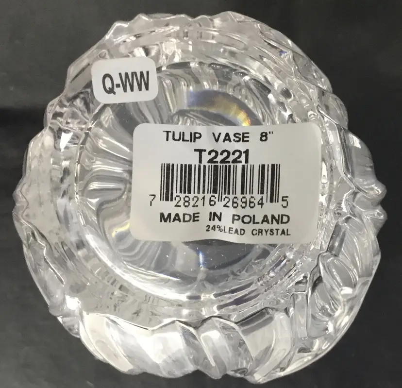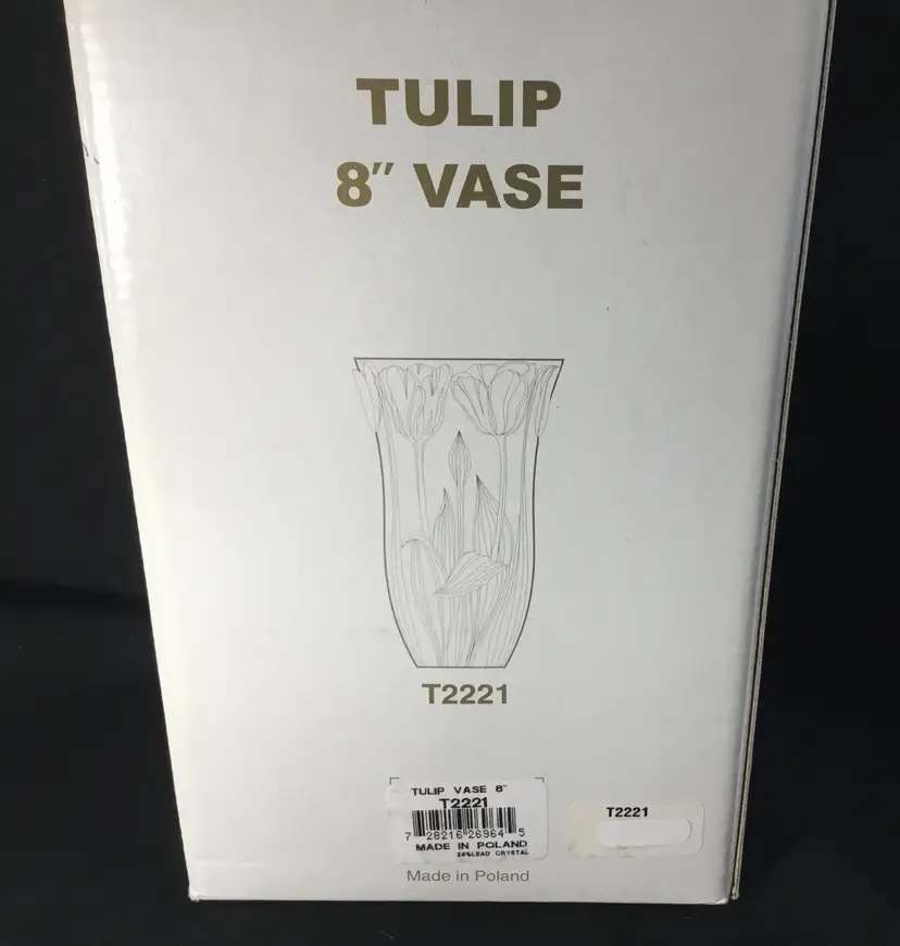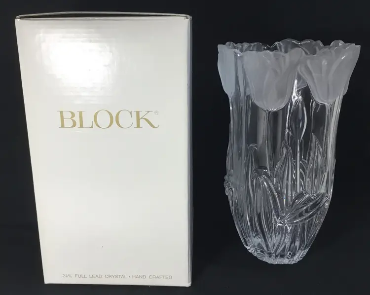 8 Inches tall by 4.75 inches wide, holds 3+ cups of liquid, 24% lead crystal tulip vase. Made by Block in Poland, variant model T2221 has clear, pressed crystal base with satin crystal petals on the tulips. This one appears to be new with all the tags still on it and on the original box. No signs of wear.