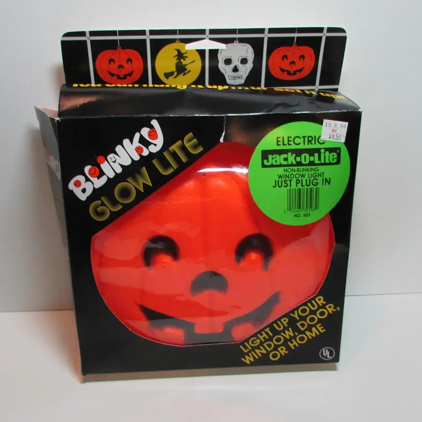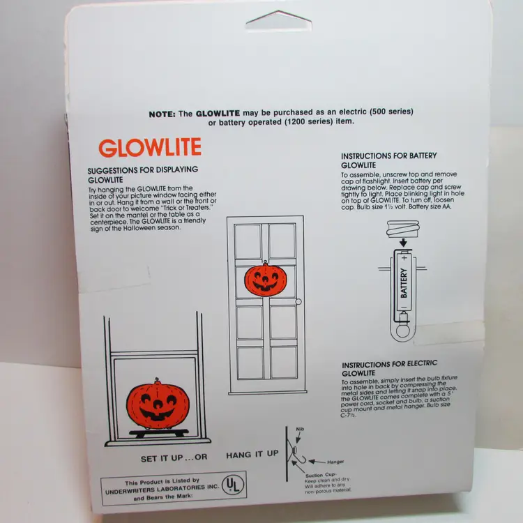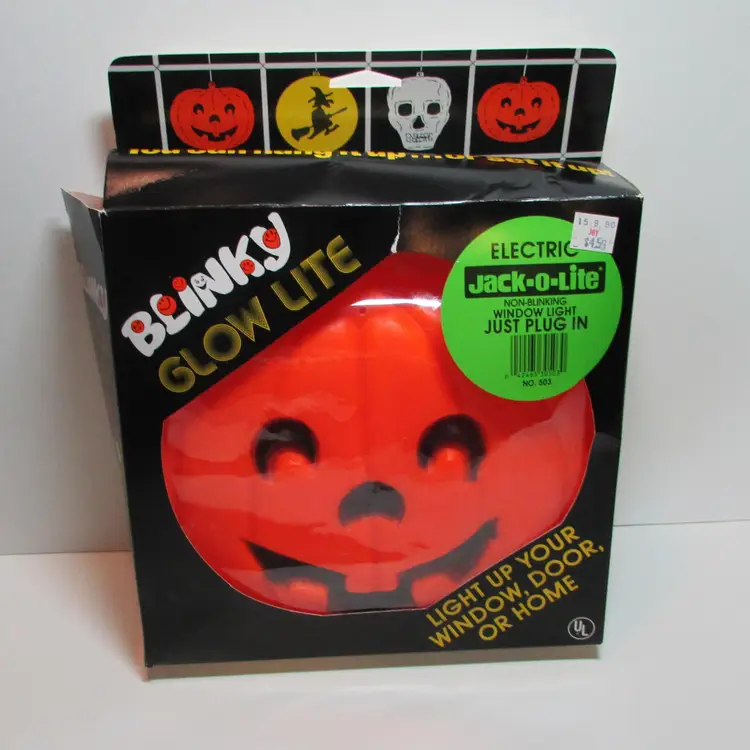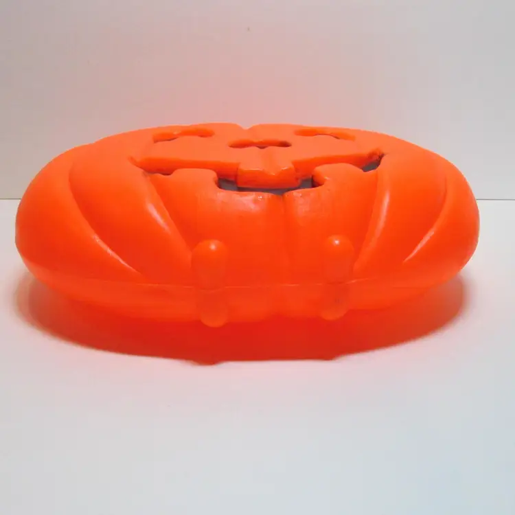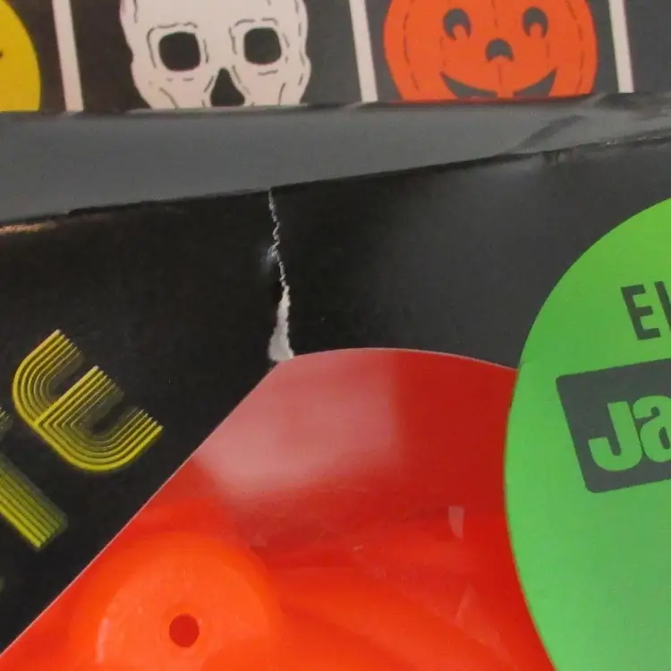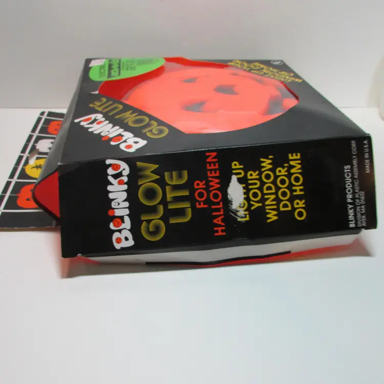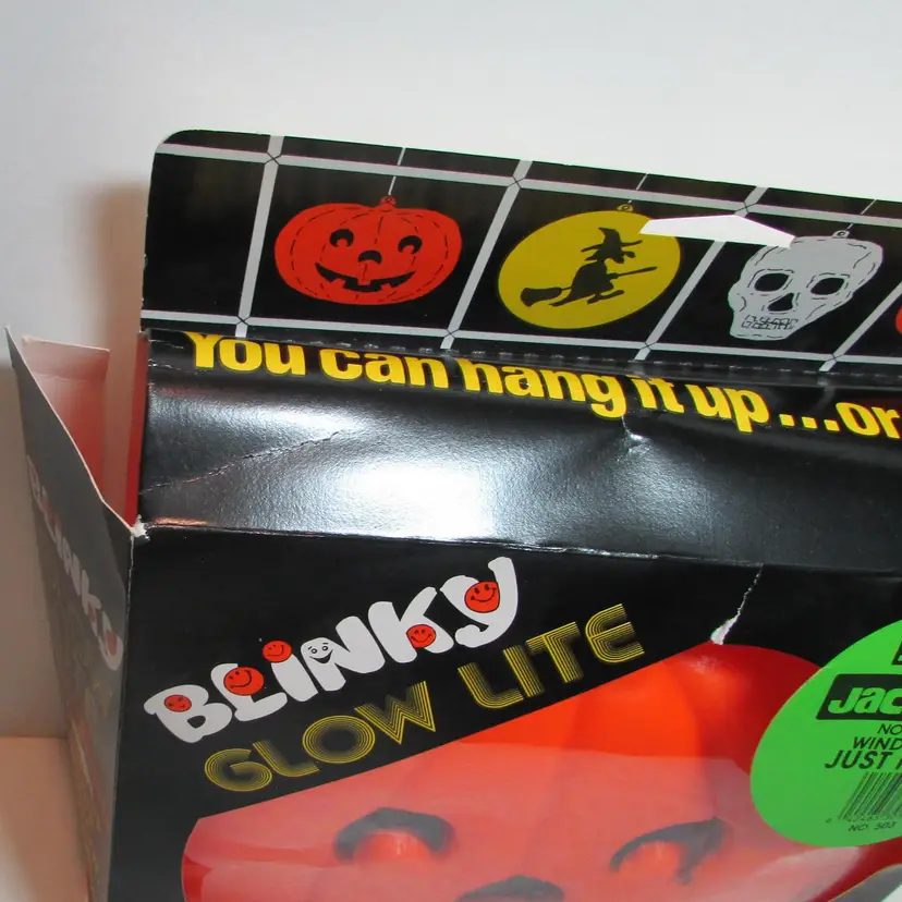 This fun pumpkin is in good condition, you will need to add a hanger and a section cup if you want to hang this pumpkin up. The box has some damages, it is squished on the top, a rip on the front and the cellophane is detached from the box. Still a nice piece to display.