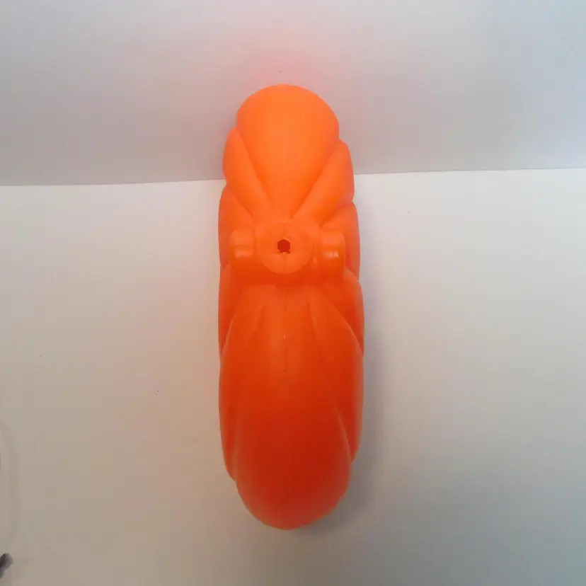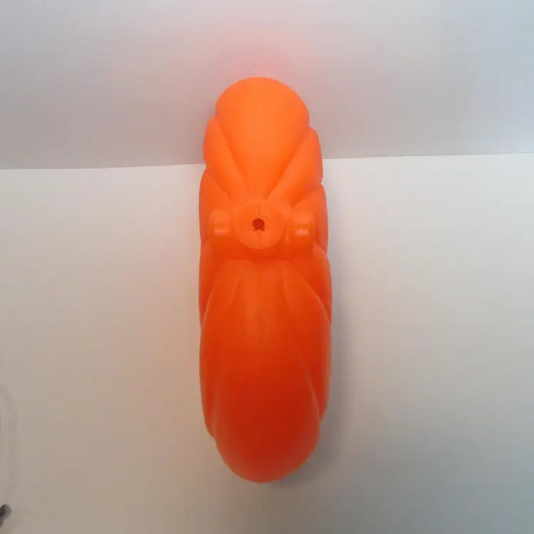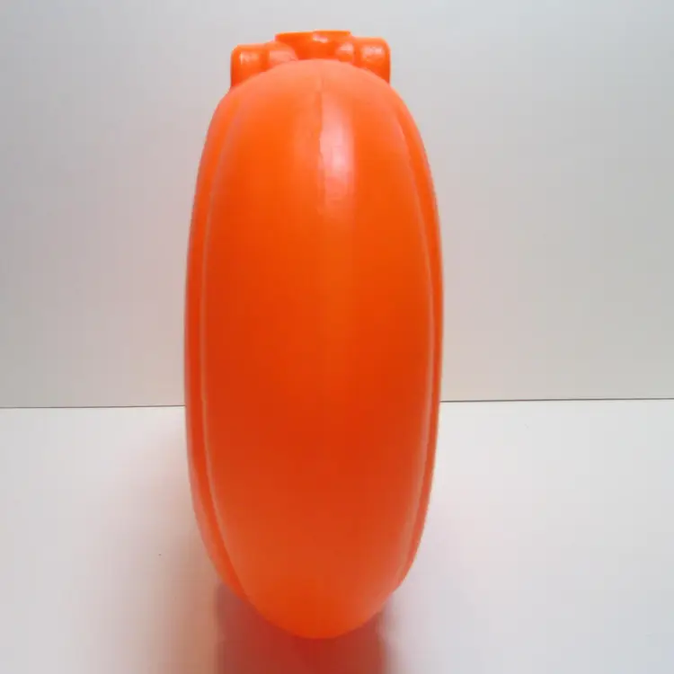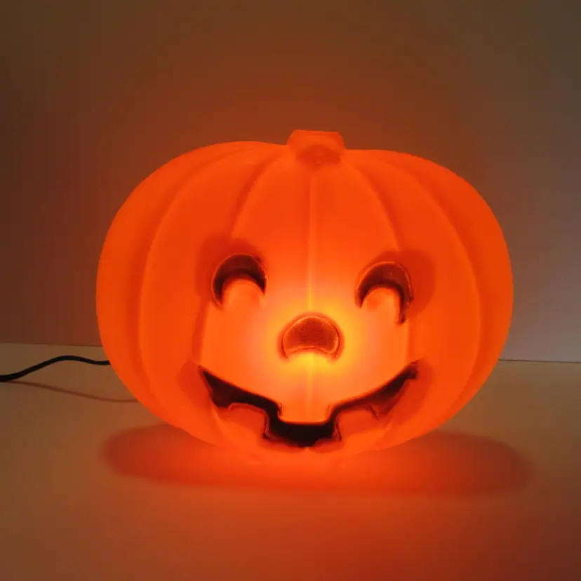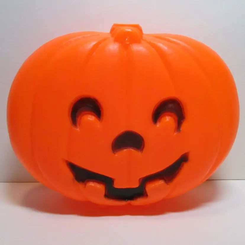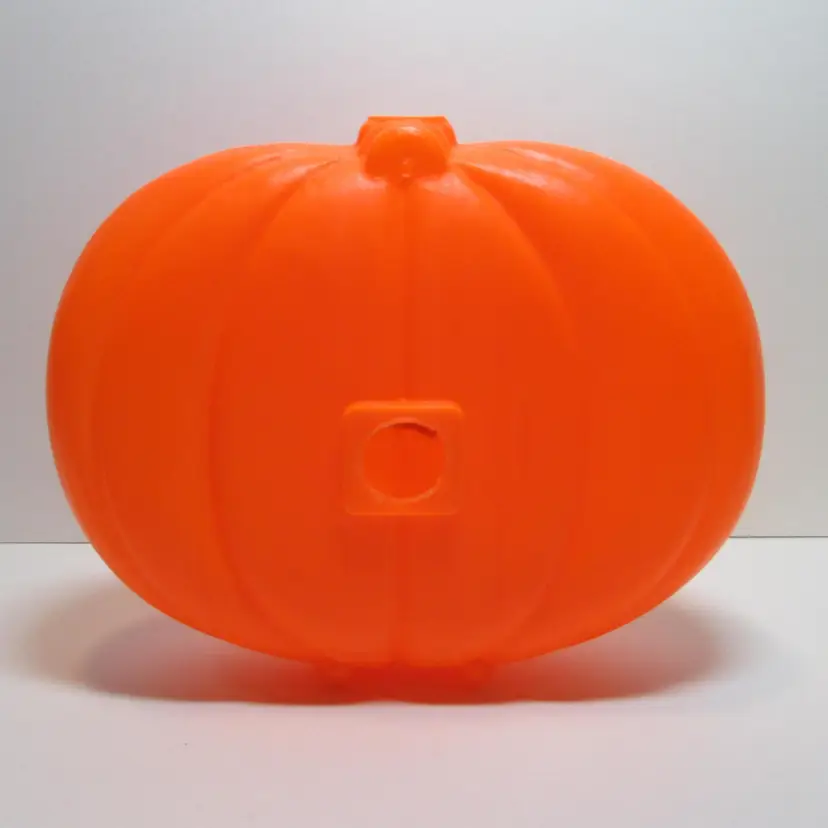 This fun pumpkin is in good condition, you will need to add a hanger and a section cup if you want to hang this pumpkin up. The box has some damages, it is squished on the top, a rip on the front and the cellophane is detached from the box. Still a nice piece to display.
