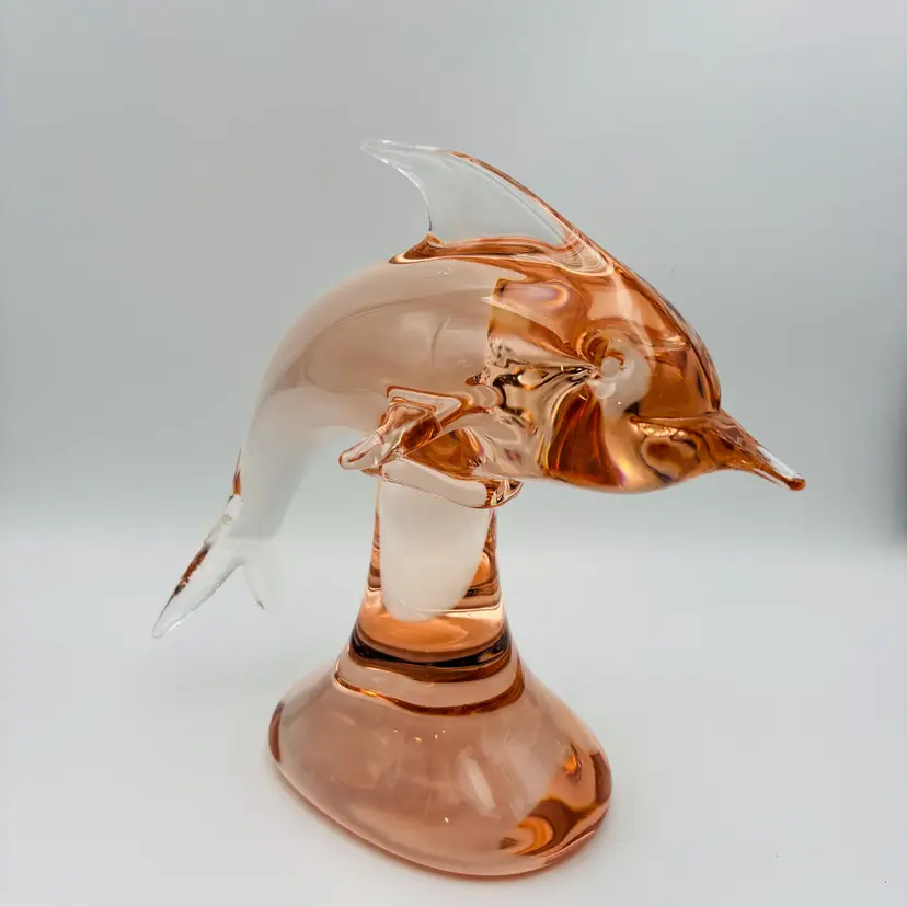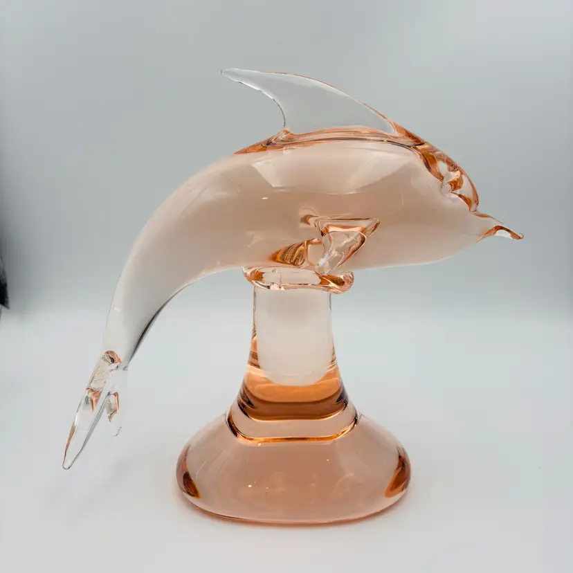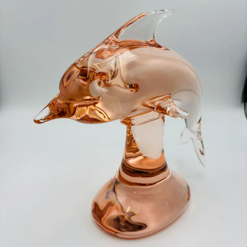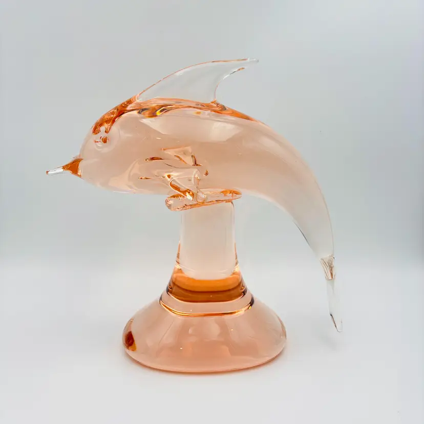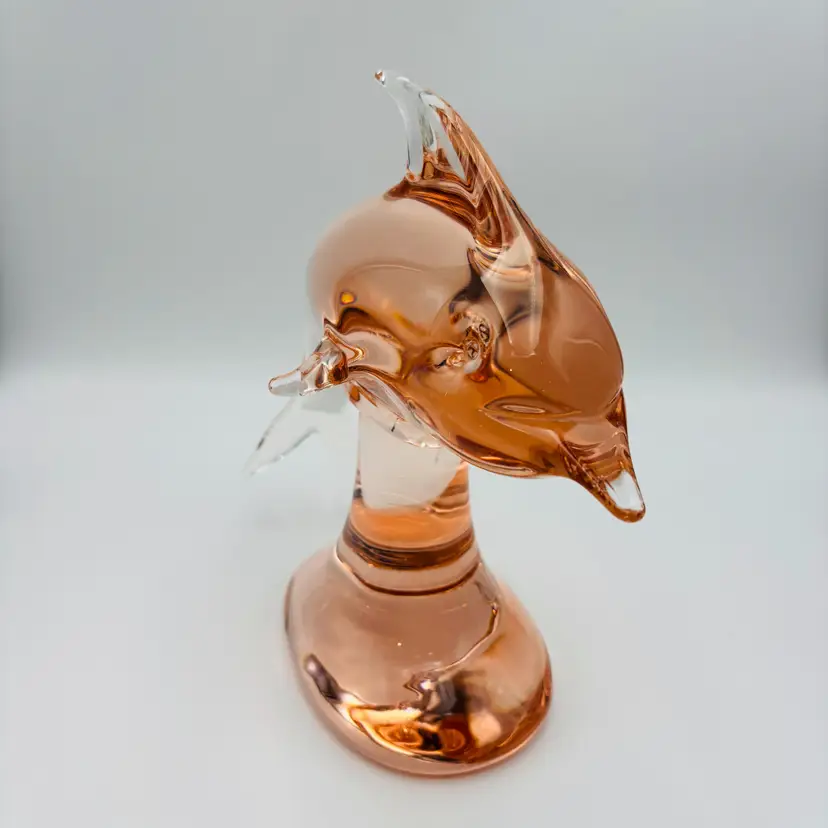 For sale is a Vintage Blown Art Glass Dolphin on Pedestal Figurine Sculpture Handblown Peach