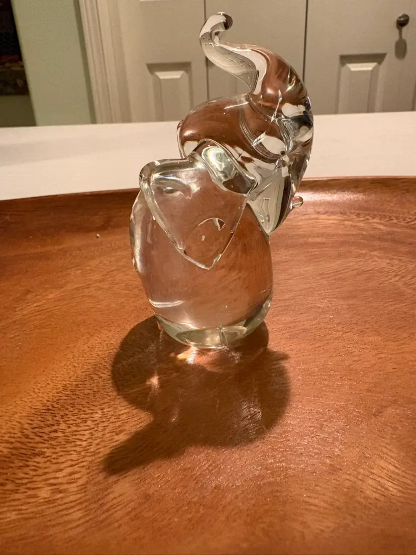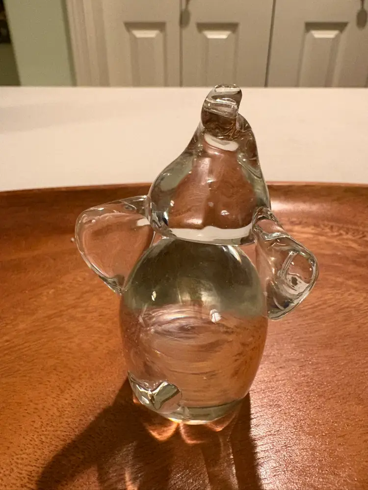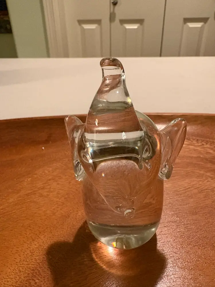 This vintage blown glass elephant paperweight stands at 3 3/4" tall, making it a charming and unique figurine for collectors of animal-themed items. Made in Taiwan, this piece showcases the intricate craftsmanship and artistic flair of glassblowing, with a whimsical design that captures the essence of an elephant. The delicate material of glass adds a touch of elegance to any space, making this paperweight a delightful addition to any collection.