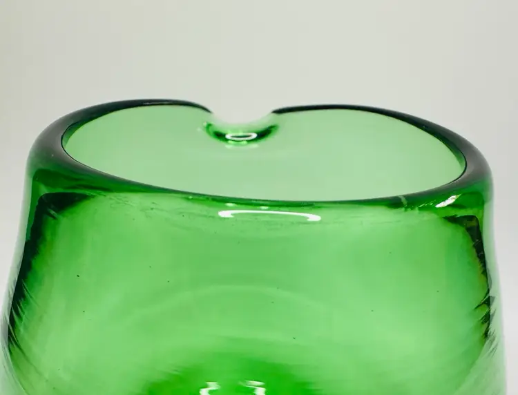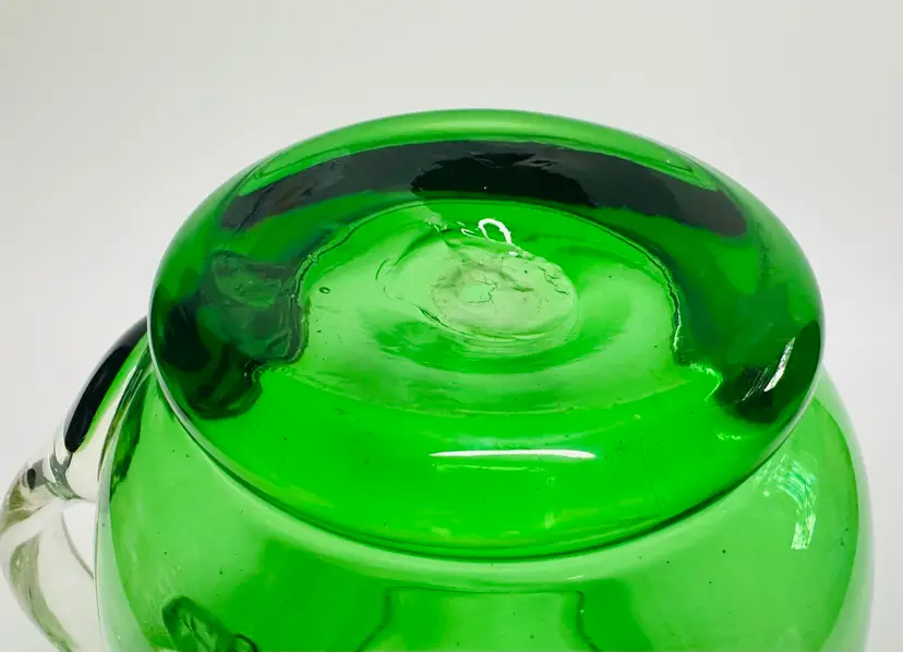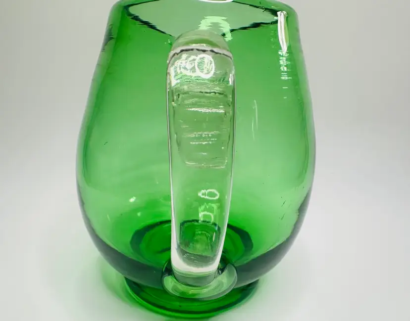 Blown glass green pitcher with applied clear glass handle. 5.5 inches tall and 5.5 inches wide including handle. No chips, cracks, or scratches.