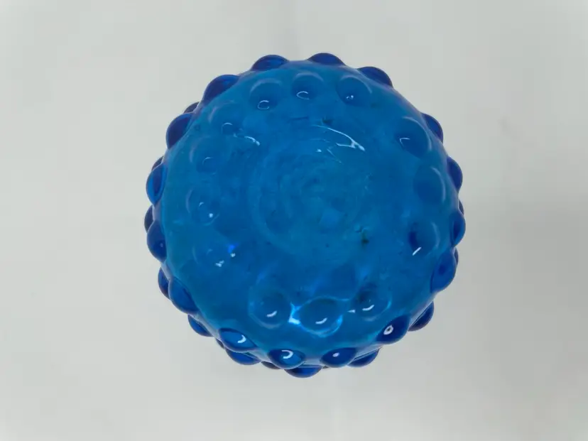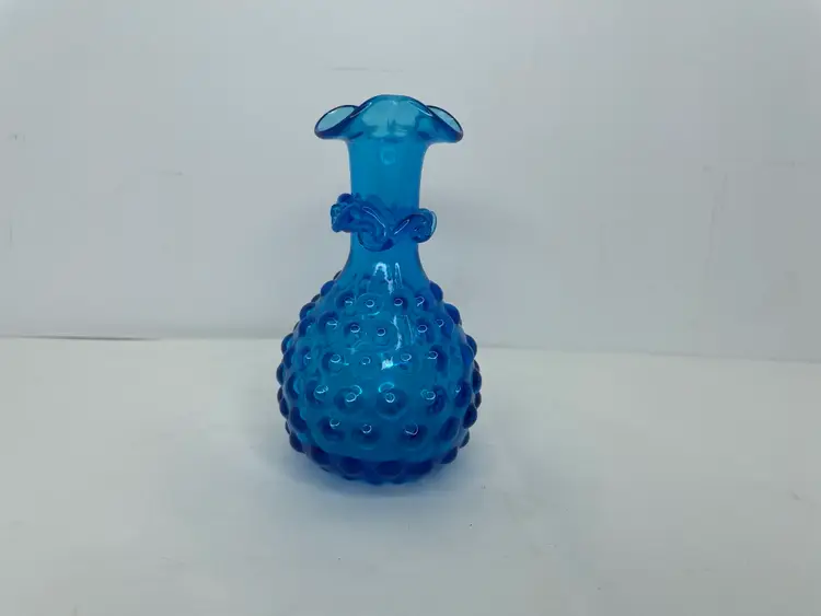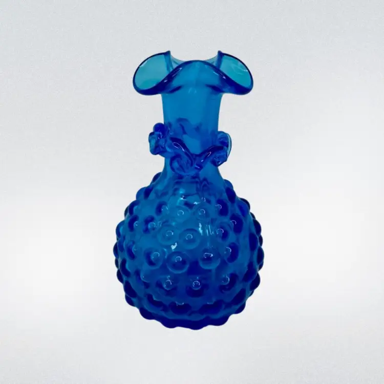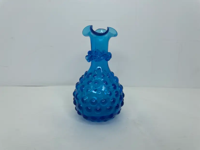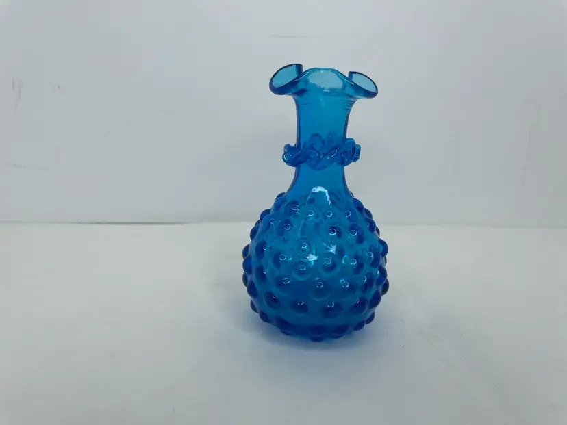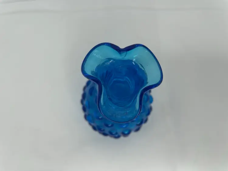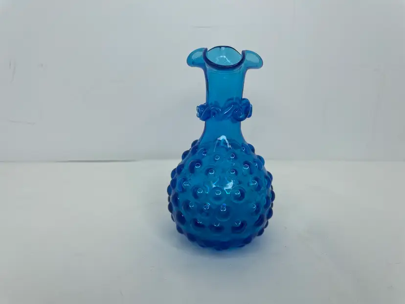 Add a touch of mid-century modern style to your home with this beautiful vintage hand-blown glass vase. The vase features a lovely hobnail pattern and stunning blue color that will make it a standout piece in any room. The ruffled edge and applied rigaree details provide a decorative touch that adds to its charm.