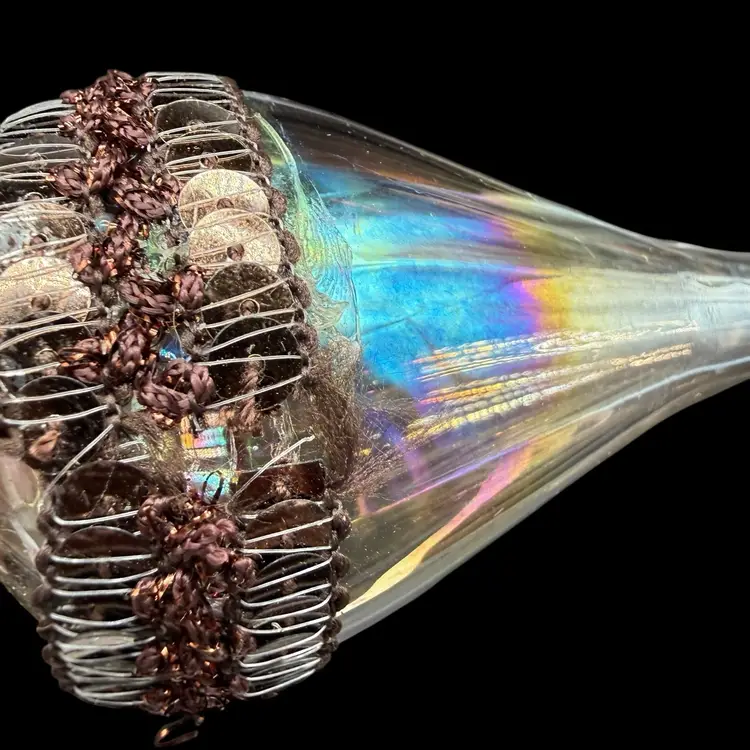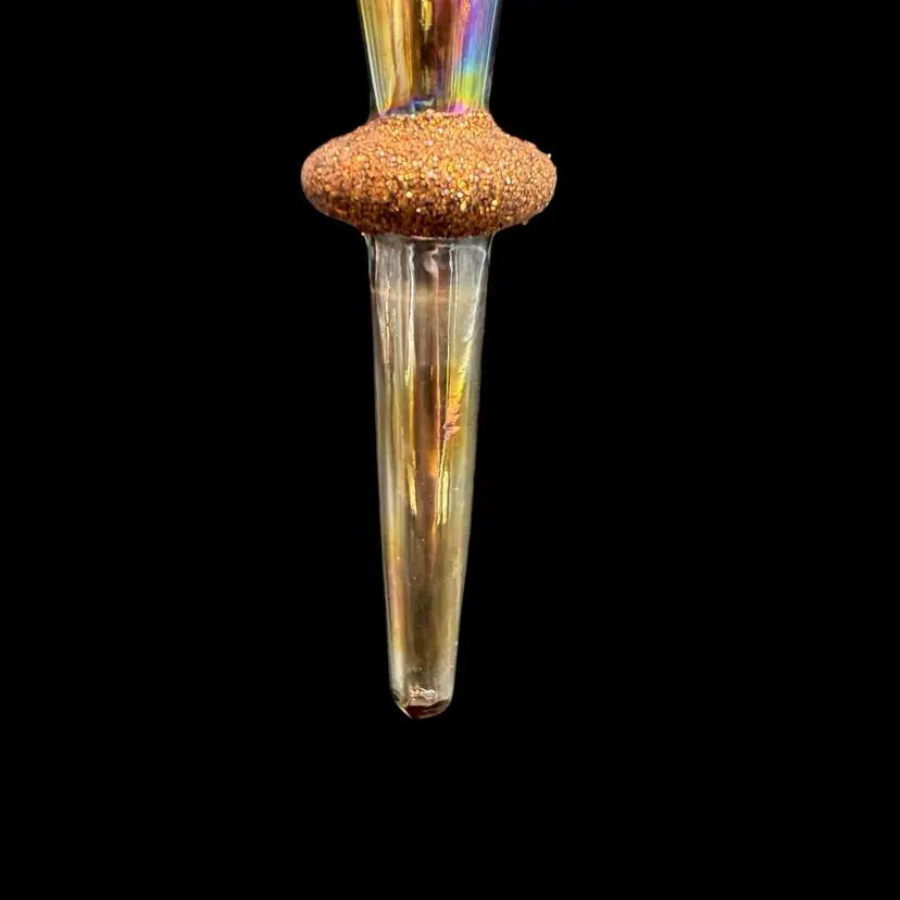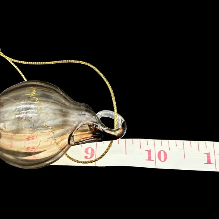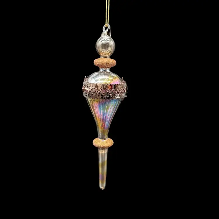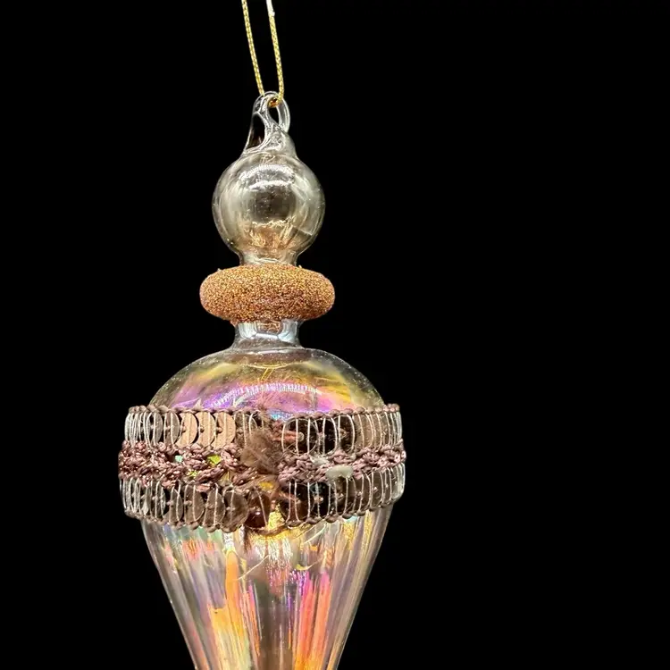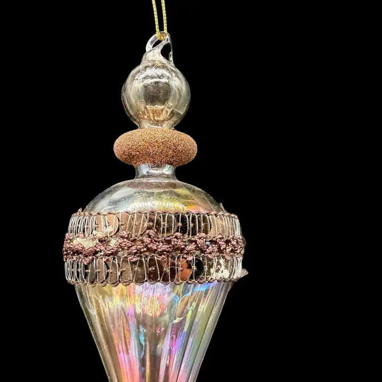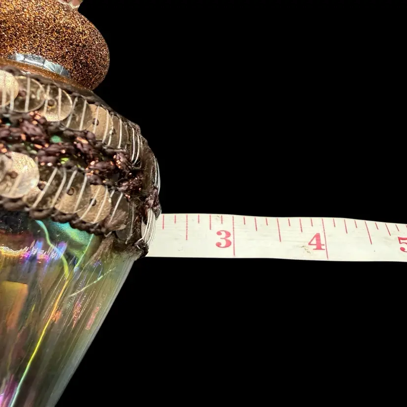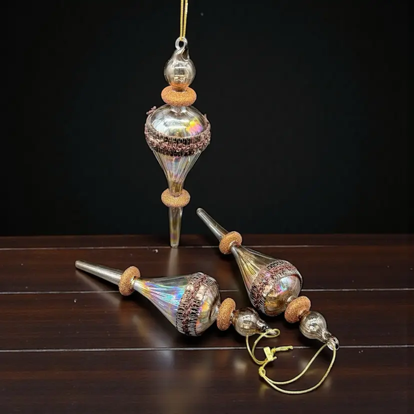 This set of vintage blown glass long finial ornaments feature 3 iridescent brown ornaments with fabric and glitter accents, each measuring about 9.5 inches in length. Handmade with a hand-blown production technique, these ornaments are perfect for all occasions, particularly holiday-themed Christmas tree decorations. The vintage design adds a nostalgic touch to any collection, making them a unique and charming addition to your seasonal decor.