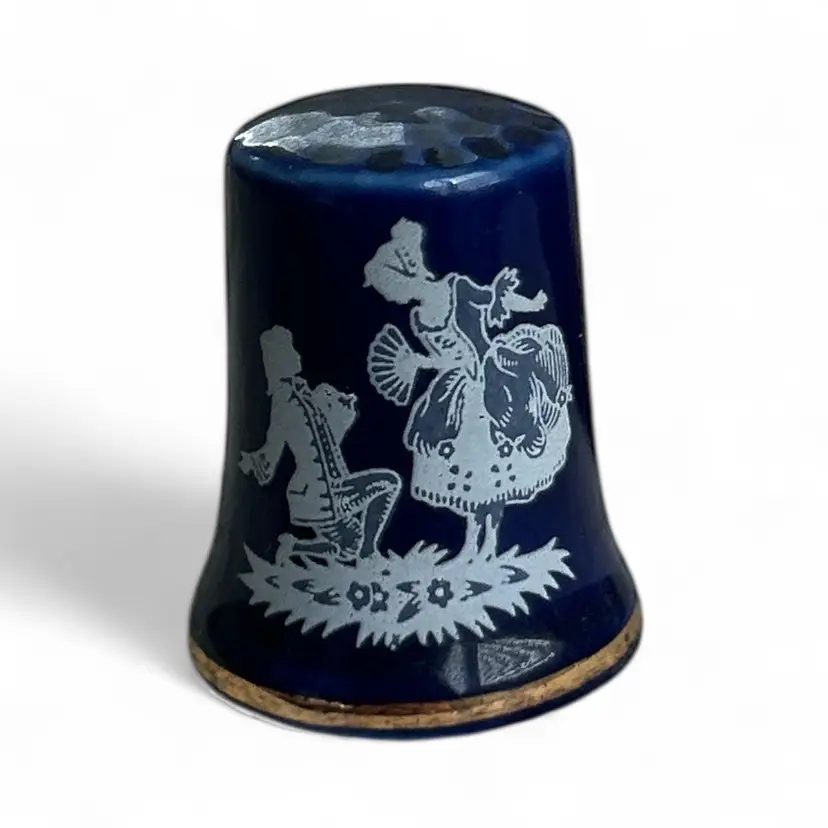 Add a touch of whimsy to your collection with this vintage blue ceramic thimble featuring charming dancing figures. A delightful piece for sewing enthusiasts and collectors alike.
