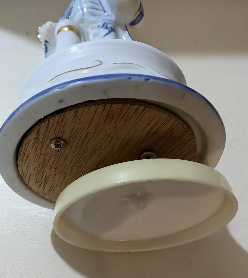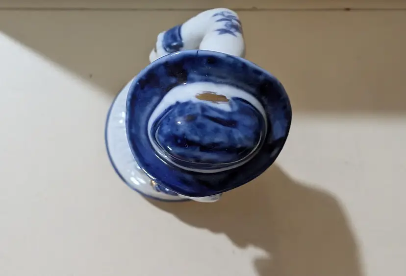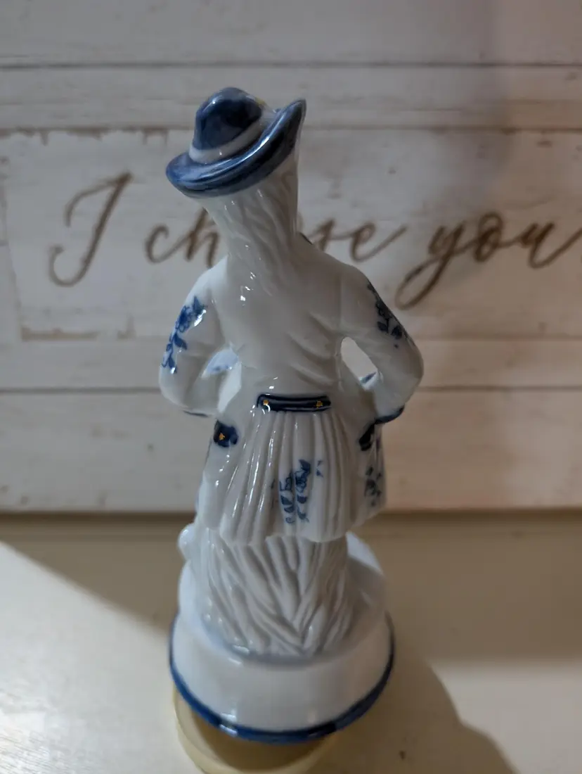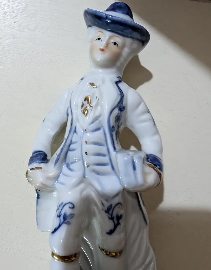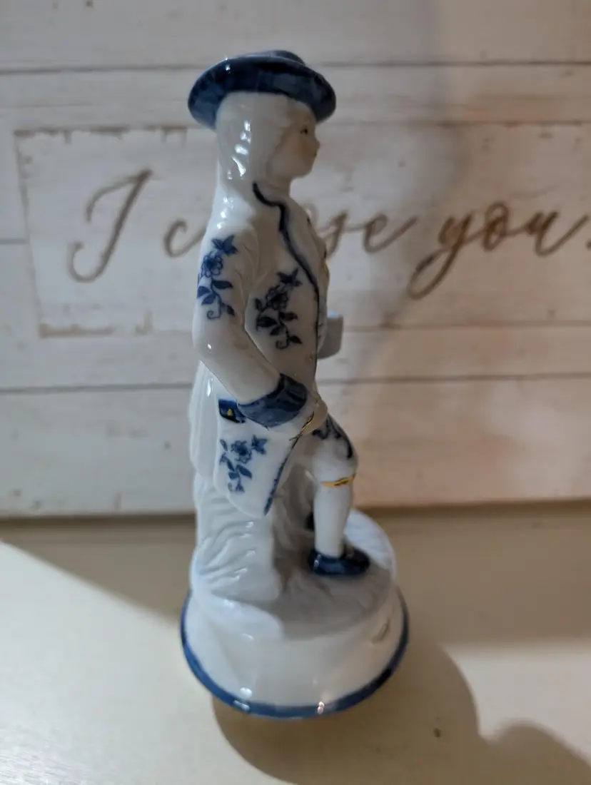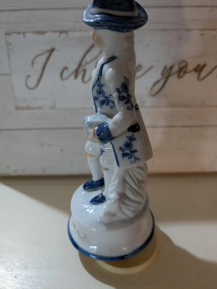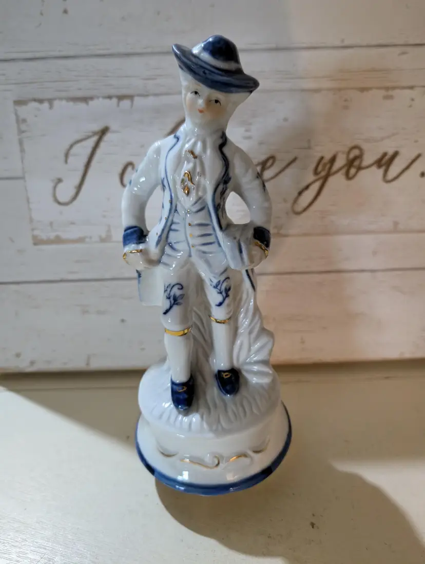 Elegant vintage blue and white porcelain figurine music box depicting a colonial gentleman in detailed attire. This charming piece is in great condition with no cracks or chips and is perfect working condition. Perfect for adding a touch of historical charm to your home decor or as a thoughtful gift for collectors. The figurine stands approximately 9 inches tall and 4 inches width and features intricate details in the clothing and posture.