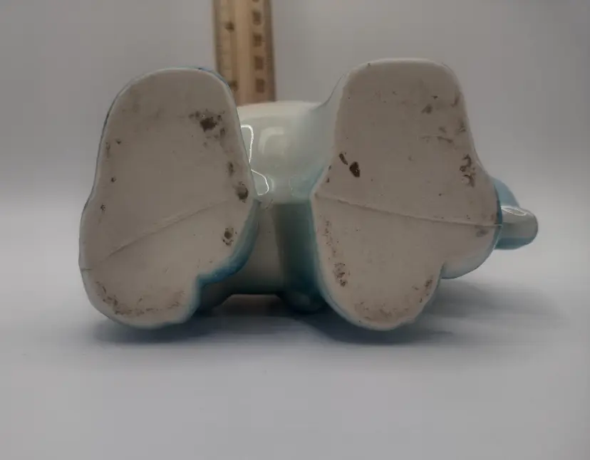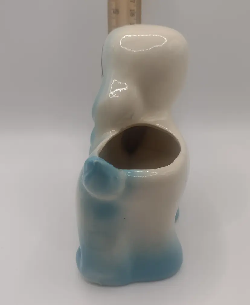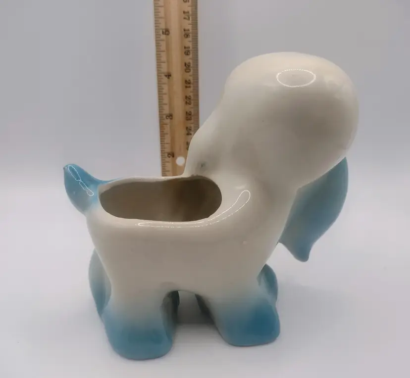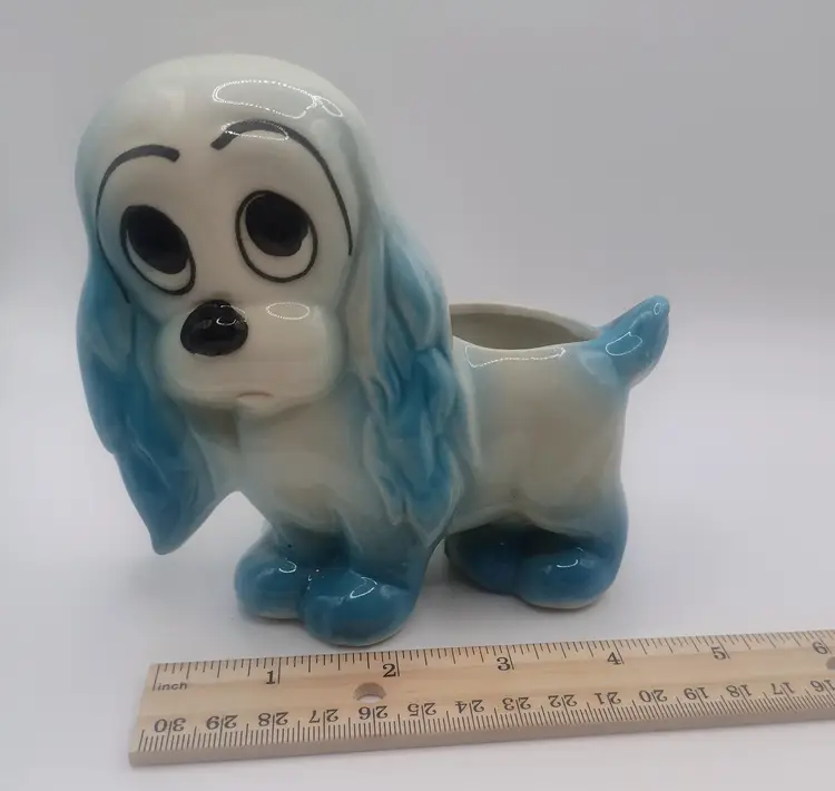 Charming vintage planter featuring a sad puppy design in blue and white. Perfect for adding a touch of whimsy and character to your home decor or garden.