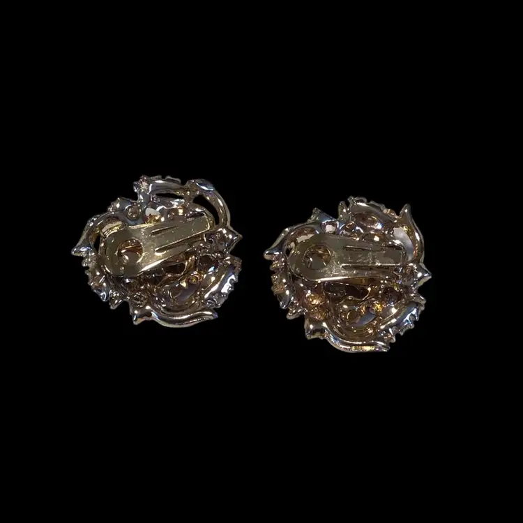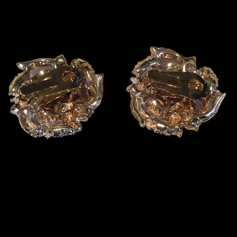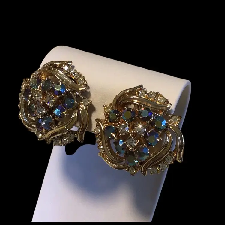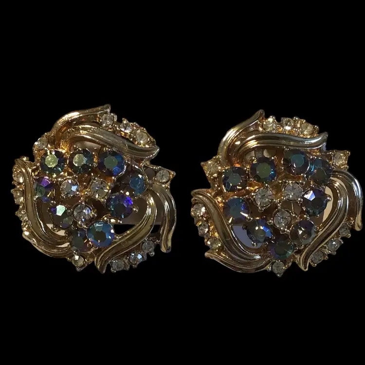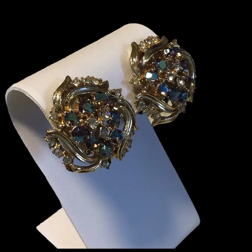 Statement blue AB & clear rhinestone gold tone clip back, grandmacore large nearly 1-1/2" across. #175