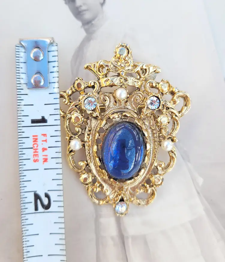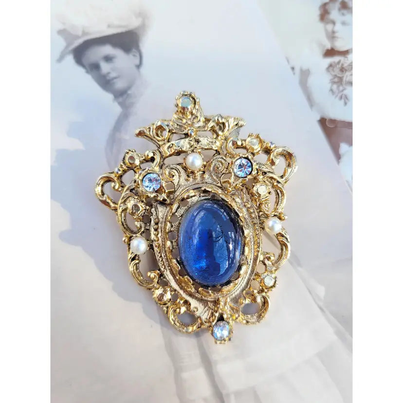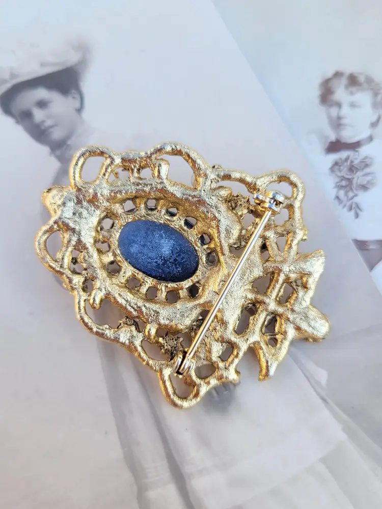 Lovely 1970s-does-1870s blue stone brooch with little faux seed pearl accents, from an estate. In good condition, please see pictures for details and measurements.