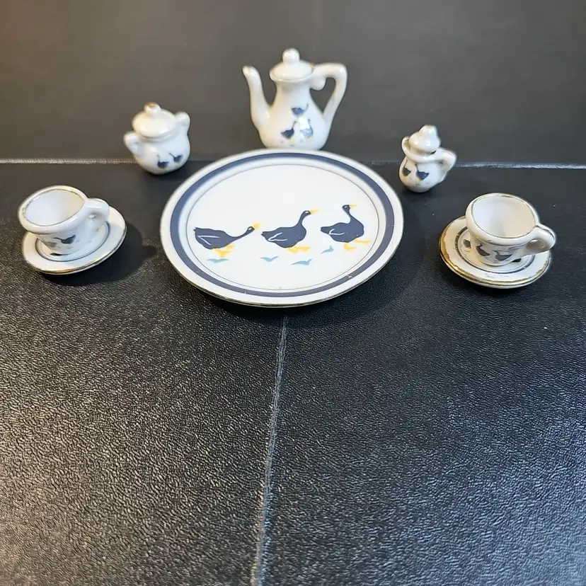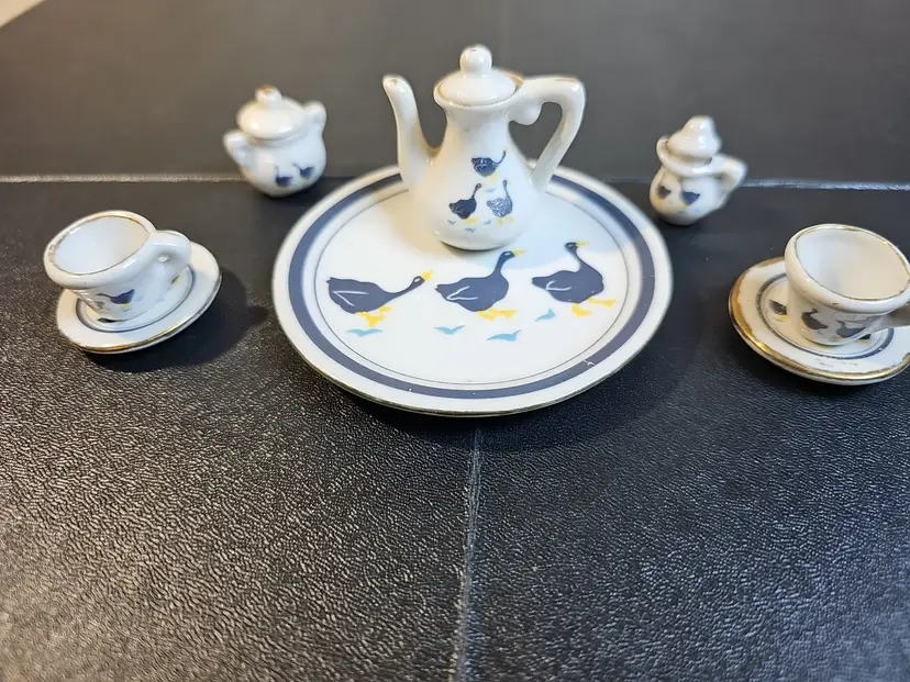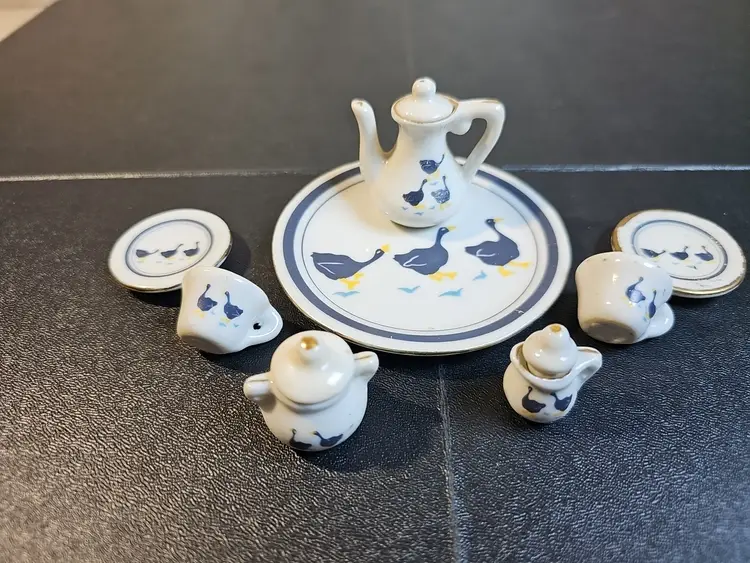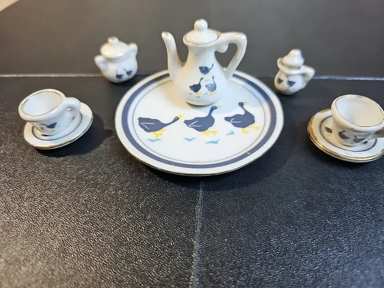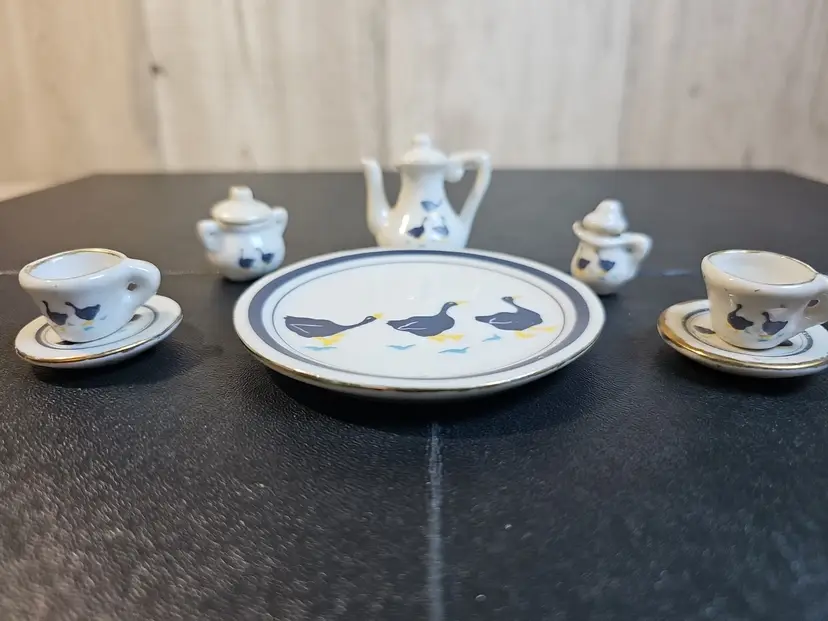 Vintage 8-piece miniature ceramic tea set with matching tray, country geese motif and gold trim Design & Material: White ceramic/porcelain adorned with blue geese silhouettes and gold accent trim — cottage charm with a touch of shine Pieces Included: Teapot with lid, sugar bowl, creamer, two cups, two plates, and matching tray Size / Dimensions: (Please confirm exact tiny measurements; perfect for shelf, dollhouse display, or knick knack collection) Condition: Used vintage condition — some wear and imperfections consistent with age and use; see photos for detail Display / Use Suggestions: Ideal for cottagecore decor, mini “tea for two” displays, curio cabinets, or adding a cozy farmhouse vibe to any shelf Care Instructions: Hand wash gently; avoid harsh detergents or extreme temperature changes Why You’ll Love It: The playful country geese, pretty gold edges, and miniature size make this set a charming little treasure — great for creating that cozy, nostalgic moment wherever you place it.
