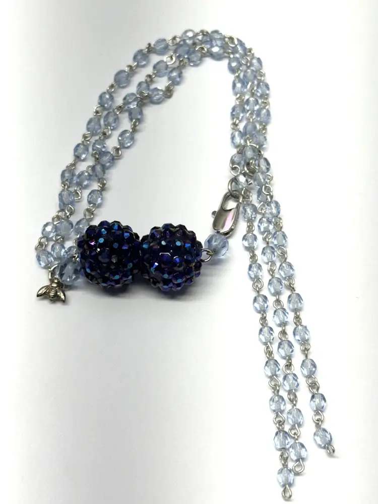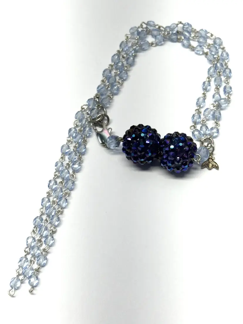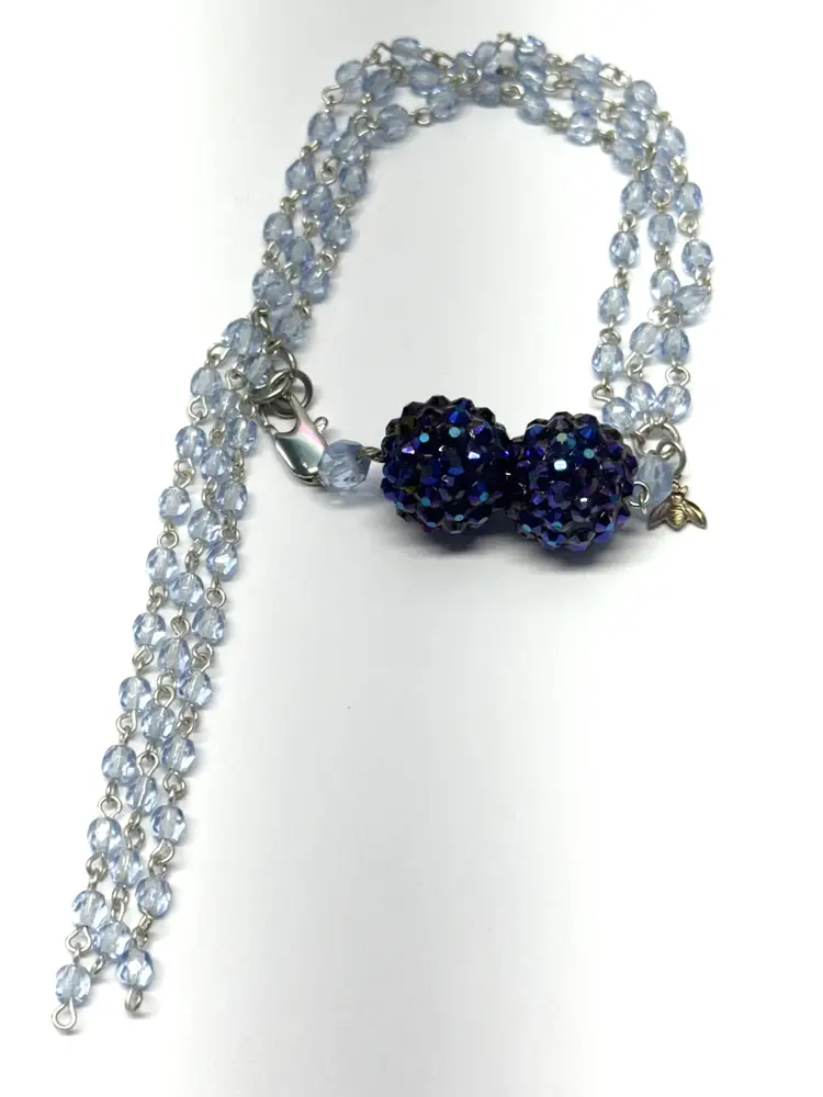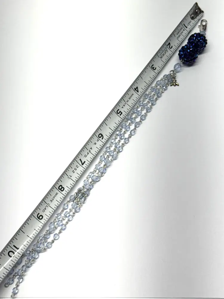 Vintage blue crystal beaded tassel rhinestone bracelet. Blue crystal beaded bracelet with rhinestone balls and hanging crystal tassel. Vintage bracelet with great shine. JH49MN.