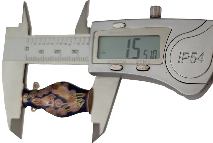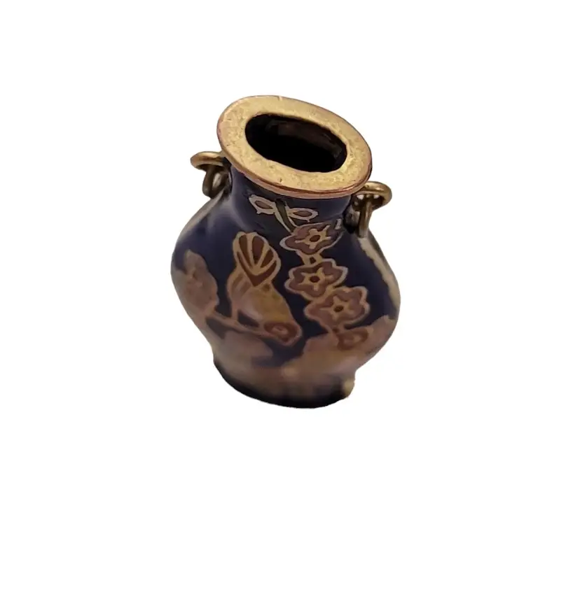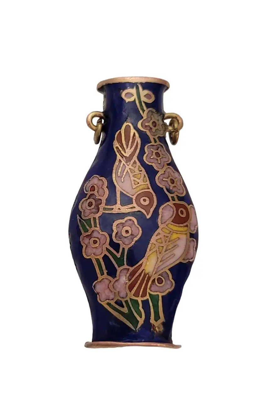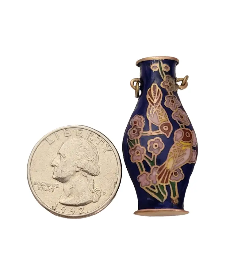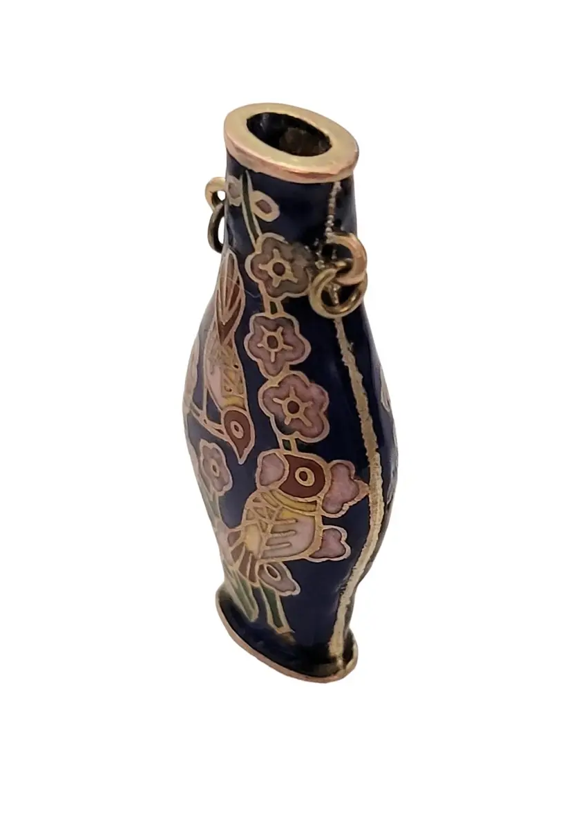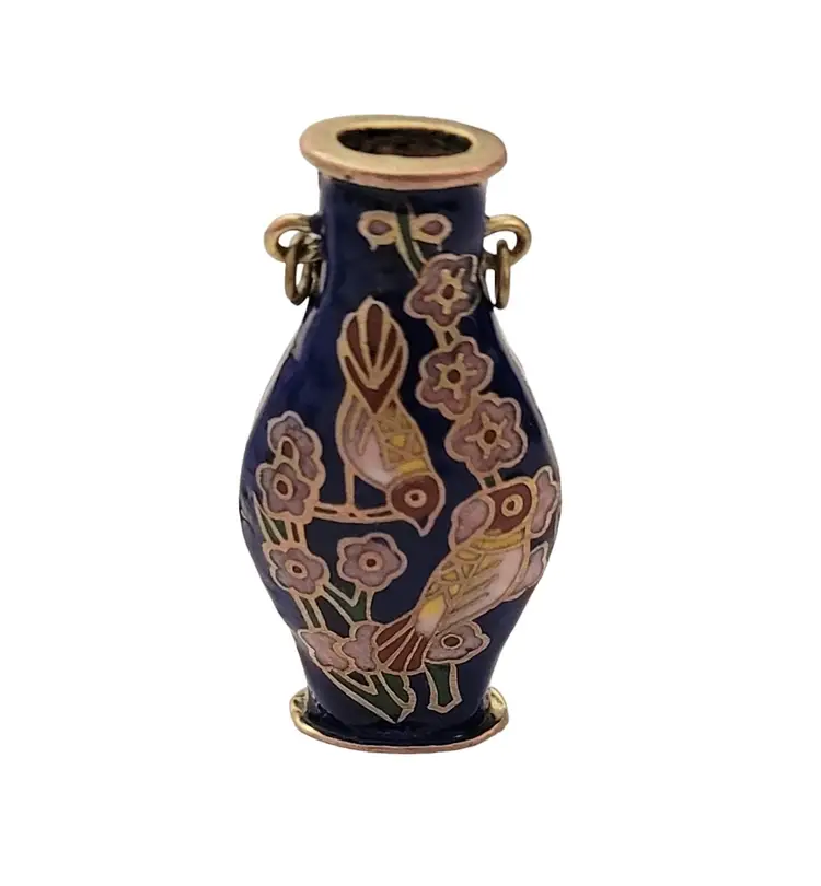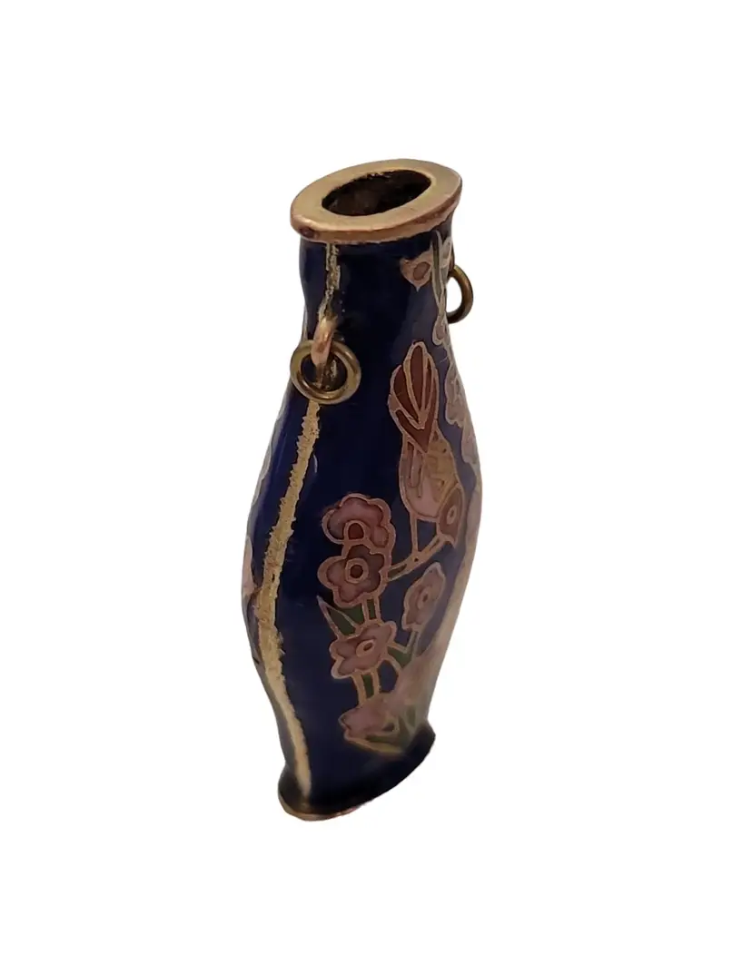 This Vintage Vase Charm Pendant is so cute and unique. It features a three-dimensional brass vase figure open on the top creating a distinctive shape. Delicately decorated with enamel cloisonne design of oriental ornaments of two little birds on branches with tiny white flowers contoured with gold tone on a dark blue background. The combination of colorful enamel gives objects a special charm and nobility to this piece. It measures approximately 1.5 inches in length. It has two round spring rings on each handle where you can add your favorite chain necklace. This pendant makes a wonderful gift to any vintage jewelry collector.