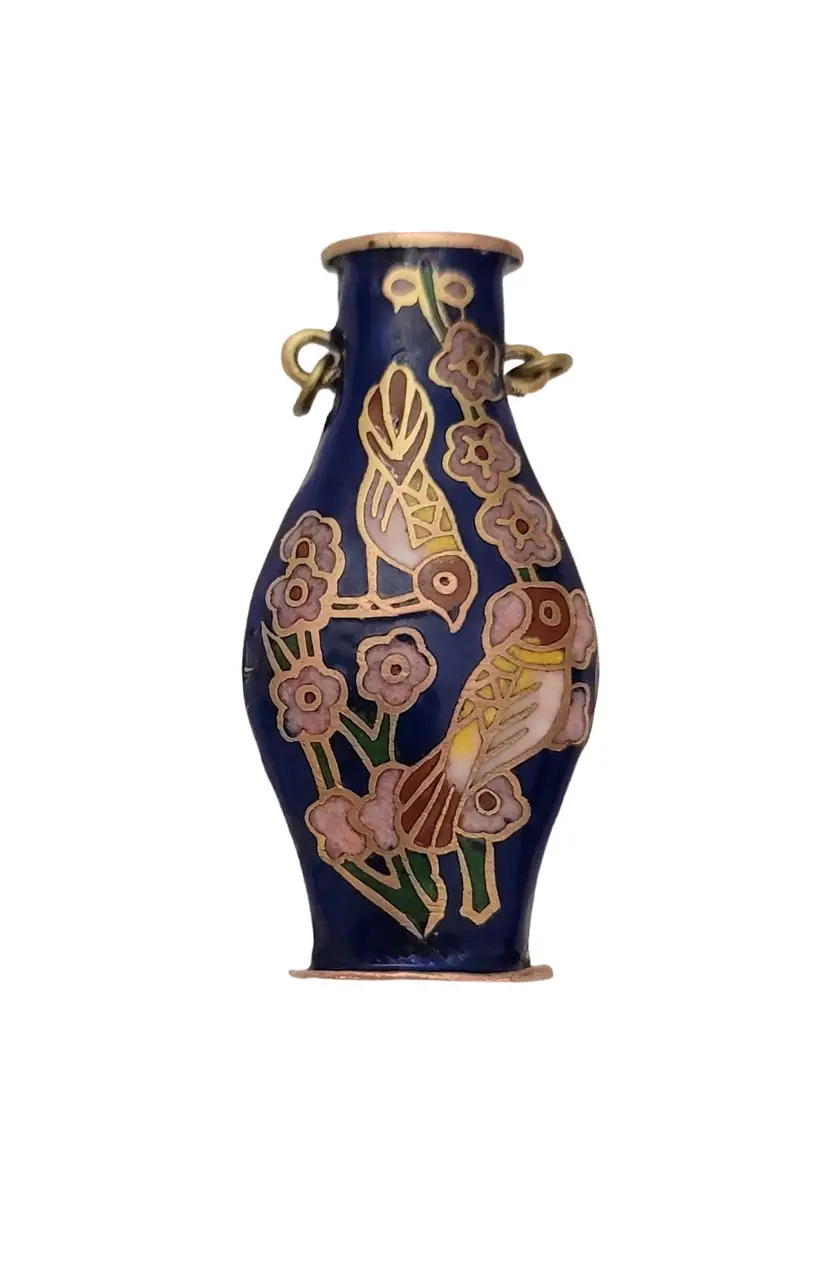 Vintage Blue Enamel Brass Vase, Birds Charm, Pendant E560
