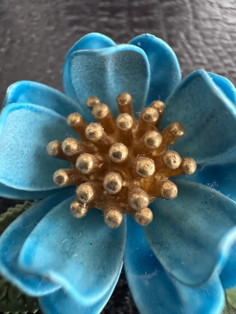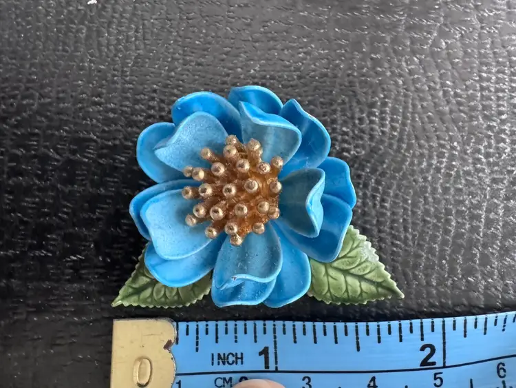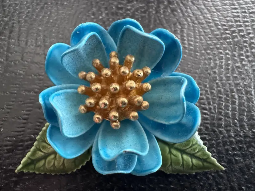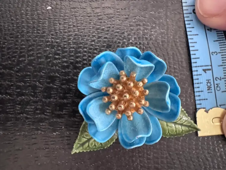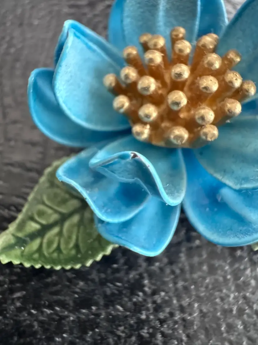Keywords: vintage brooch, floral brooch, blue enamel, gold-tone, flower pin, vintage jewelry, statement accessory, wedding accessory, garden party, elegant brooch, pre-owned brooch, unique jewelry, timeless elegance, vintage charm, jewelry collection.