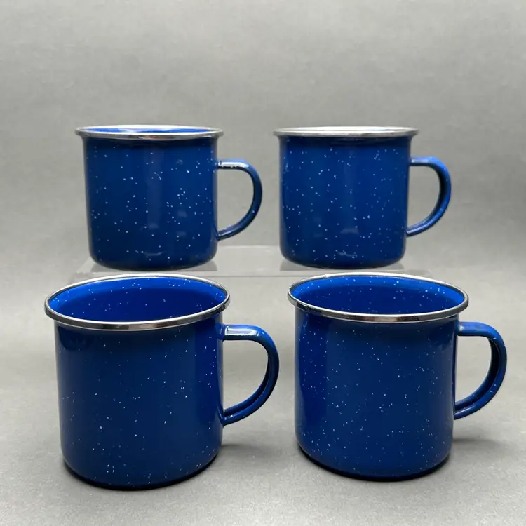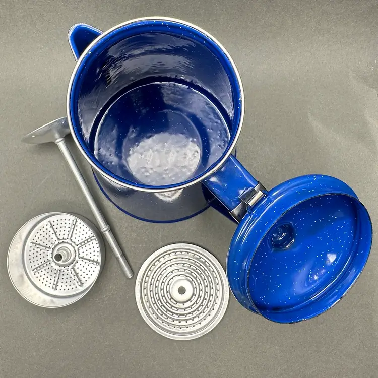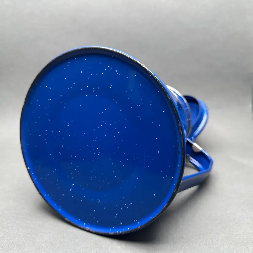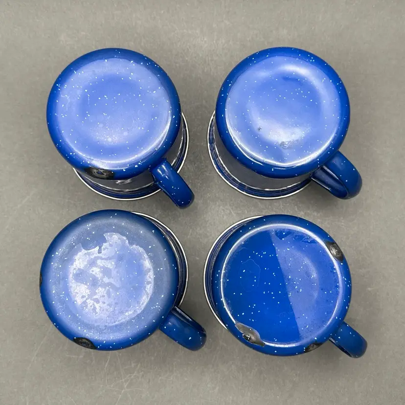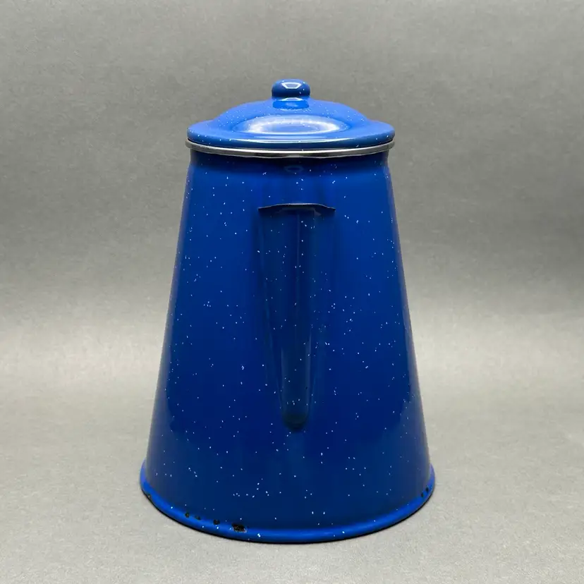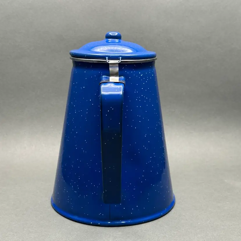 Vintage classic blue enamelware coffee pot with hinged lid and 4 cups. Great for use as a camping set.