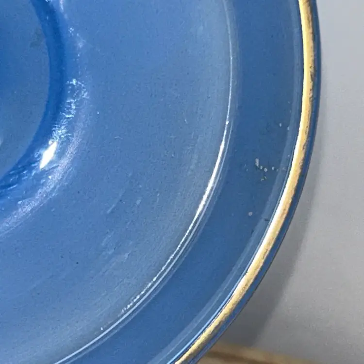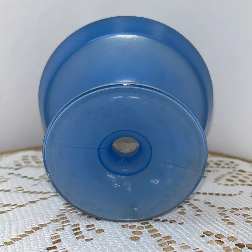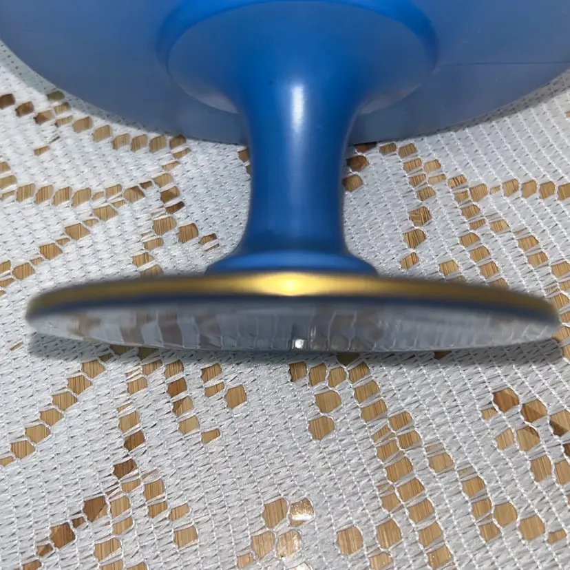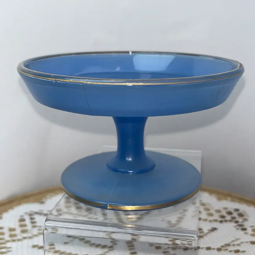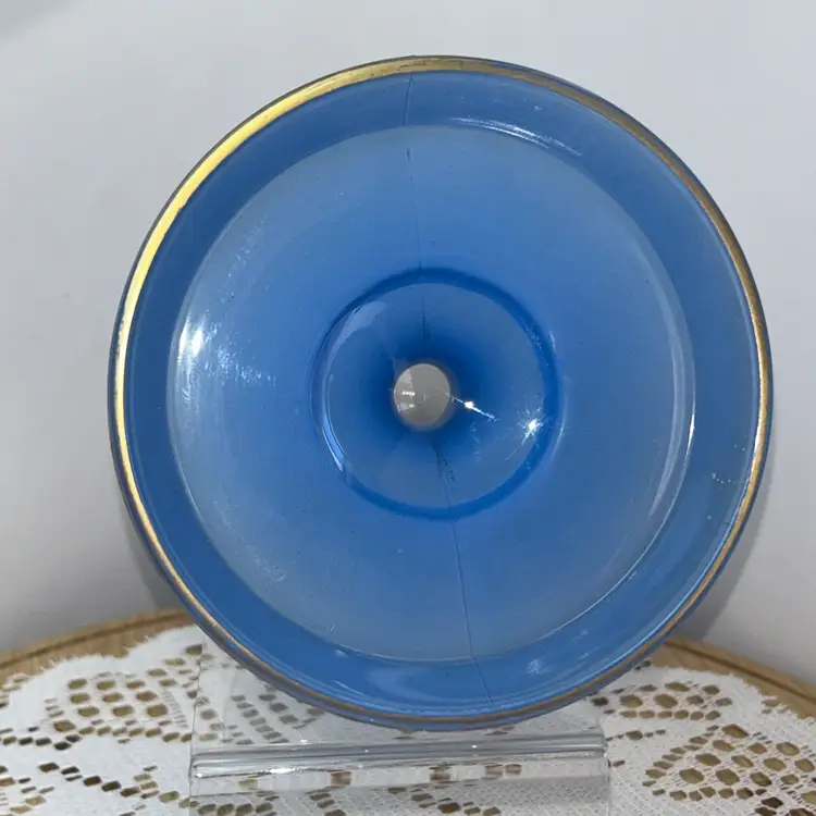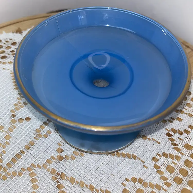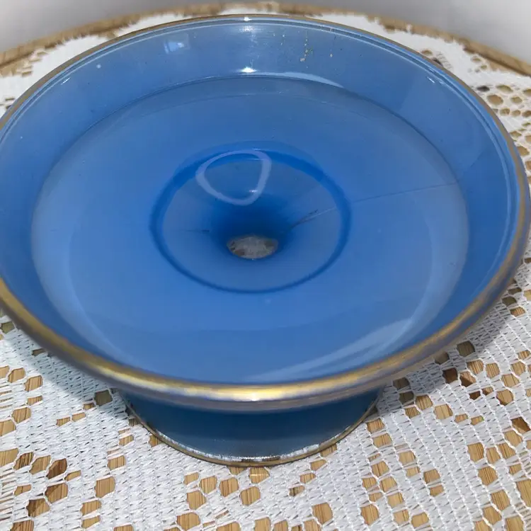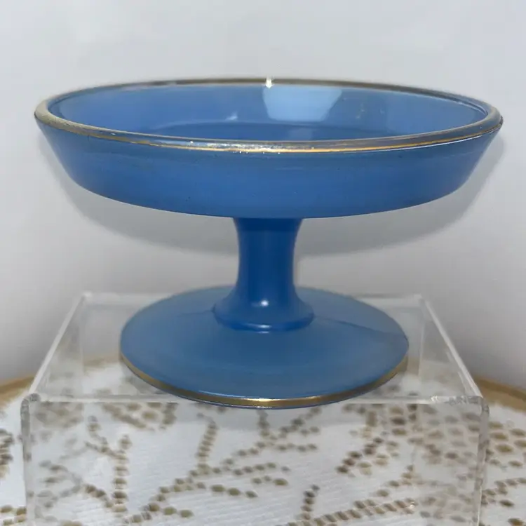 Dish is pressed glass, that is flashed in the blue color. It is edged in gold around the top edge, as well as around the outside of the pedestal. It stands 2.75” tall, top is 4.75” in diameter. Base of pedestal is 3 3/8” in diameter. Excellent condition with one small area of flat wear, very little gold wear.