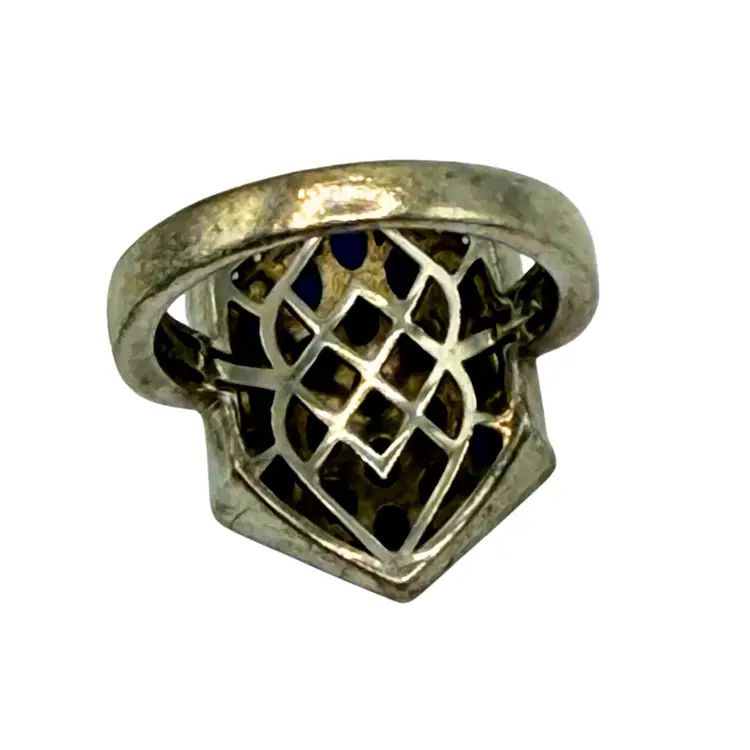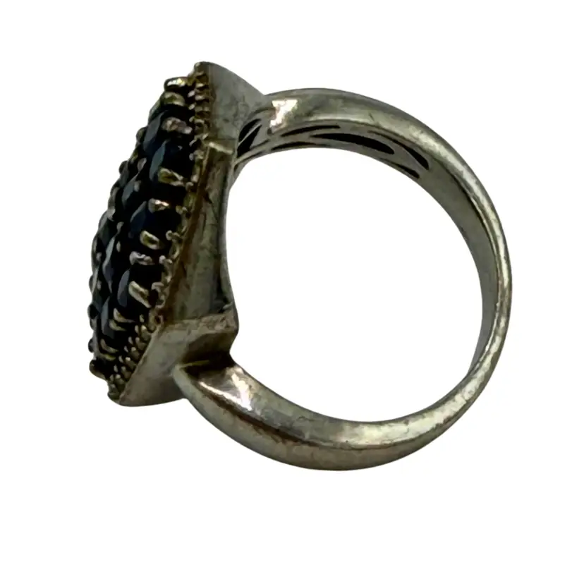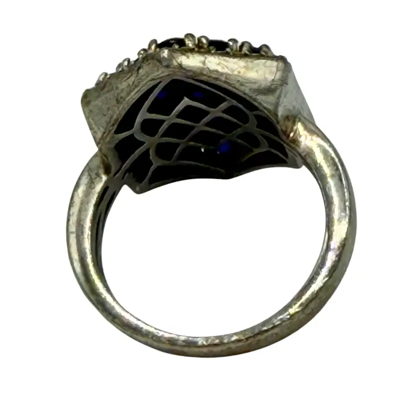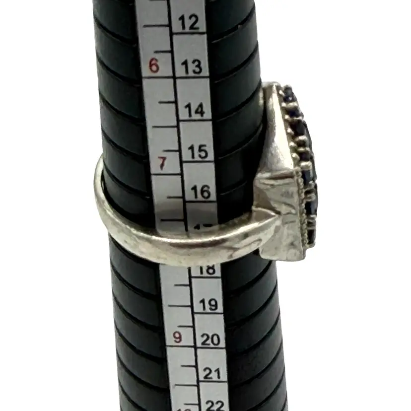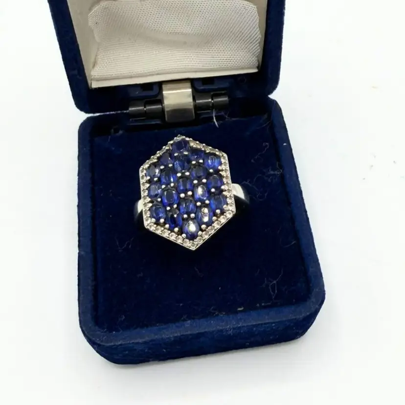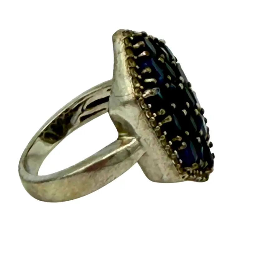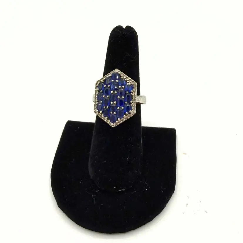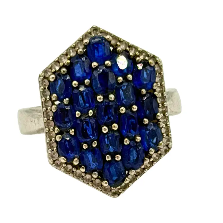 Vintage Sapphire Blue Cluster Ring Hexagon 925 Silver Size 8 Fashion Statement Ring Halo Border Bold Cocktail Ring Geometric Jewelry Gift for Her