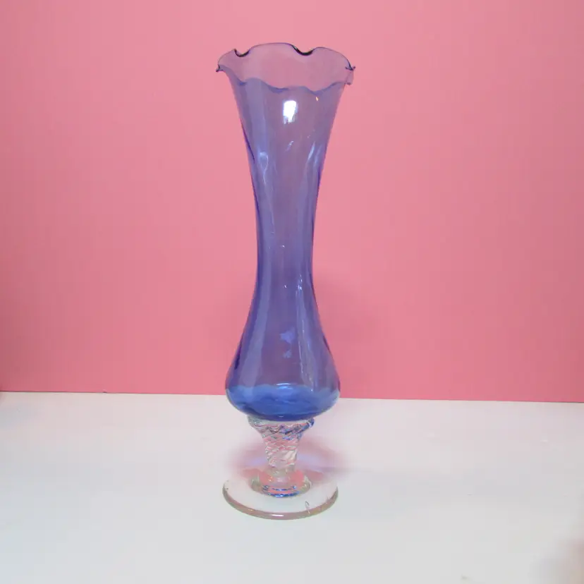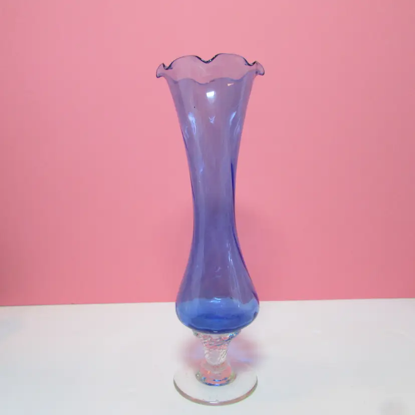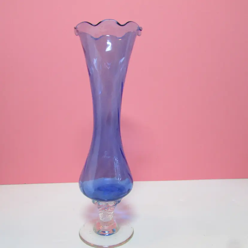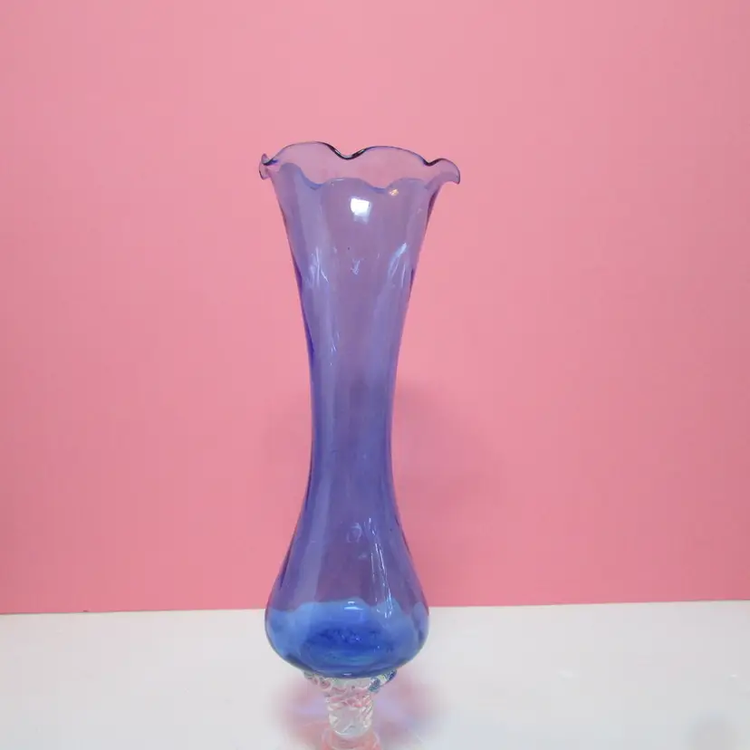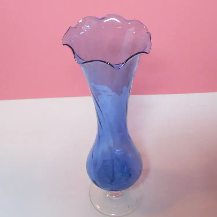 This lovely vase has some wear, it looks like a strand of extra glass is on the base, does not affect the piece. It is about 7 3/4" x 3 1/2" round base. This is shipped from a smoke free home. Thanks for looking!