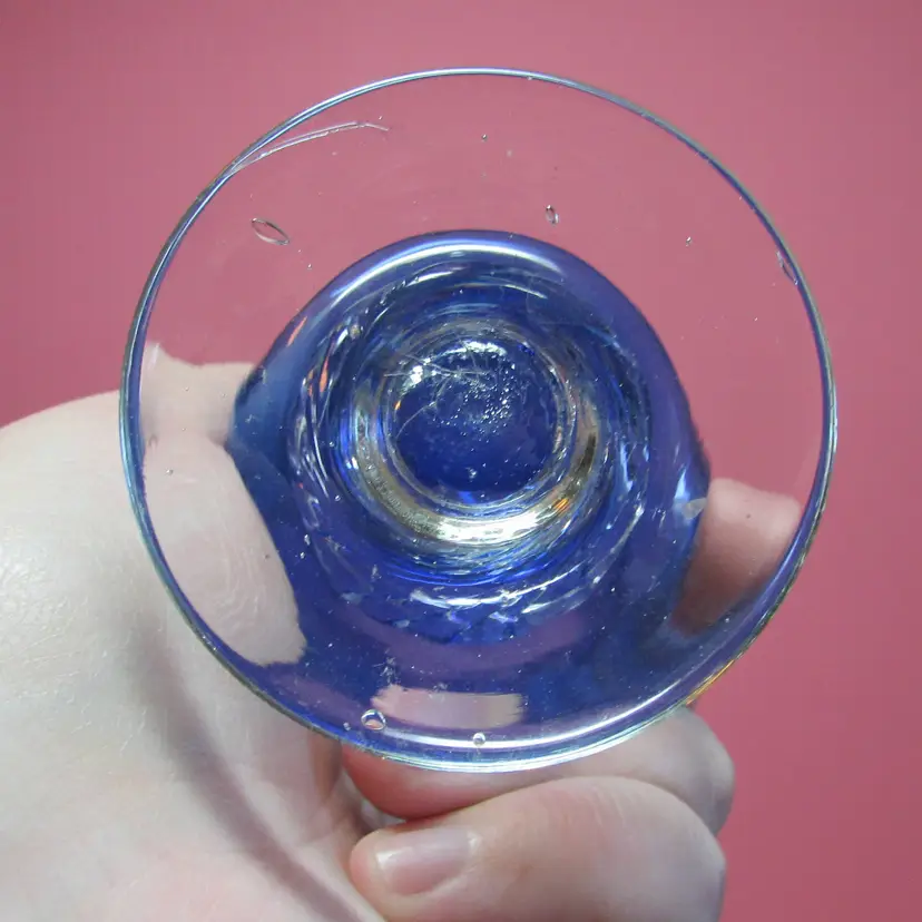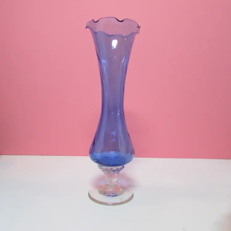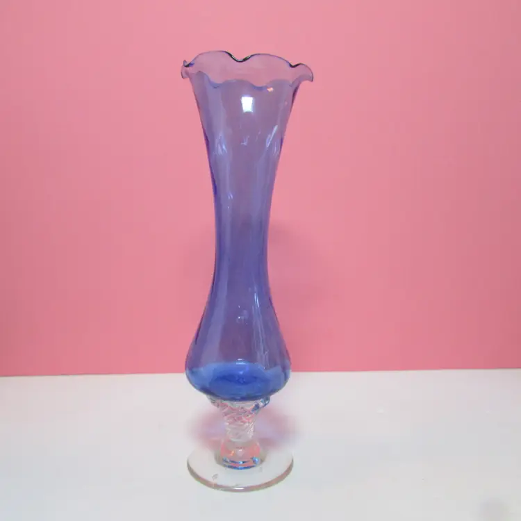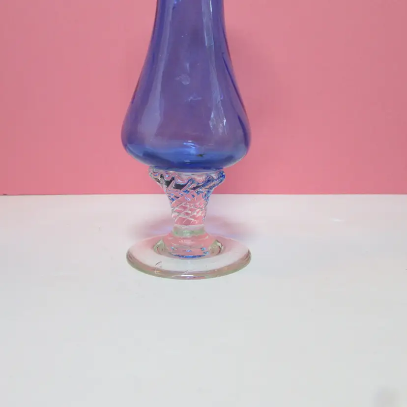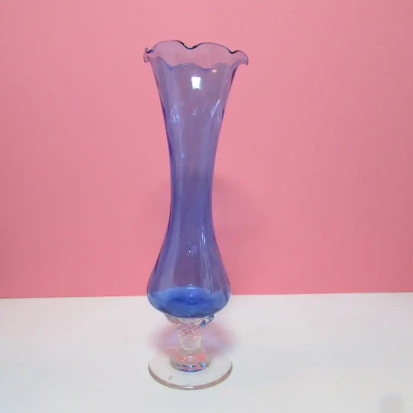 This lovely vase has some wear, it looks like a strand of extra glass is on the base, does not affect the piece. It is about 7 3/4" x 3 1/2" round base. This is shipped from a smoke free home. Thanks for looking!
