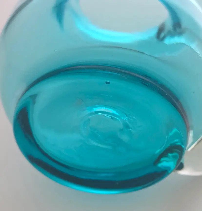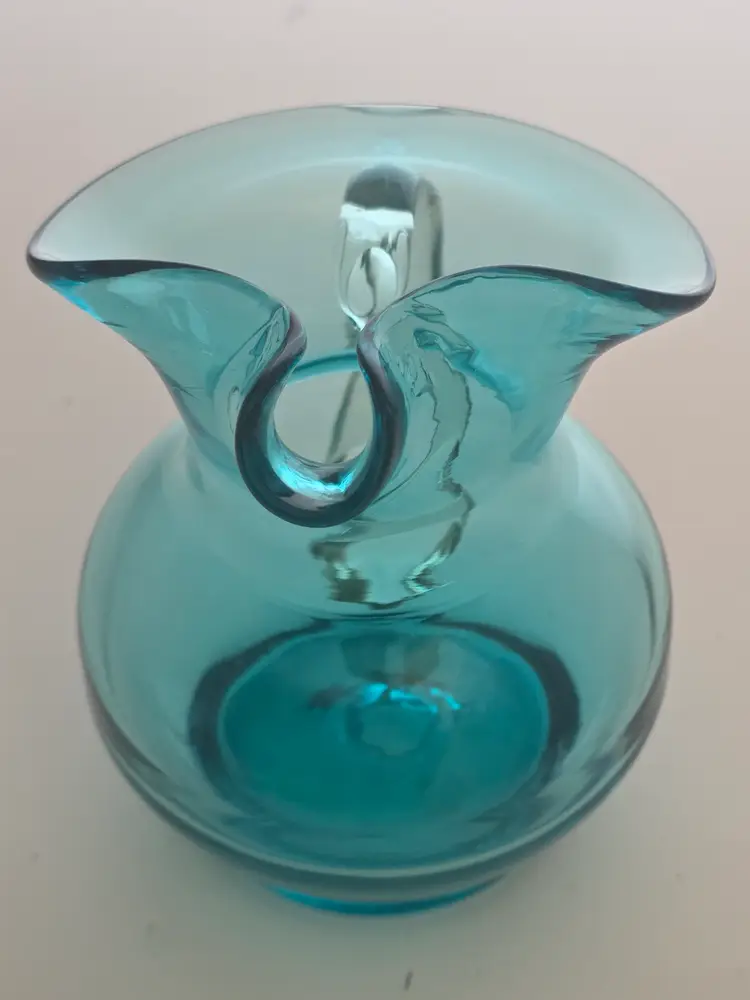 Charming vintage blue glass pitcher with a unique flared spout. Perfect for serving or display. Measures approximately 8" high.
