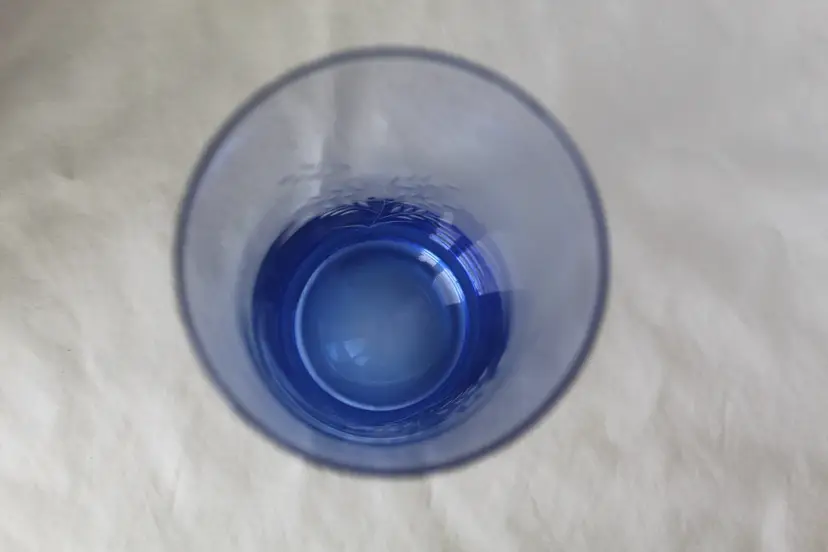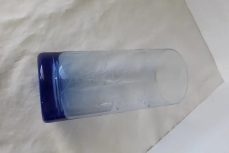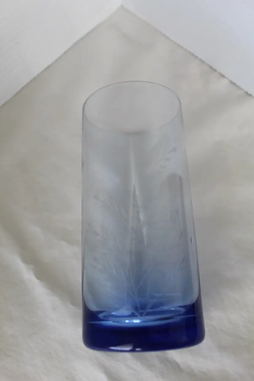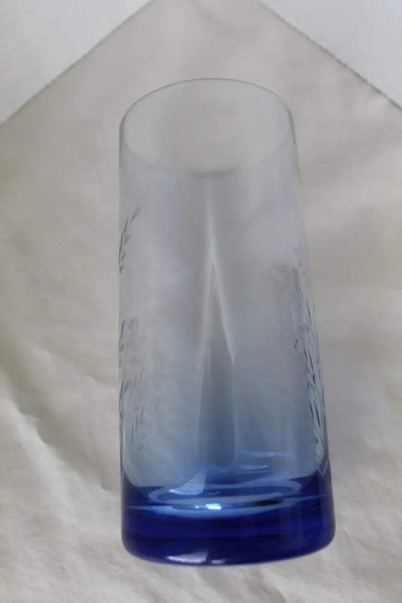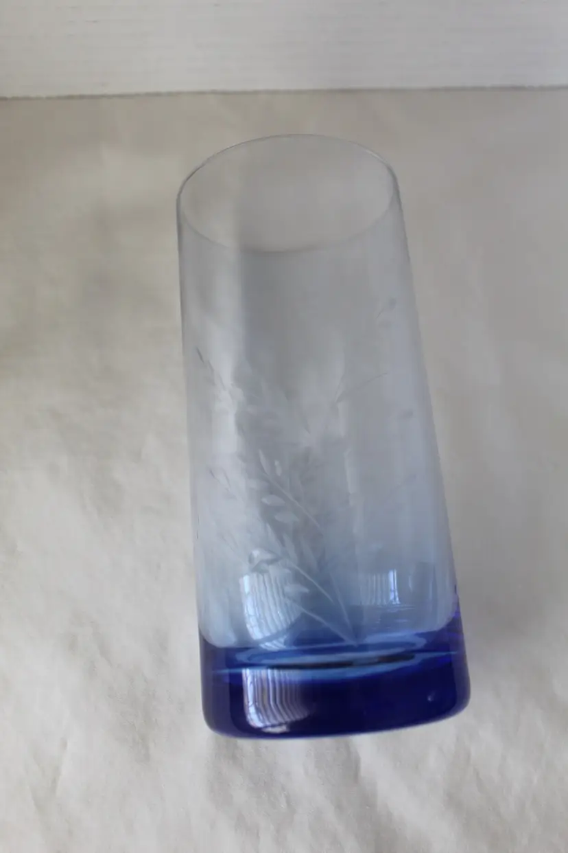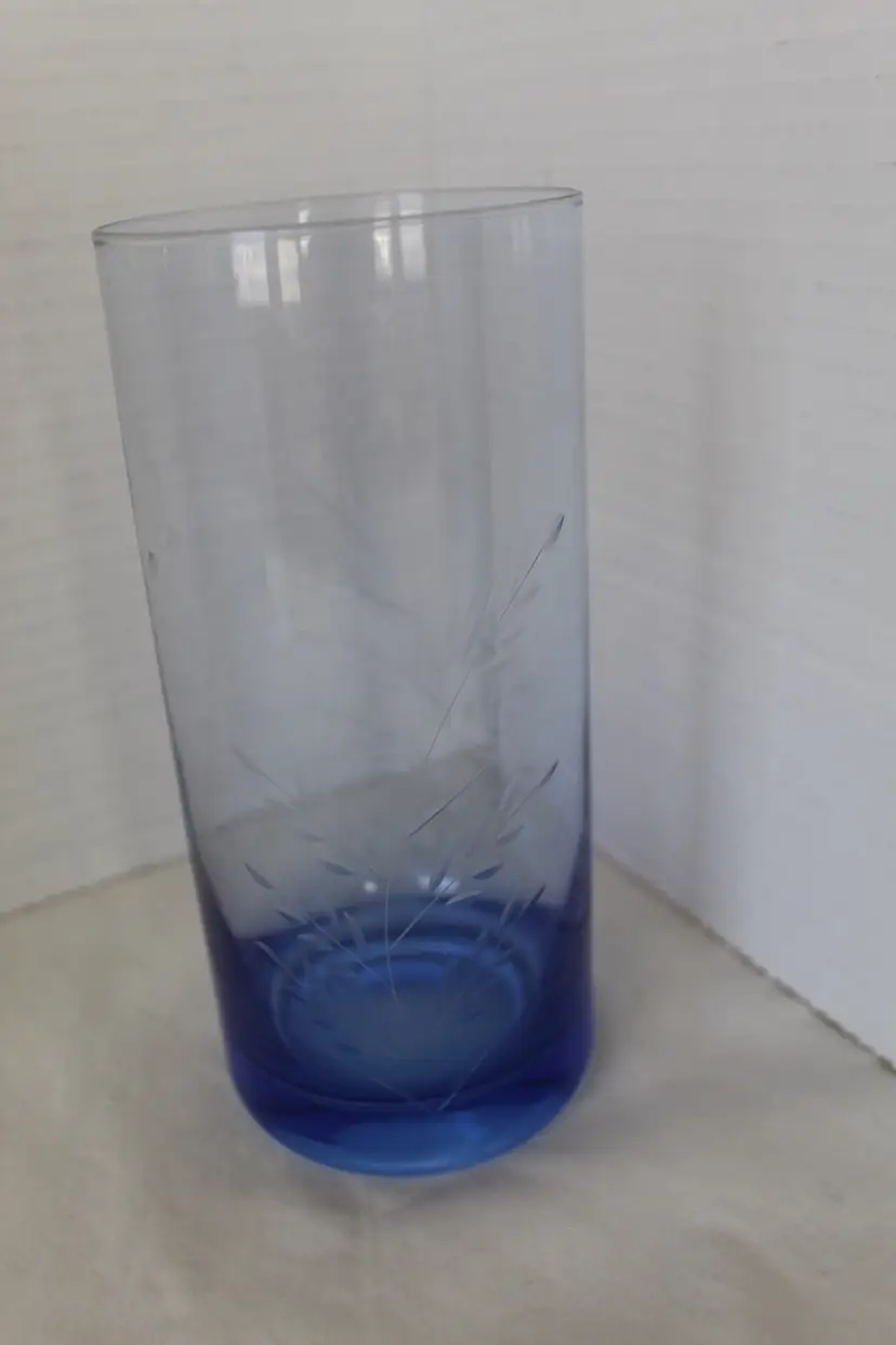 These Vintage MCM Blue Glass Tumblers are a set of 4, each featuring an elegant etched wheat design. Made of glass, these round tumblers hold 18 oz and are perfect for all occasions. The weighted bases are another nice feature. The blue color and vintage style add a touch of charm to any table setting. These tumblers are a unique addition to your drinkware collection. Remember to hand wash only to preserve their intricate design.