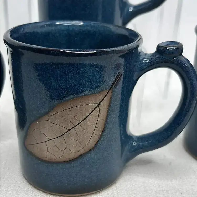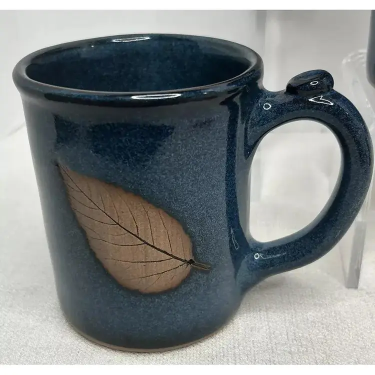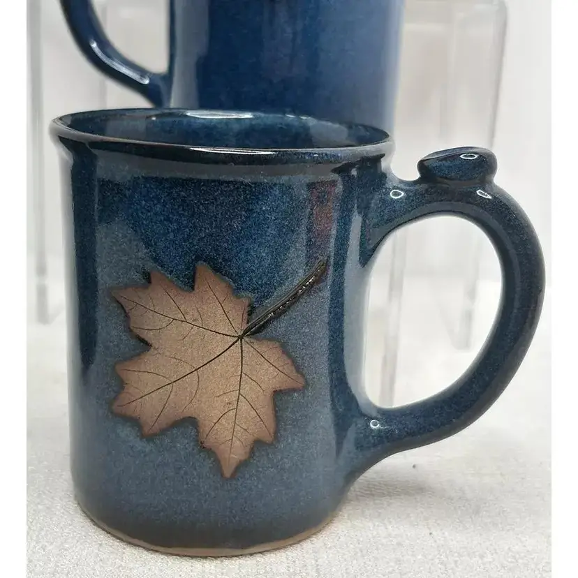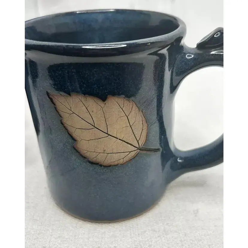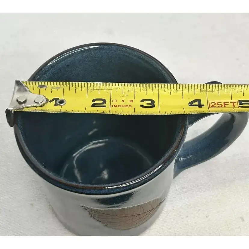 Each mug/cup is beautifully hand crafted and glazed inside and out. Each vintage blue glazed pottery coffee mug/cup has a different autumn leaf, its signed M.J. or Mary Jane and dated '04 or 2004. Each of these cup/mug measures 4" inches in height 4.5" inches wide including the handle, weighs about 1 pound and can hold about 12 ounces of your favorite hot or cold beverage. Each mug/cup will display beautifully and will also hold your favorite hot or cold beverage. Vintage Blue Glazed Pottery Leaf Coffee Mug/Cup Signed & Dated ~ 5 available ~ Each individual cup is in excellent pre-owned condition, with NO chips, cracks or repairs. Please review all pictures for proper assessment of each cups vintage pre-owned condition.