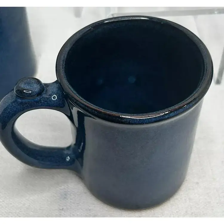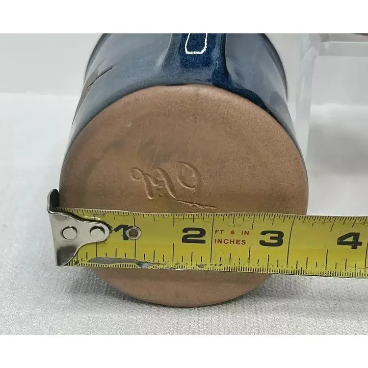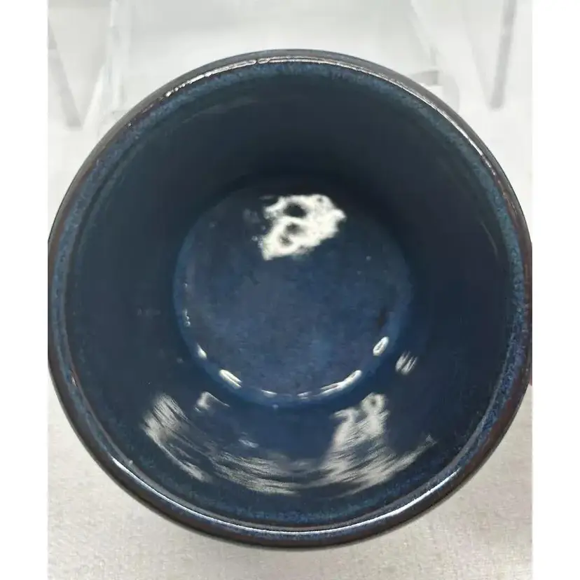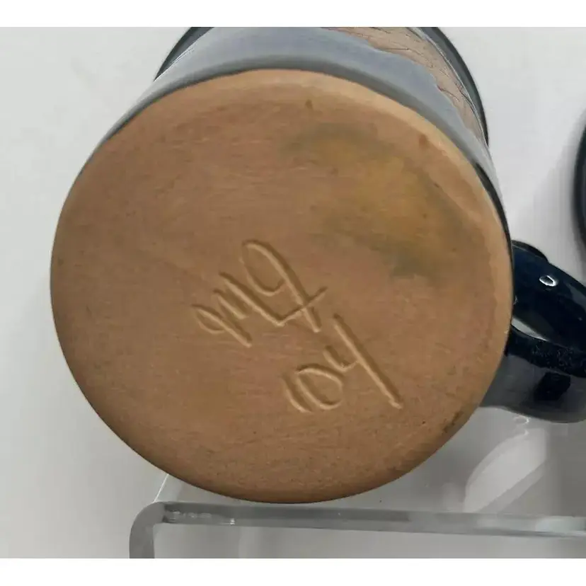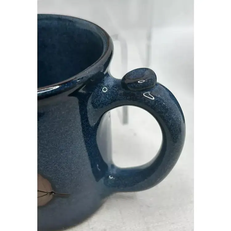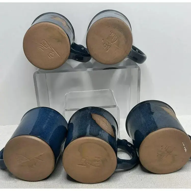 Each mug/cup is beautifully hand crafted and glazed inside and out. Each vintage blue glazed pottery coffee mug/cup has a different autumn leaf, its signed M.J. or Mary Jane and dated '04 or 2004. Each of these cup/mug measures 4" inches in height 4.5" inches wide including the handle, weighs about 1 pound and can hold about 12 ounces of your favorite hot or cold beverage. Each mug/cup will display beautifully and will also hold your favorite hot or cold beverage. Vintage Blue Glazed Pottery Leaf Coffee Mug/Cup Signed & Dated ~ 5 available ~ Each individual cup is in excellent pre-owned condition, with NO chips, cracks or repairs. Please review all pictures for proper assessment of each cups vintage pre-owned condition.