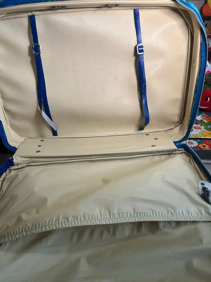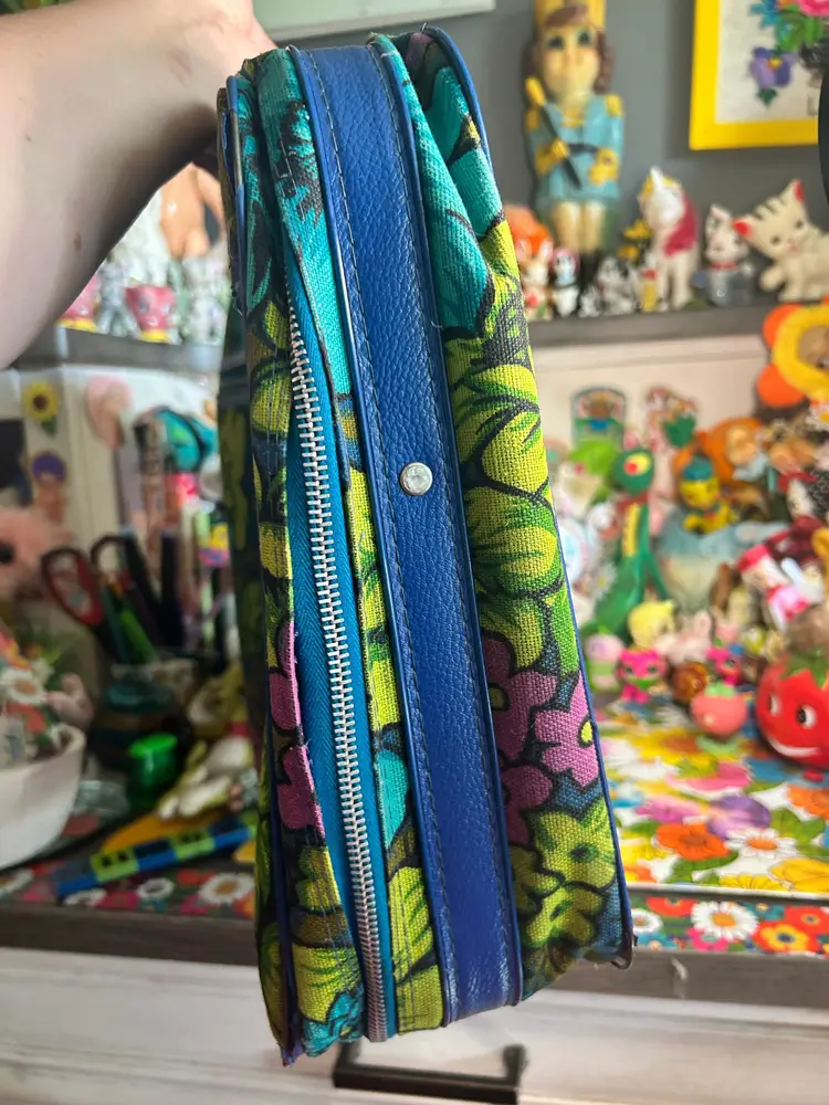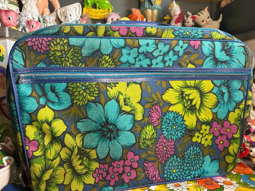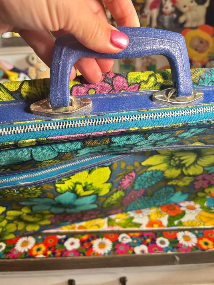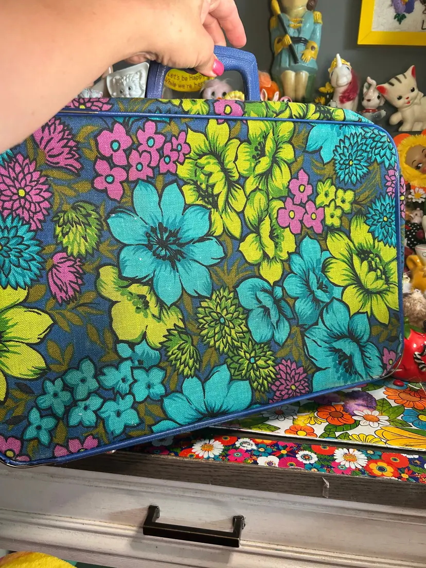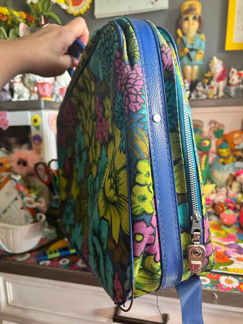 For sale! Vintage Blue, Green and Purple Travel Suitcase! 18 x 12 x 5 inches. All zippers work. Handle is tight
