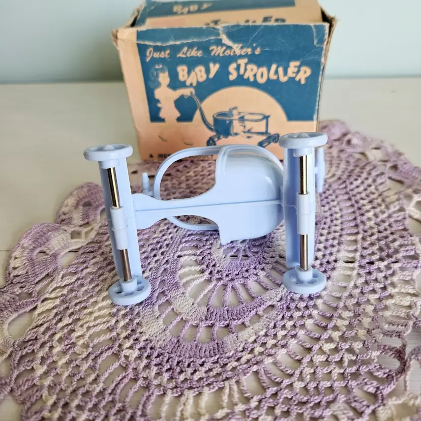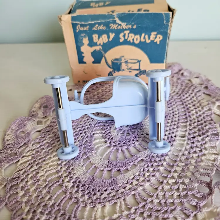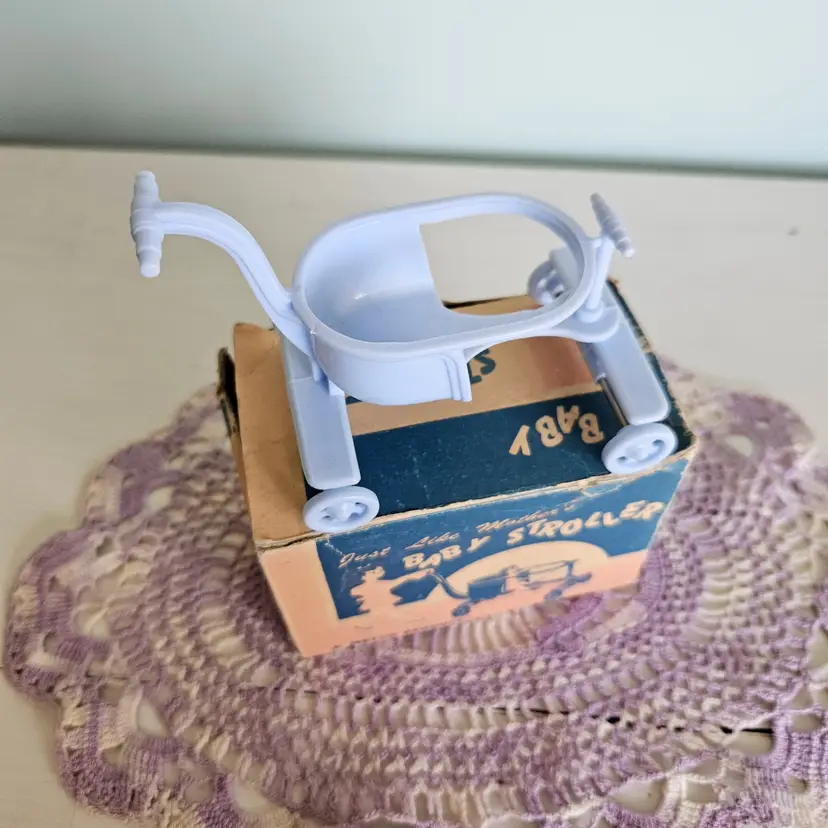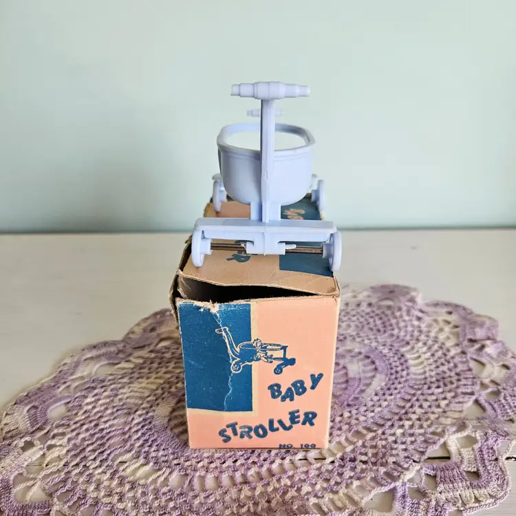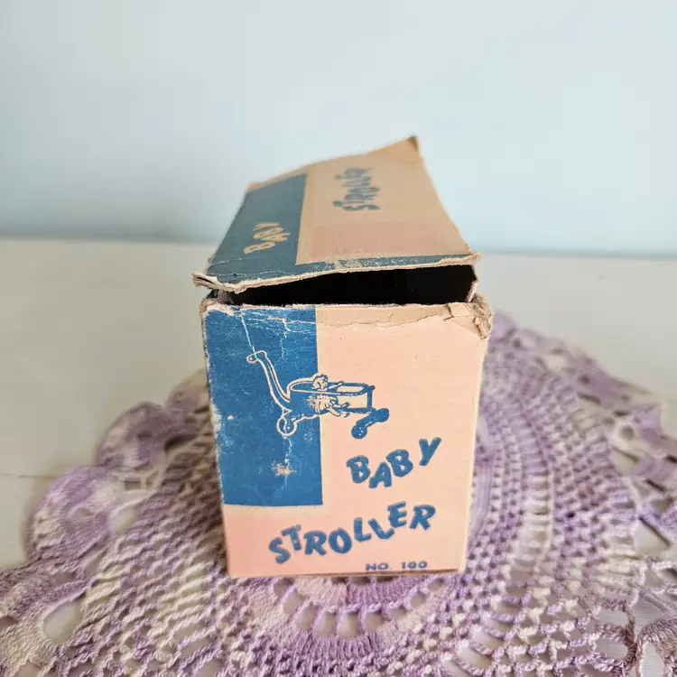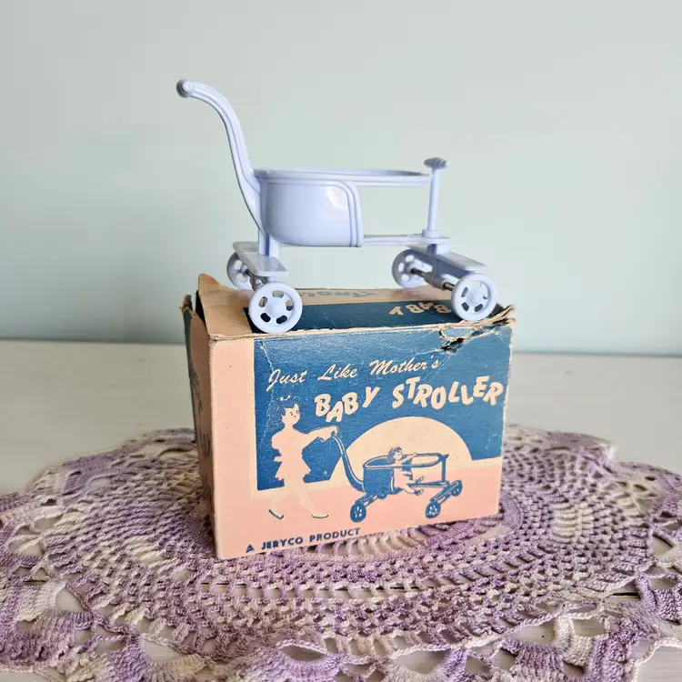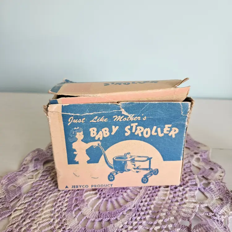 Adroable little doll stroller with original box! Comes with a blue stroller. The box says "A Jeryco Product" and has wear and tear on it as seen on photos. Measurement: Box - 4.25" W x 2.25" D x 3" H Stroller - 3.75" W x 3" H