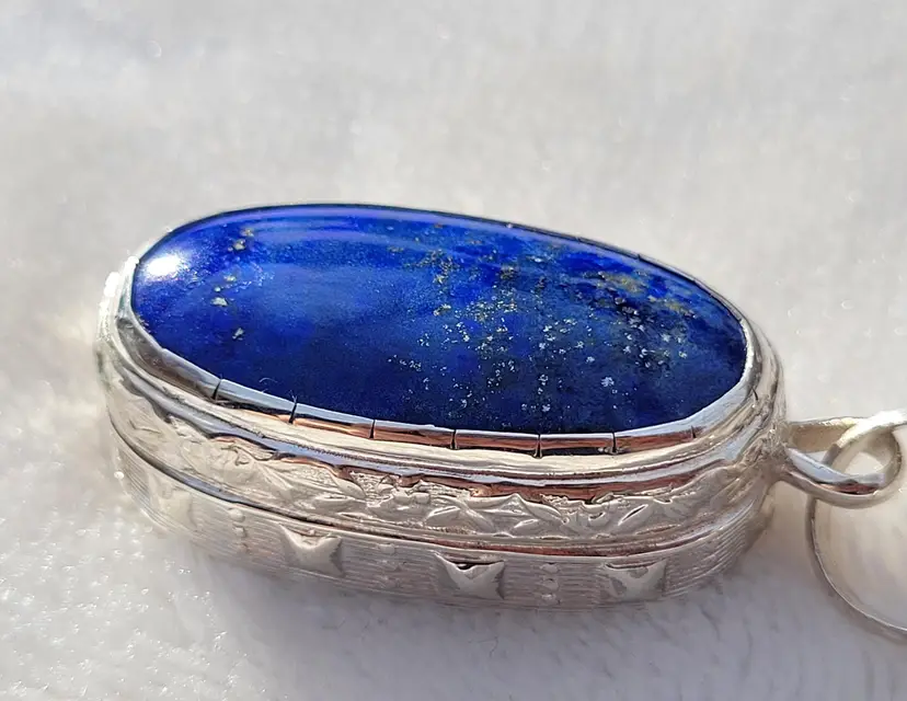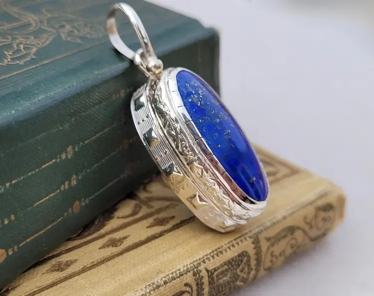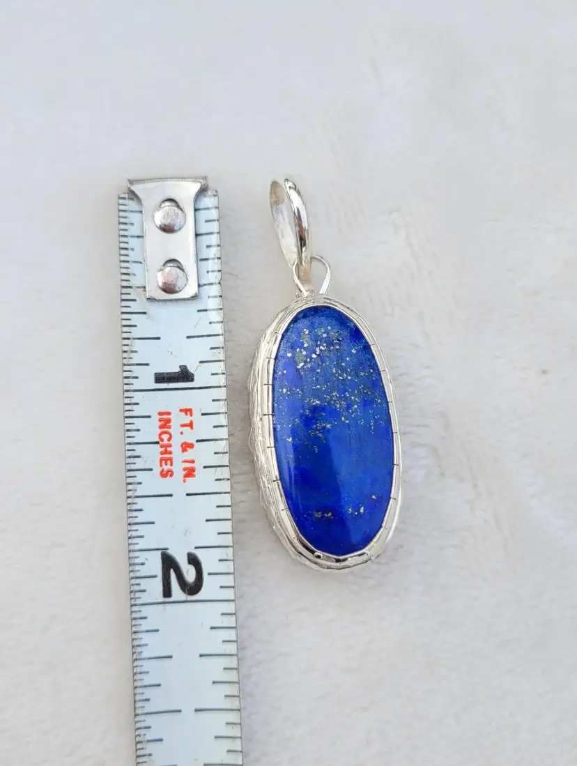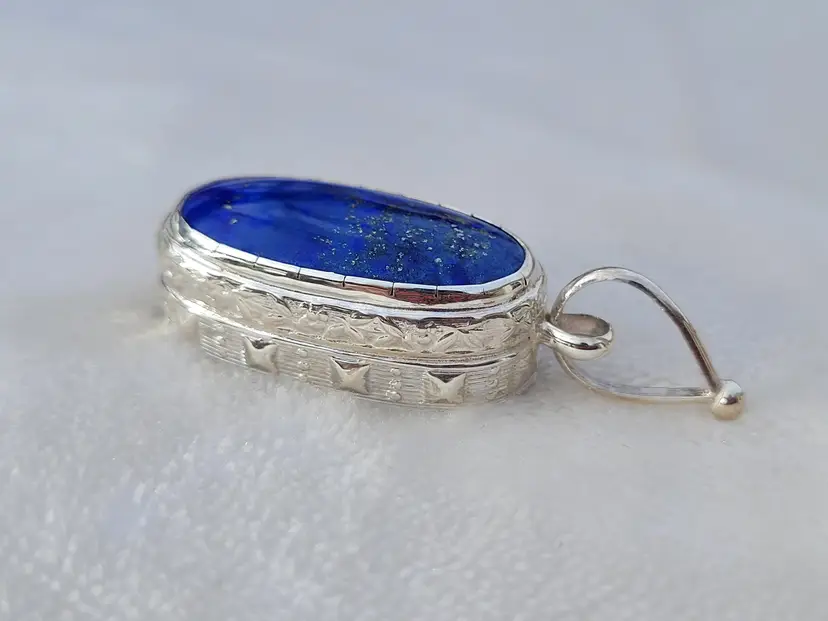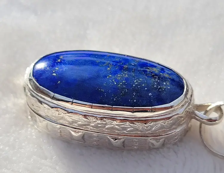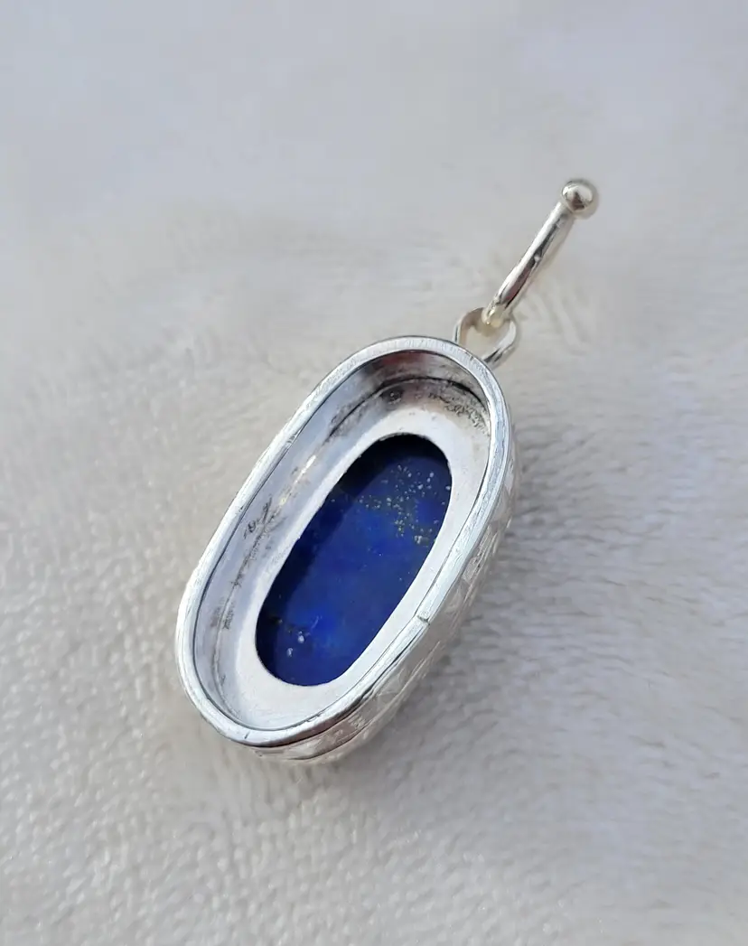 Vibrant blue lapis cabachon set in pure 900 silver, from an estate and circa 1990s. It is in good condition, please see pictures for details and measurements. Does not include a chain.