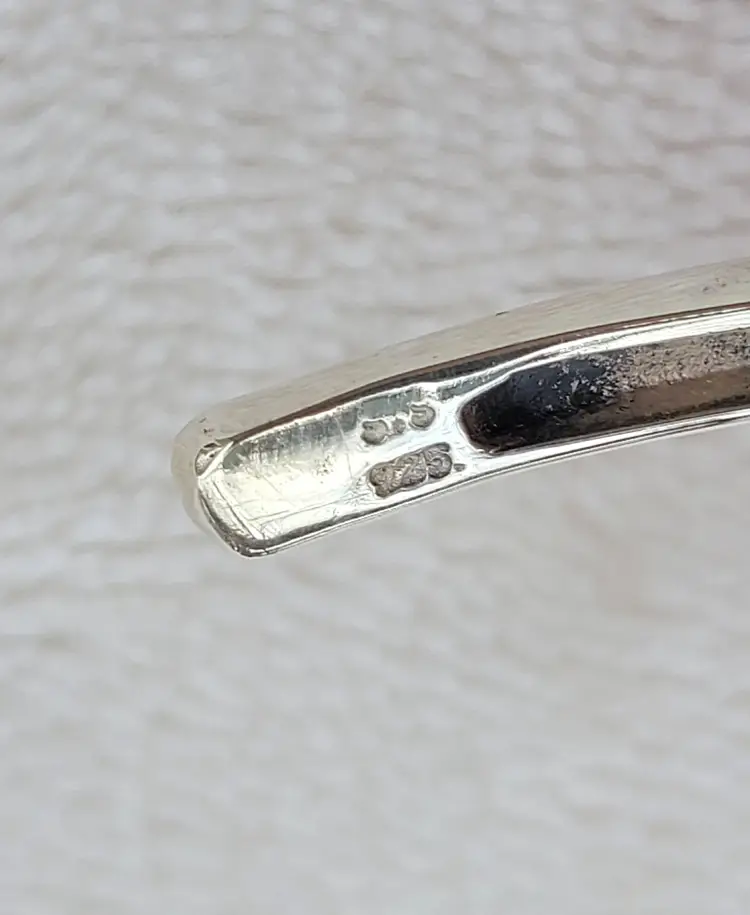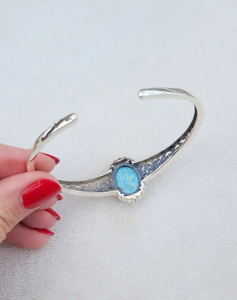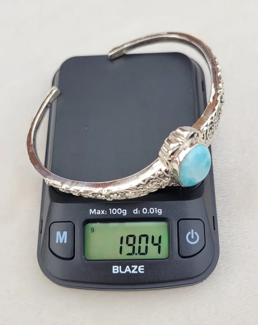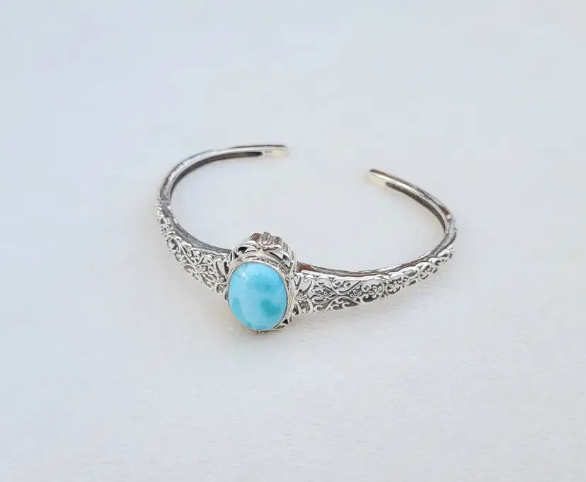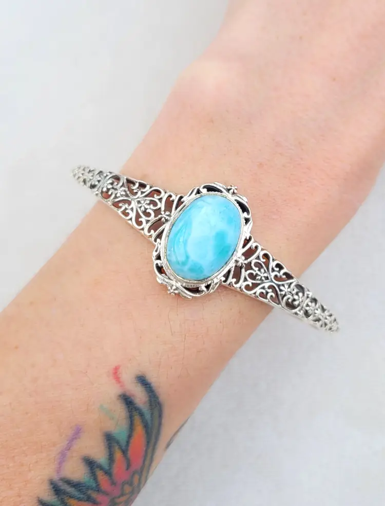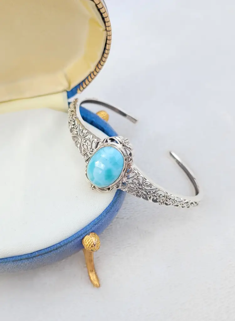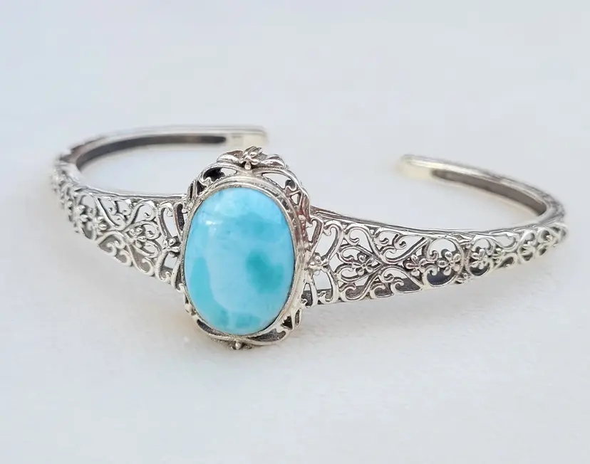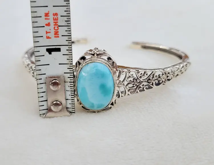 Beautiful filigree cuff bracelet with a dreamy blue larimar cabachon! This is from an estate and circa 1990s, in good condition. It measures 8" in circumference including the opening. Please see pictures for details and measurements.