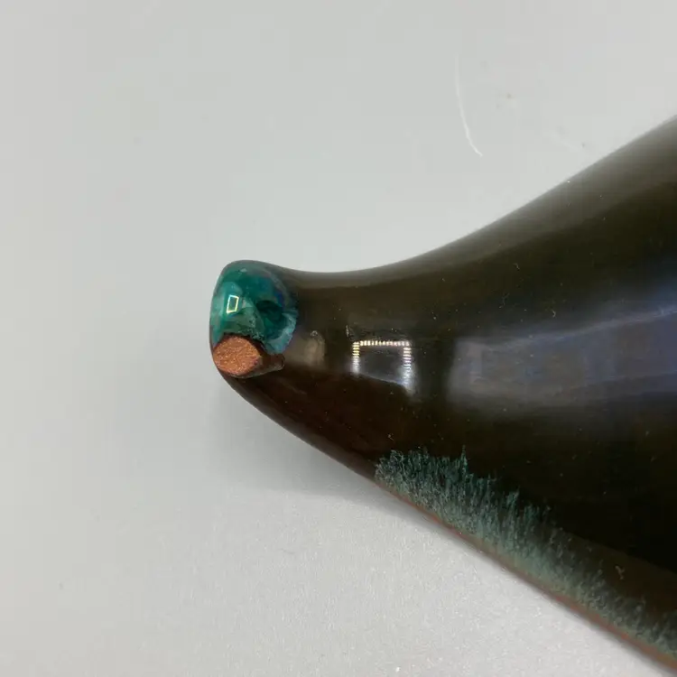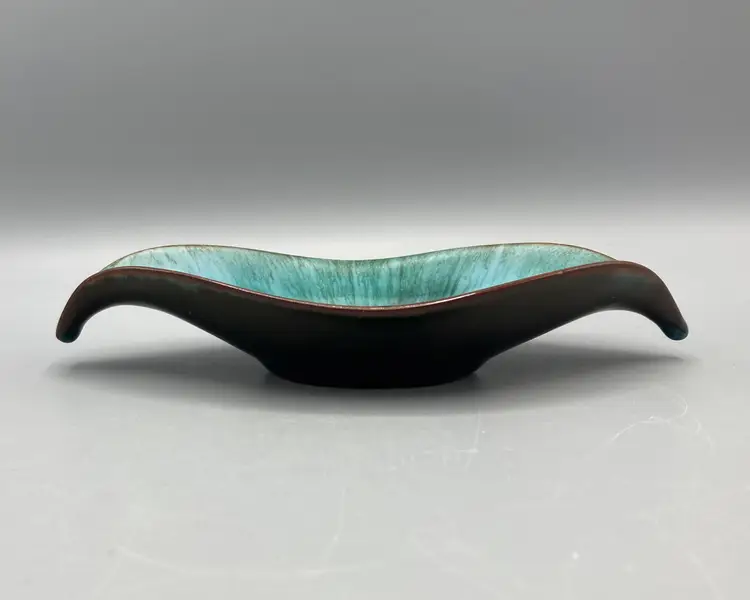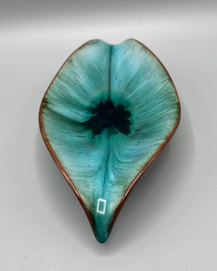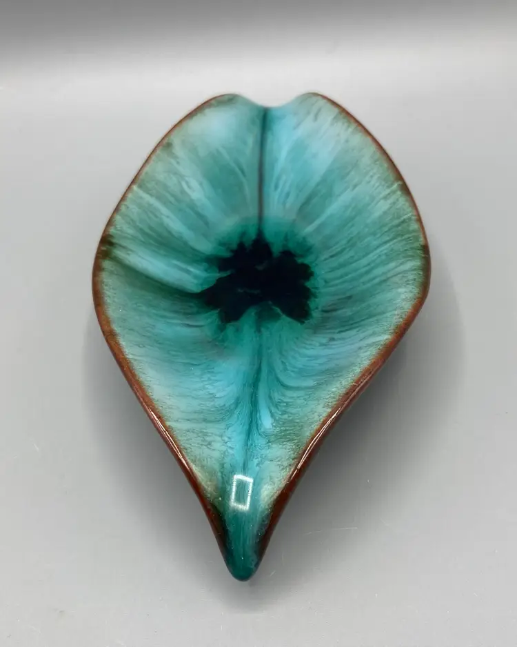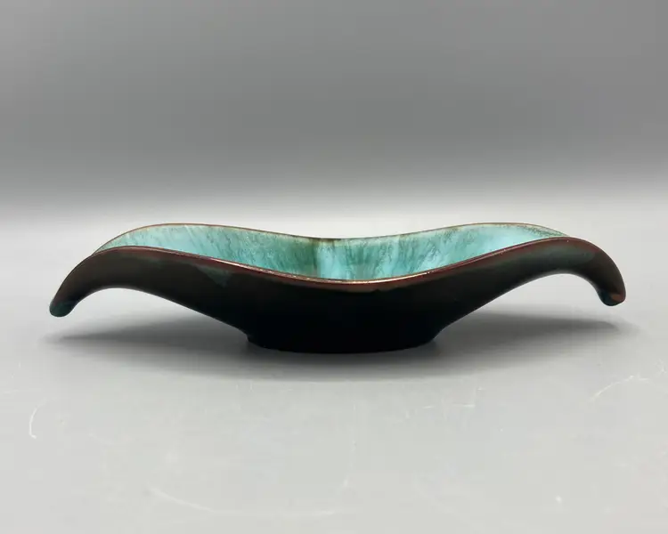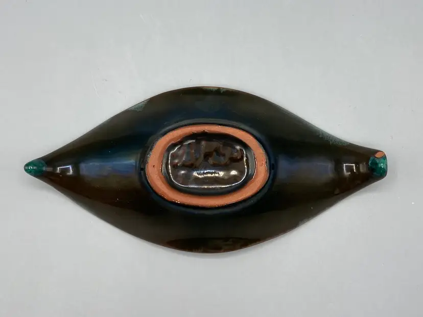 This dish is in good overall condition. There is a little part where the glaze is missing on the underside and may be a chip, it's hard for me to tell for sure, but it's only visible when looking at the dish from the underside. This spot is clearly seen in the last picture. The dish measures approximately 6 3/4" x 3 1/4" and 1 1/4" high.
