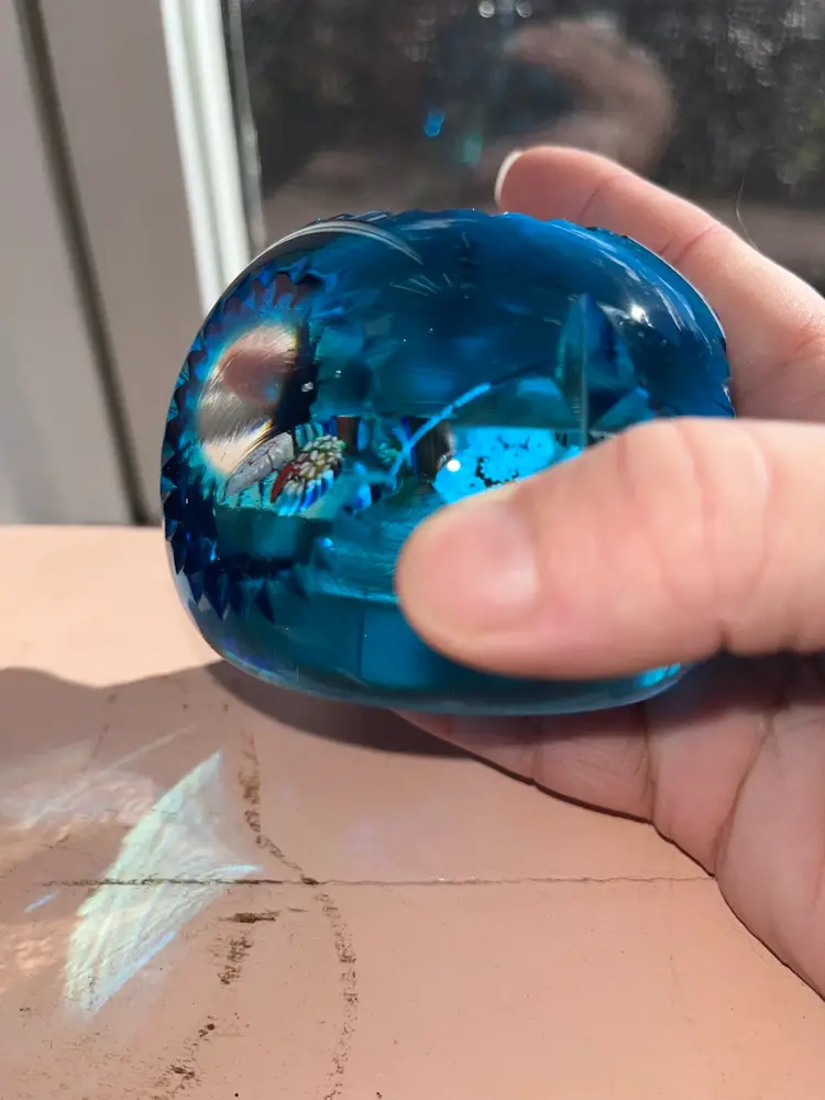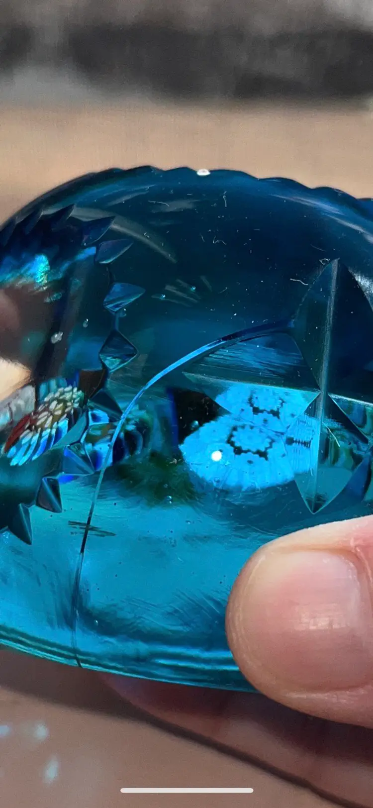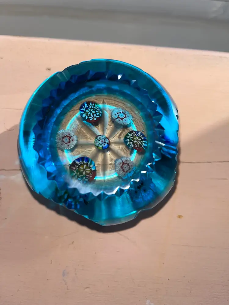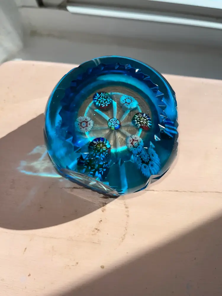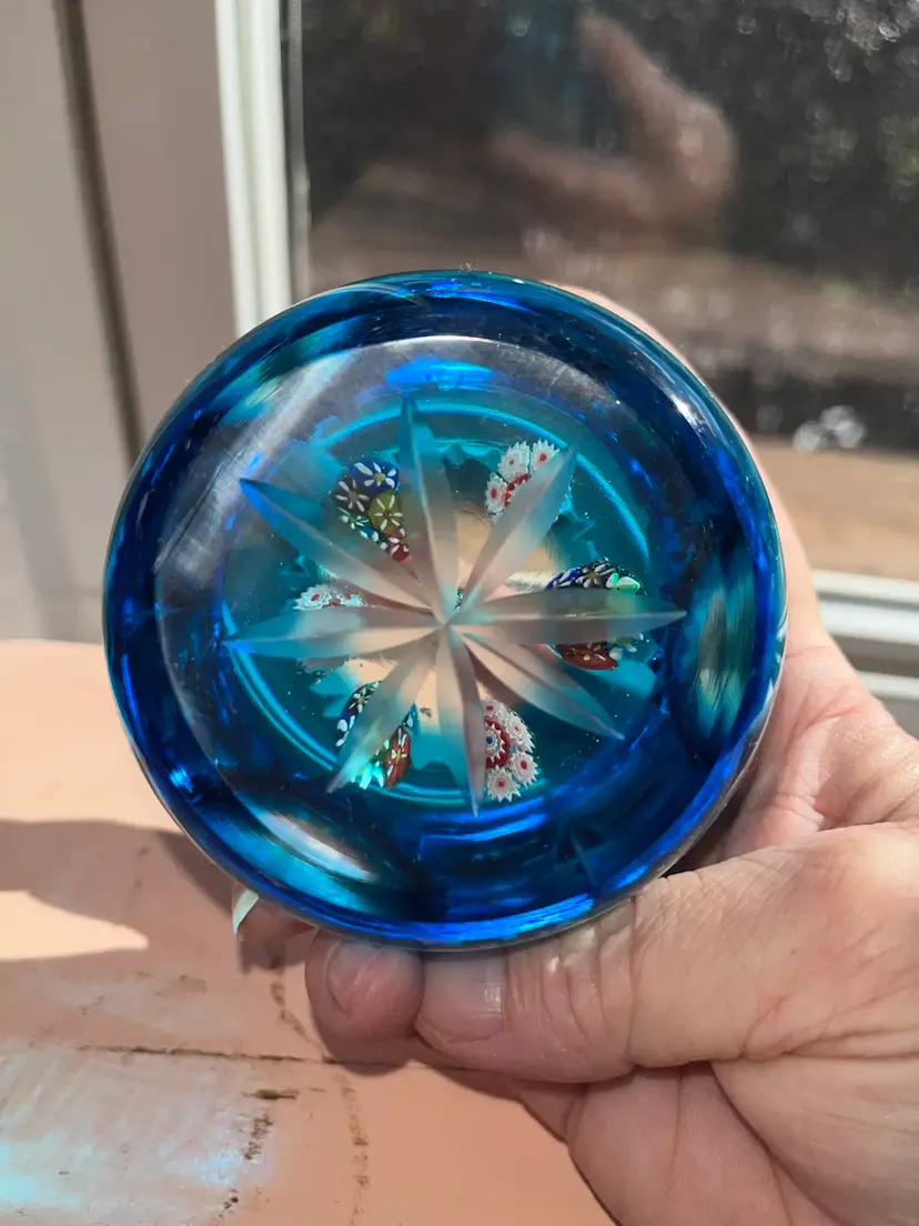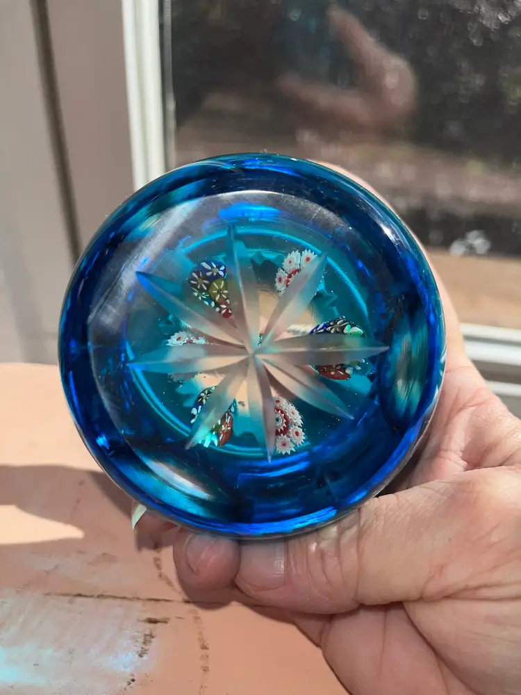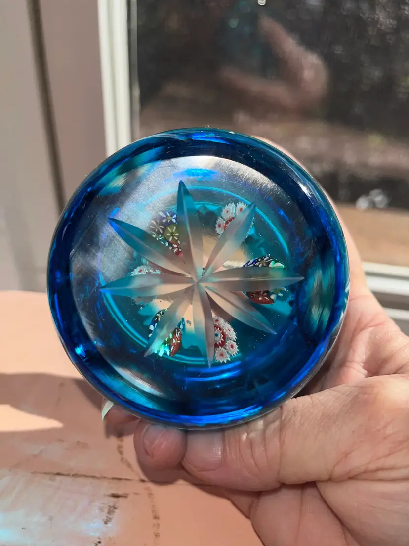 AS IS has internal fracture please refer to pics vintage blue Murano glass millefiori faceted paperweight 3.5”