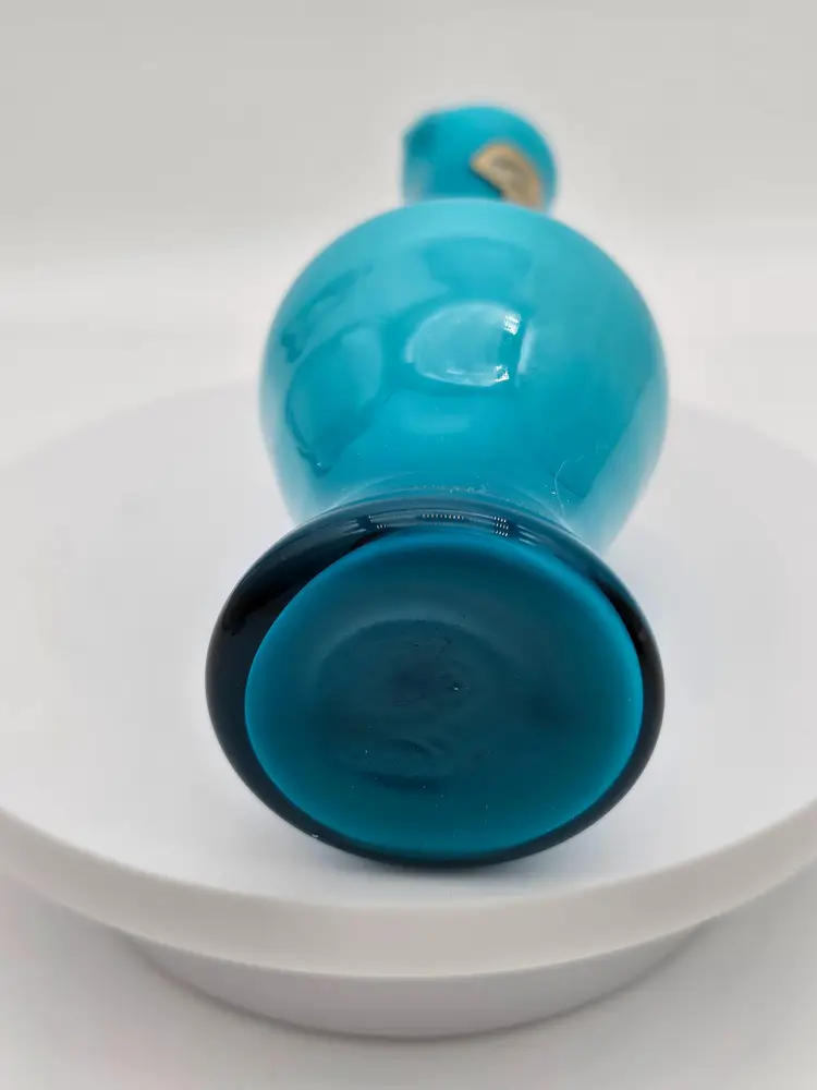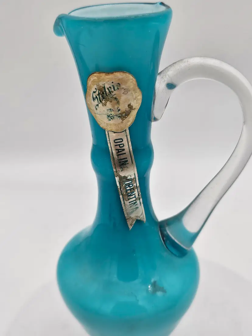 This vintage Empoli glass ewer is a stunning piece of Italian art glass. The blue opaline glass has been hand-molded and hand-blown, making it a unique and authentic piece. The ewer is part of the Stelvia product line and features a mid-century modern style, with decorative features that make it a perfect addition to any collection.