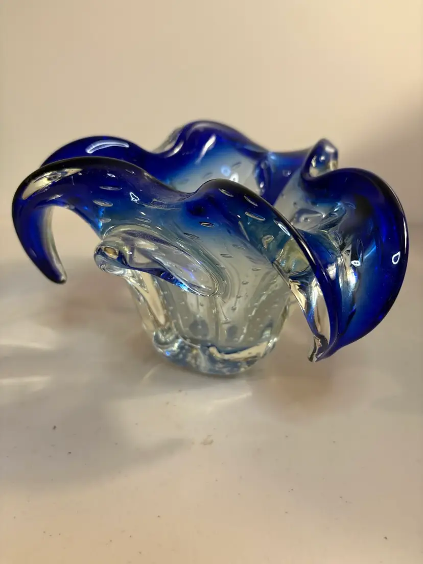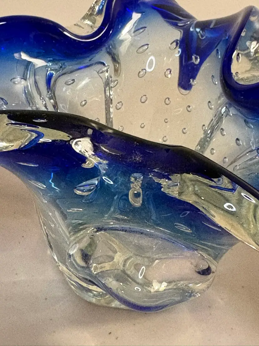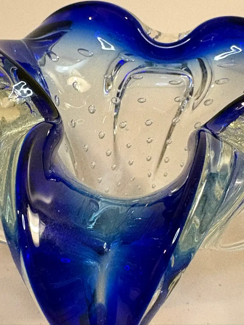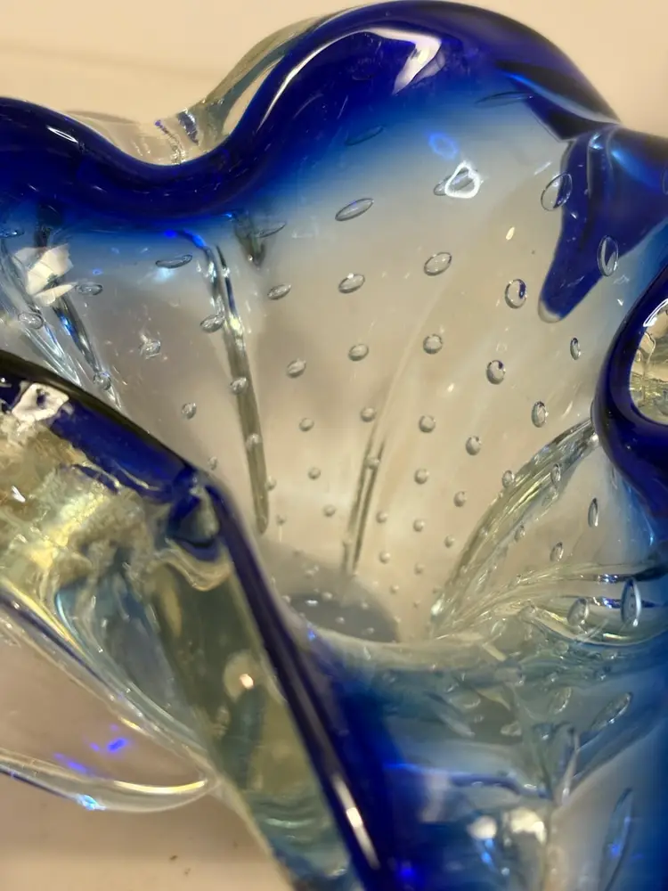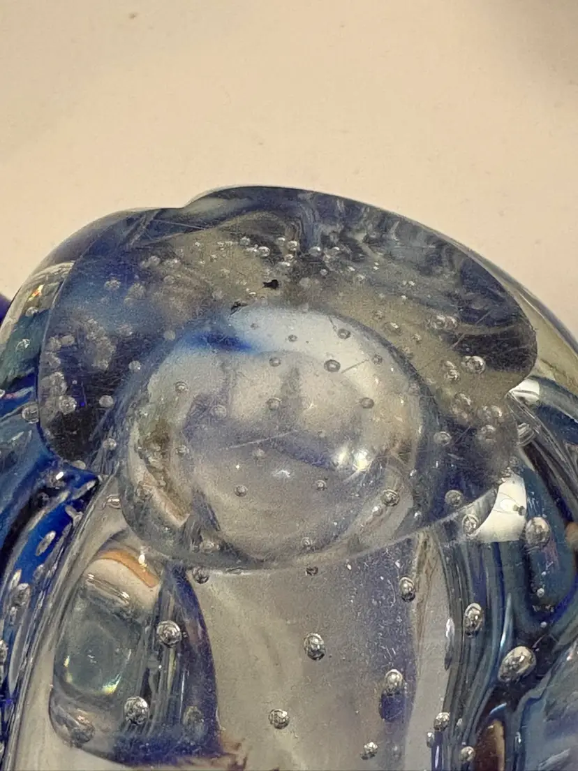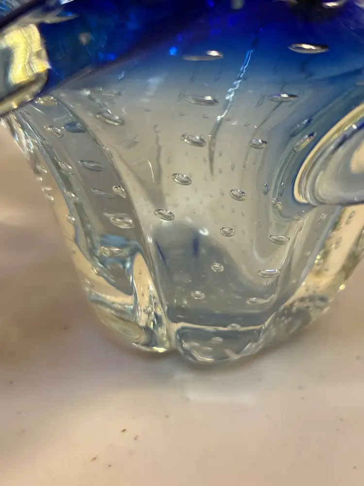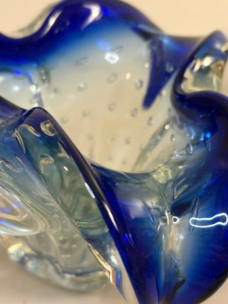 This vintage blue vase features a unique controlled bubble base, possibly originating from Murano, Italy in the 1950s. The Bullicante technique used in this piece creates a mesmerizing pattern of bubbles, adding a touch of artistry to any space. The small size and smooth finish make it a perfect addition to a collection of decorative items, with its retro design appealing to adults who appreciate mid-century aesthetics