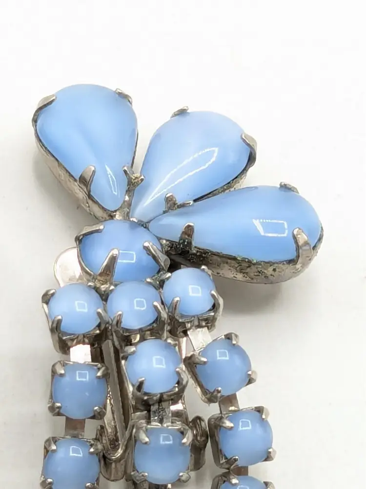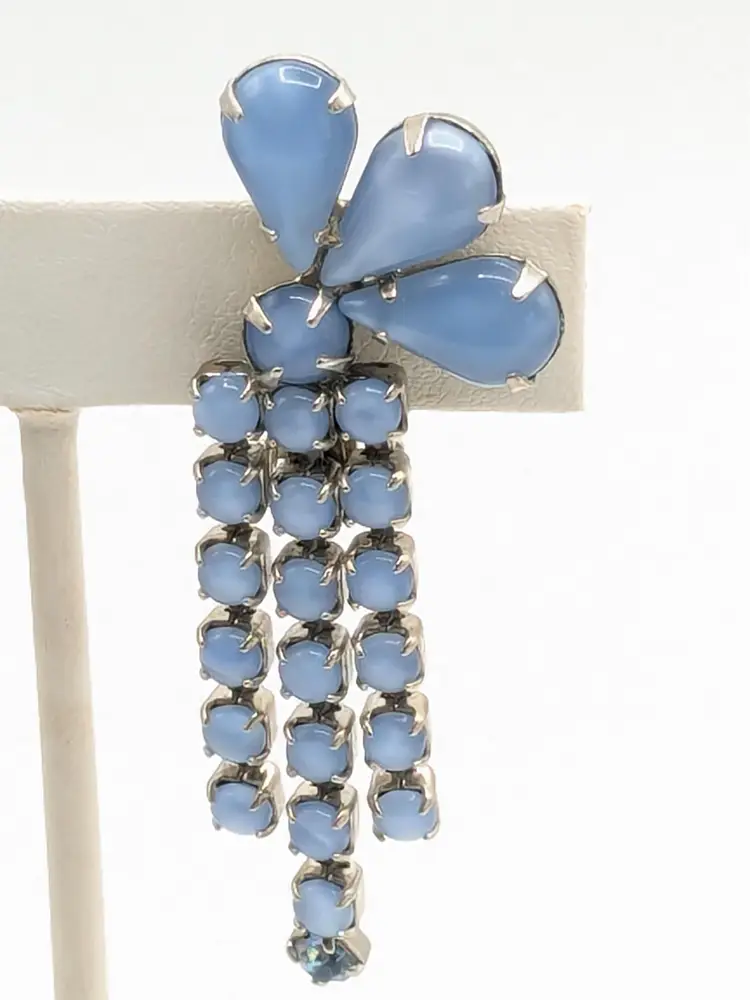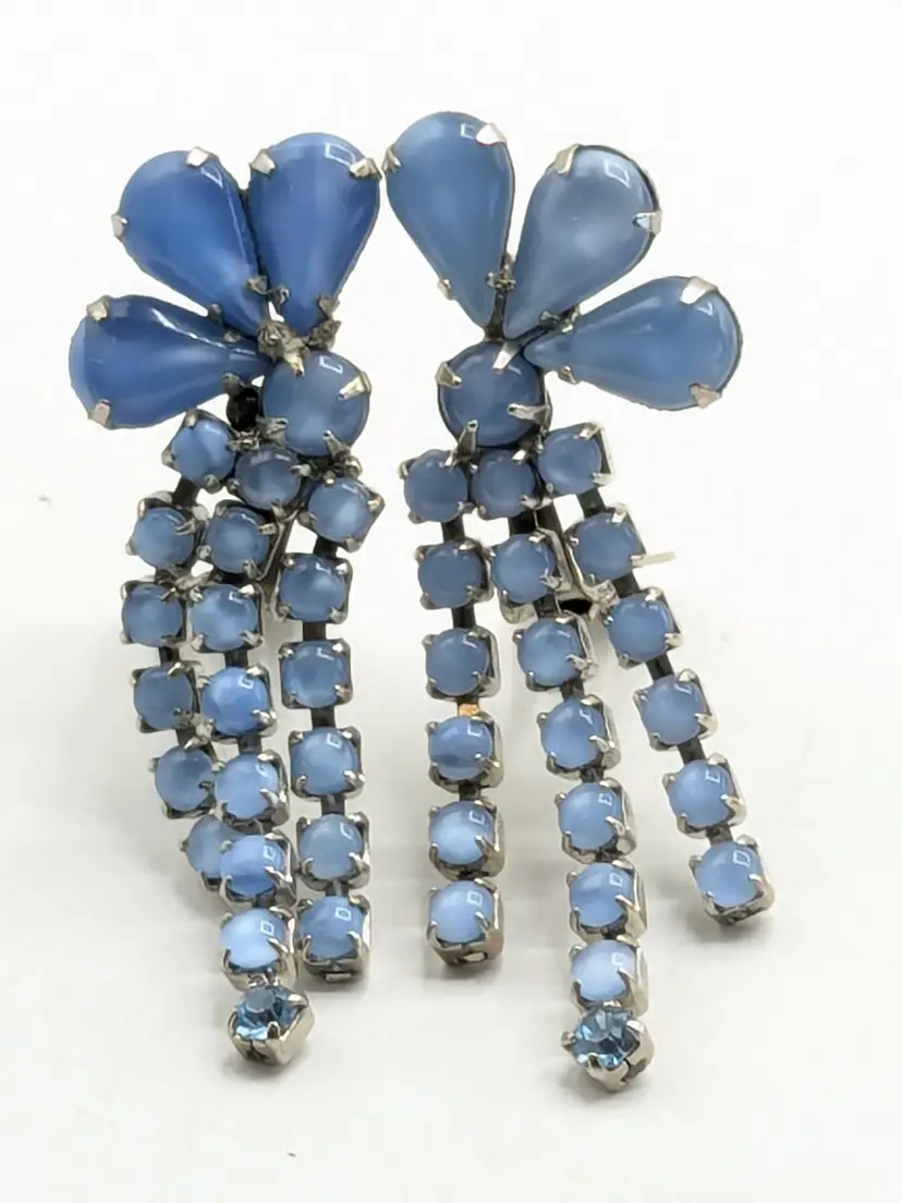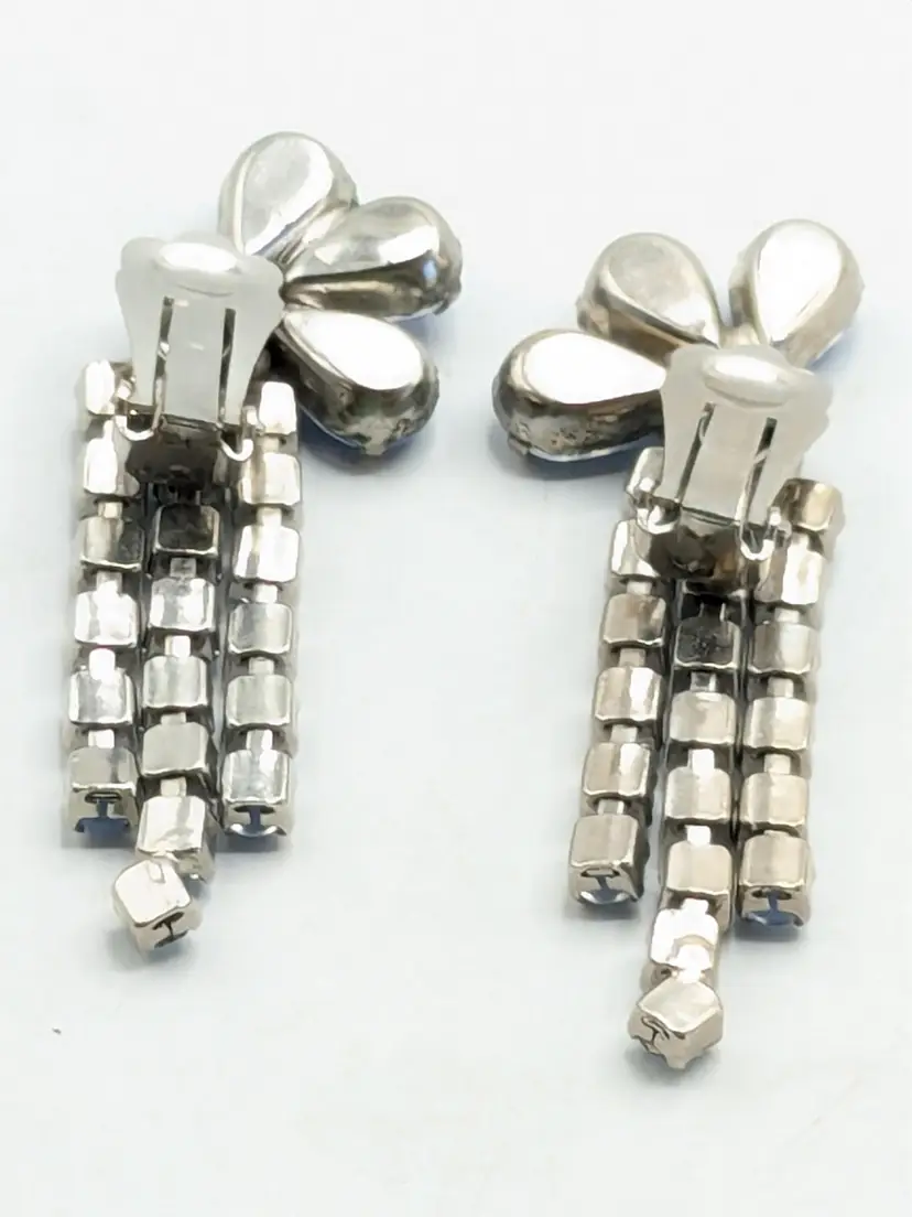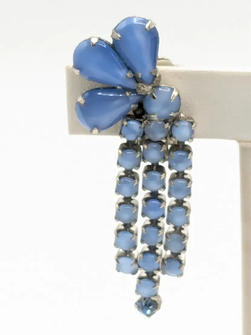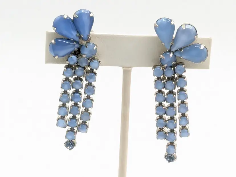 Charming vintage clip-on earrings featuring cascading blue rhinestones in a floral design. Good condition with secure clips. Measures 2 3/8" in height and 1" wide. (EN2)