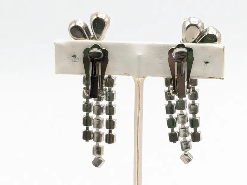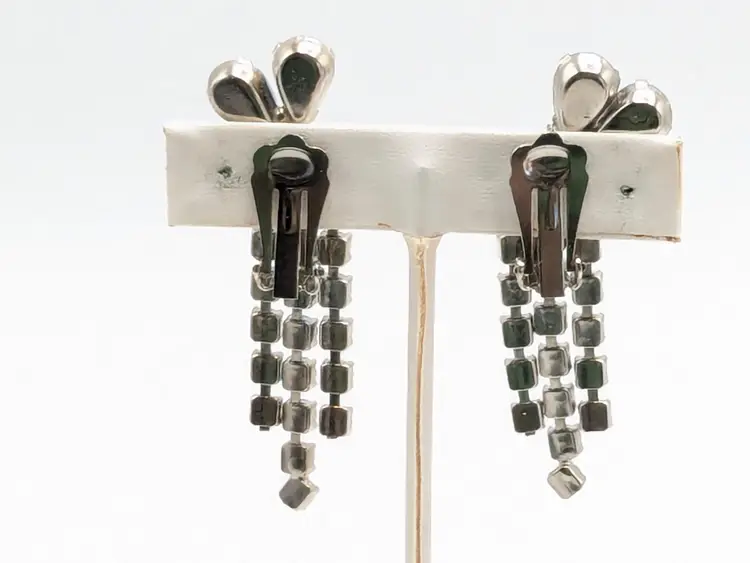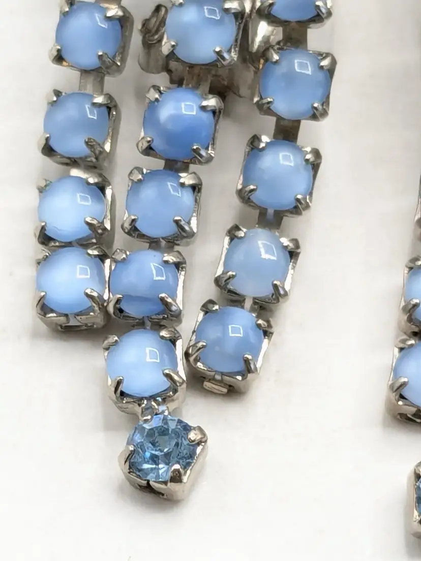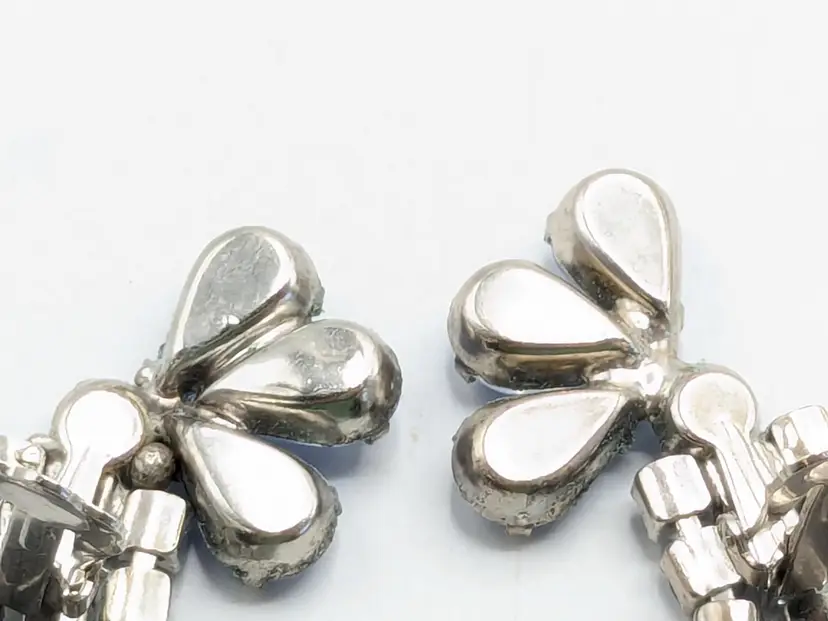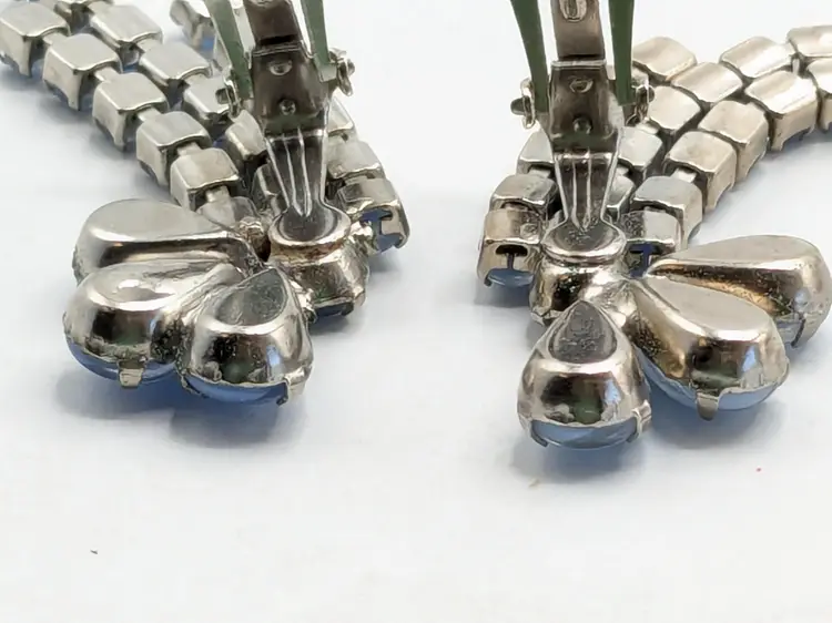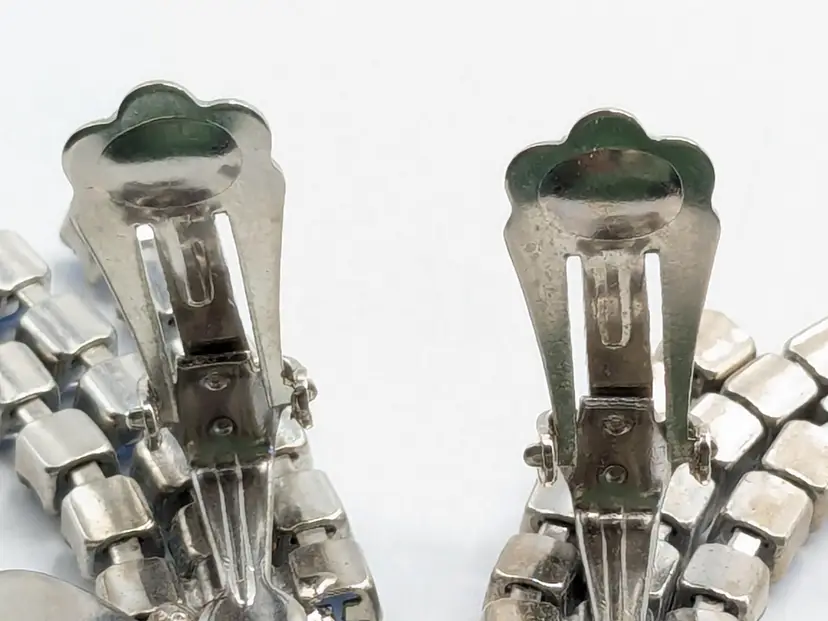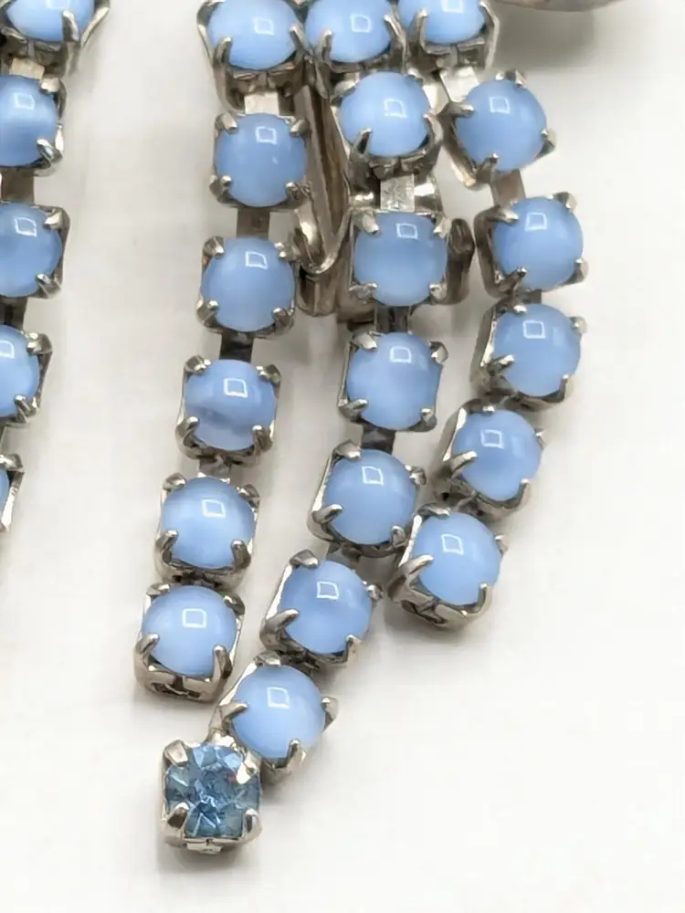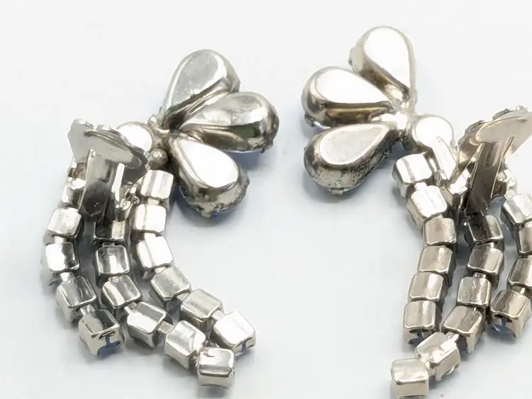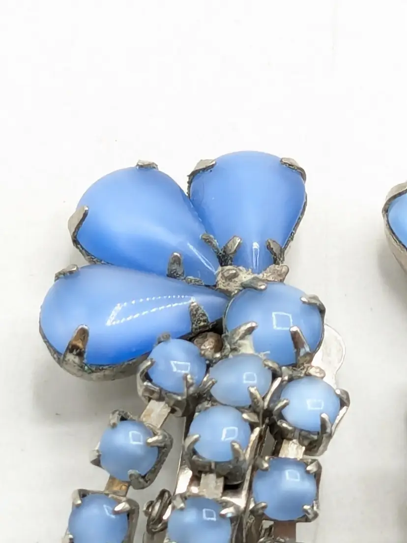 Charming vintage clip-on earrings featuring cascading blue rhinestones in a floral design. Good condition with secure clips. Measures 2 3/8" in height and 1" wide. (EN2)