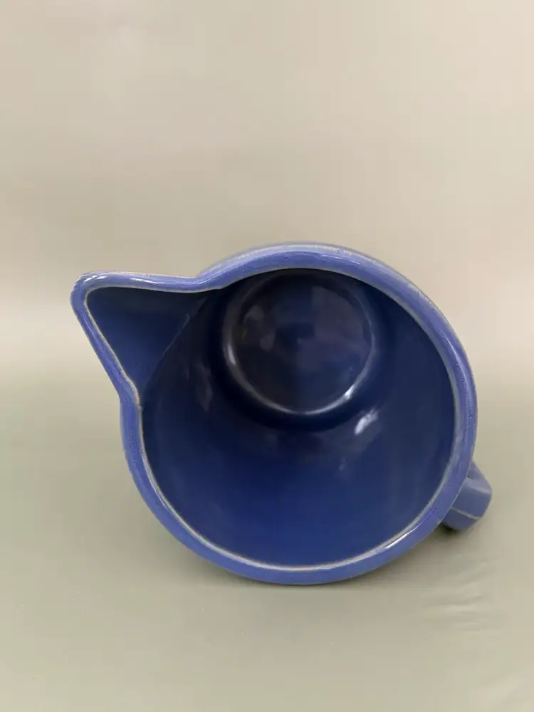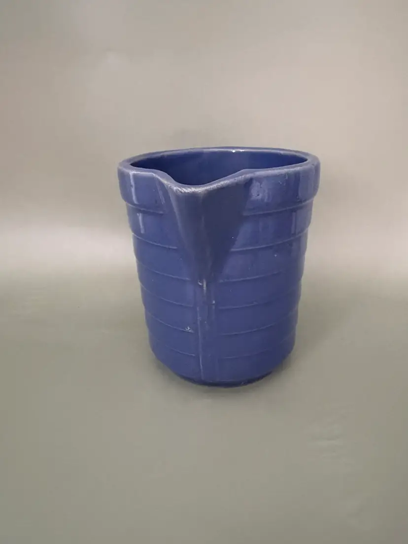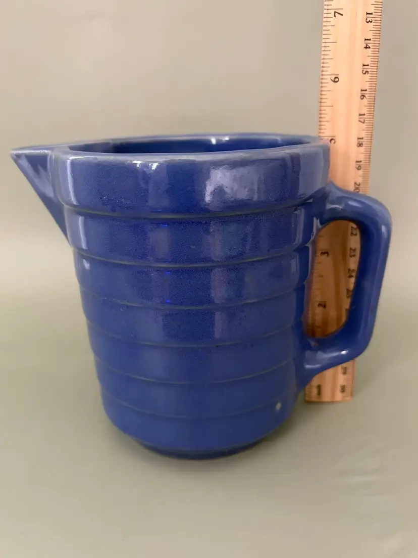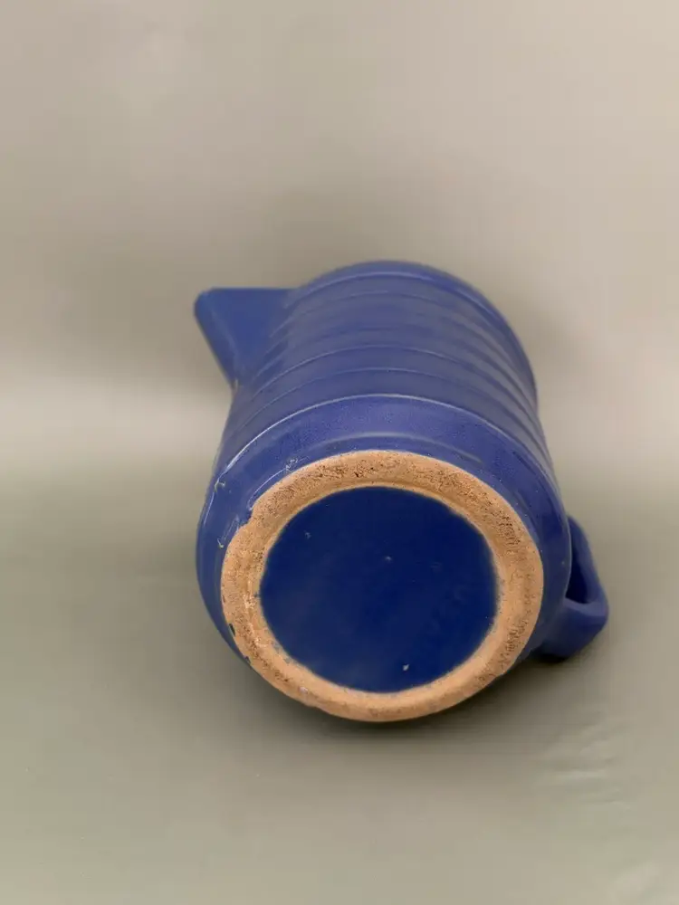 It features a distinctive ribbed or ringed design and a dusty blue glaze. The pitcher is marked " USA" on the bottom. This style of utilitarian American art pottery dates to the 1930s or 1940s.
