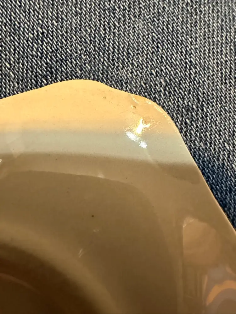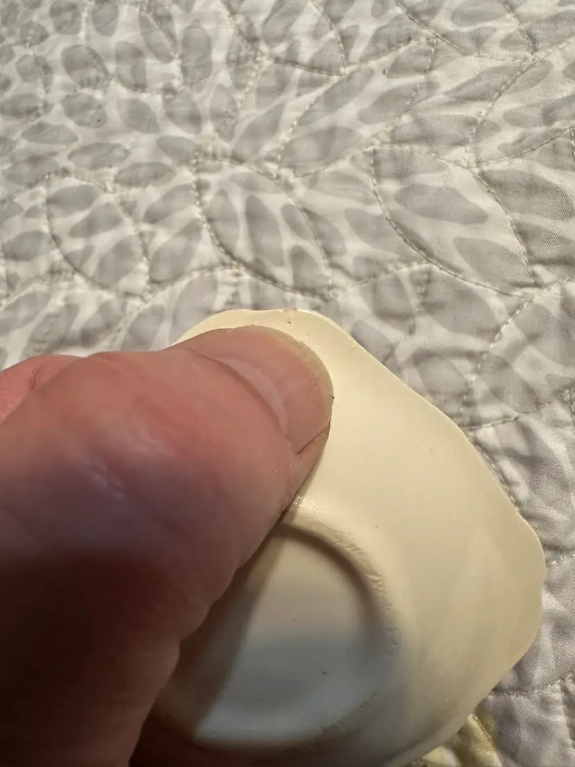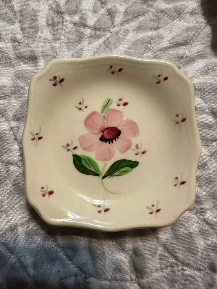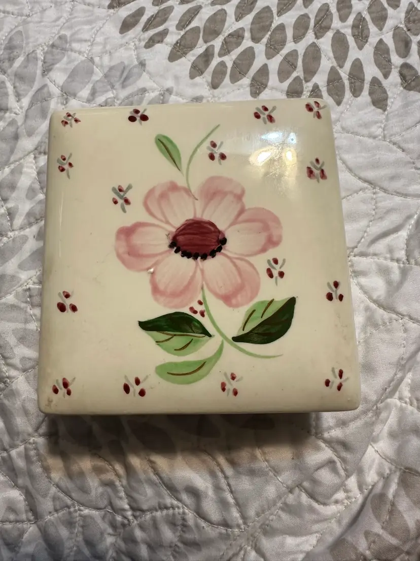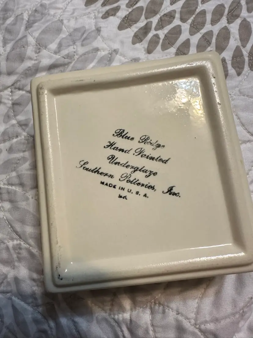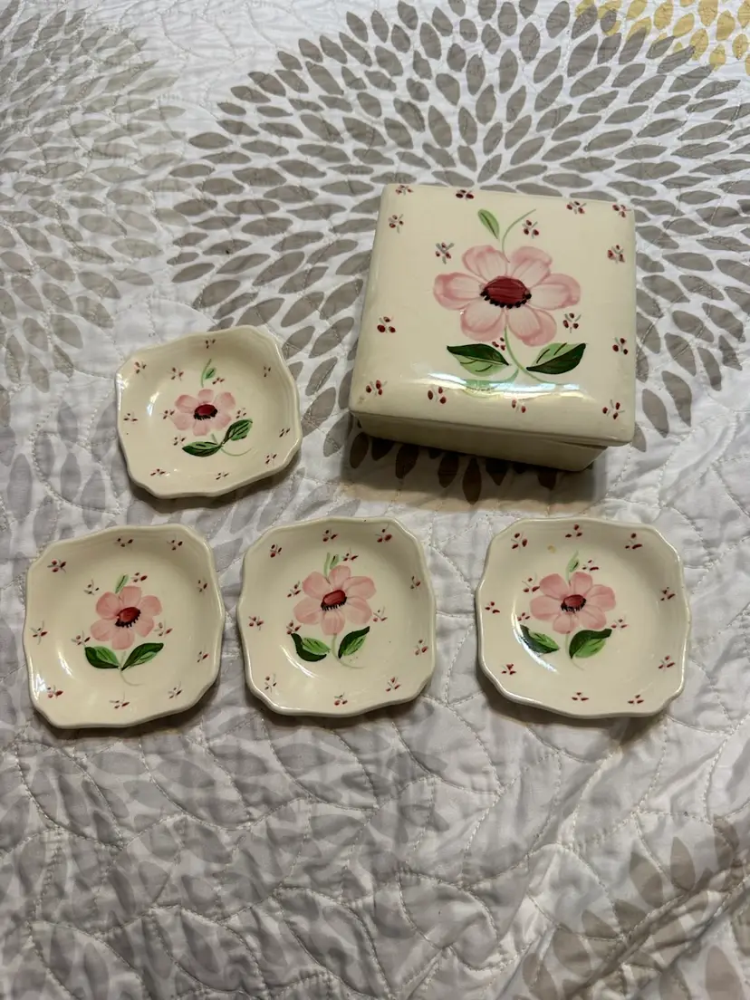 So lovely. Hand painted American pottery. Box is about 4 1/8” square by just under 2” tall. Ashtrays are about 3” square. There is the tiniest flea bite on the underside of one of the ashtrays. Please see photos.